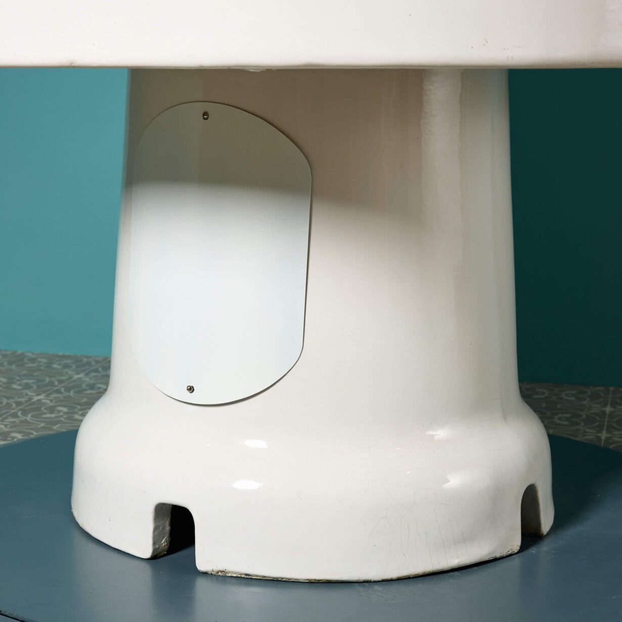It is made from glazed stoneware and has a nickel-plated brass riser to the centre, the water designed to drain away at the base of the riser. Freestanding, the large round basin sits upon a pedestal base with two access plates to either side.