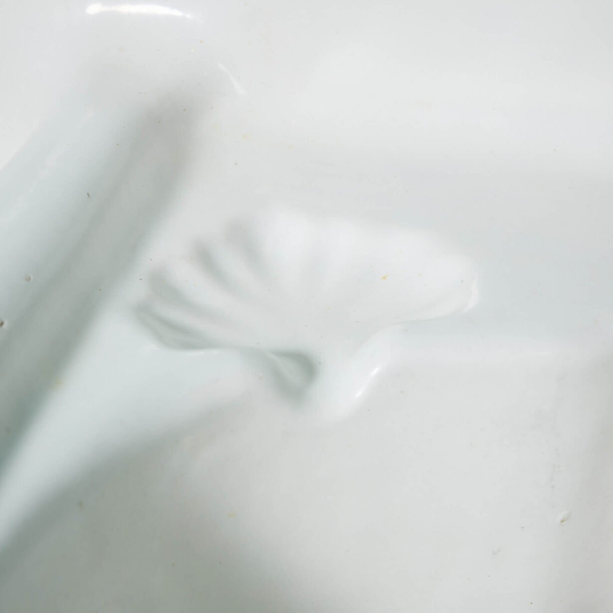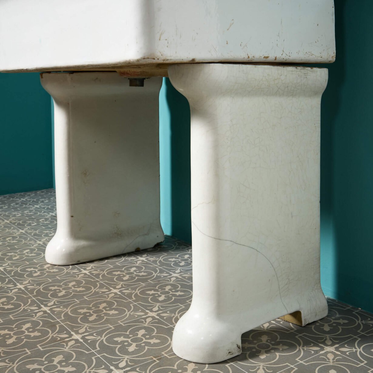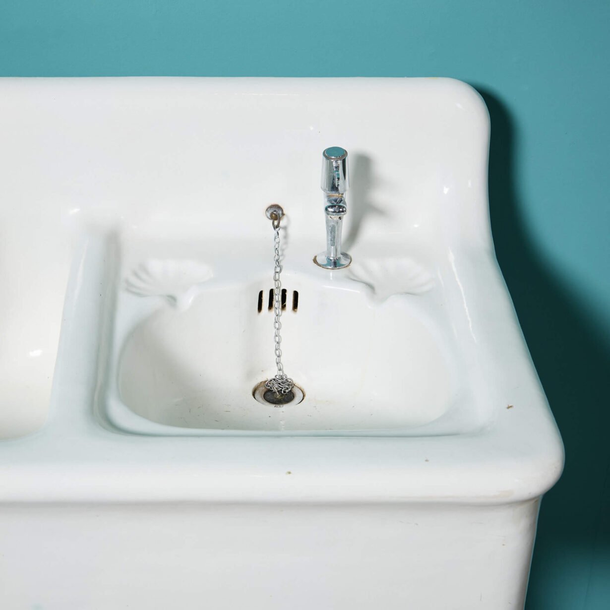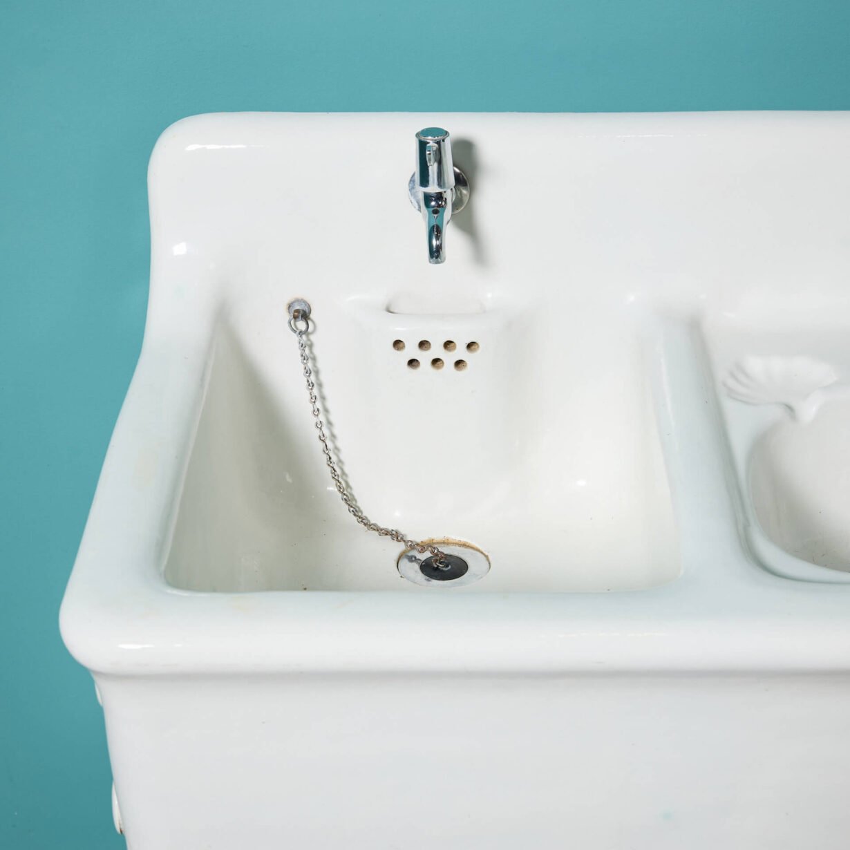A shell patterned soap holder is moulded into the curved basin with an offset tap. This is a unique pairing of a utility and handwashing sink in one large unit. Presented atop period correct legs, this would stand proudly in a boot room or utility in an any style of property.