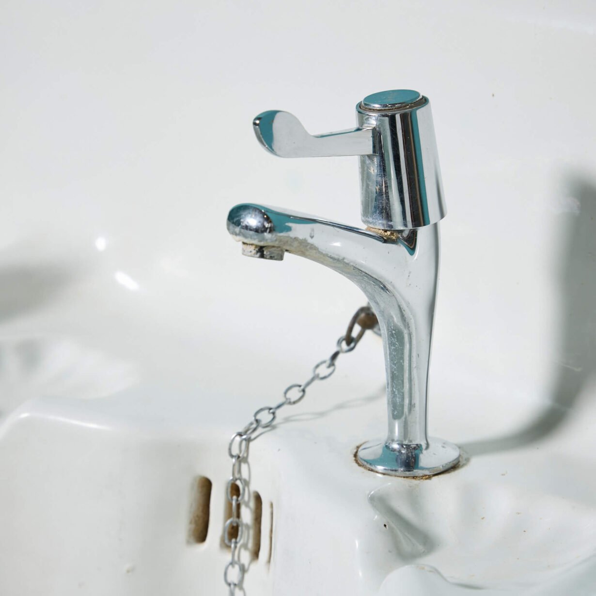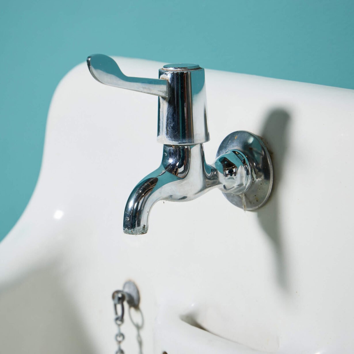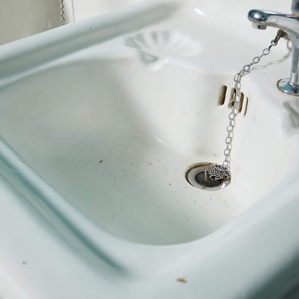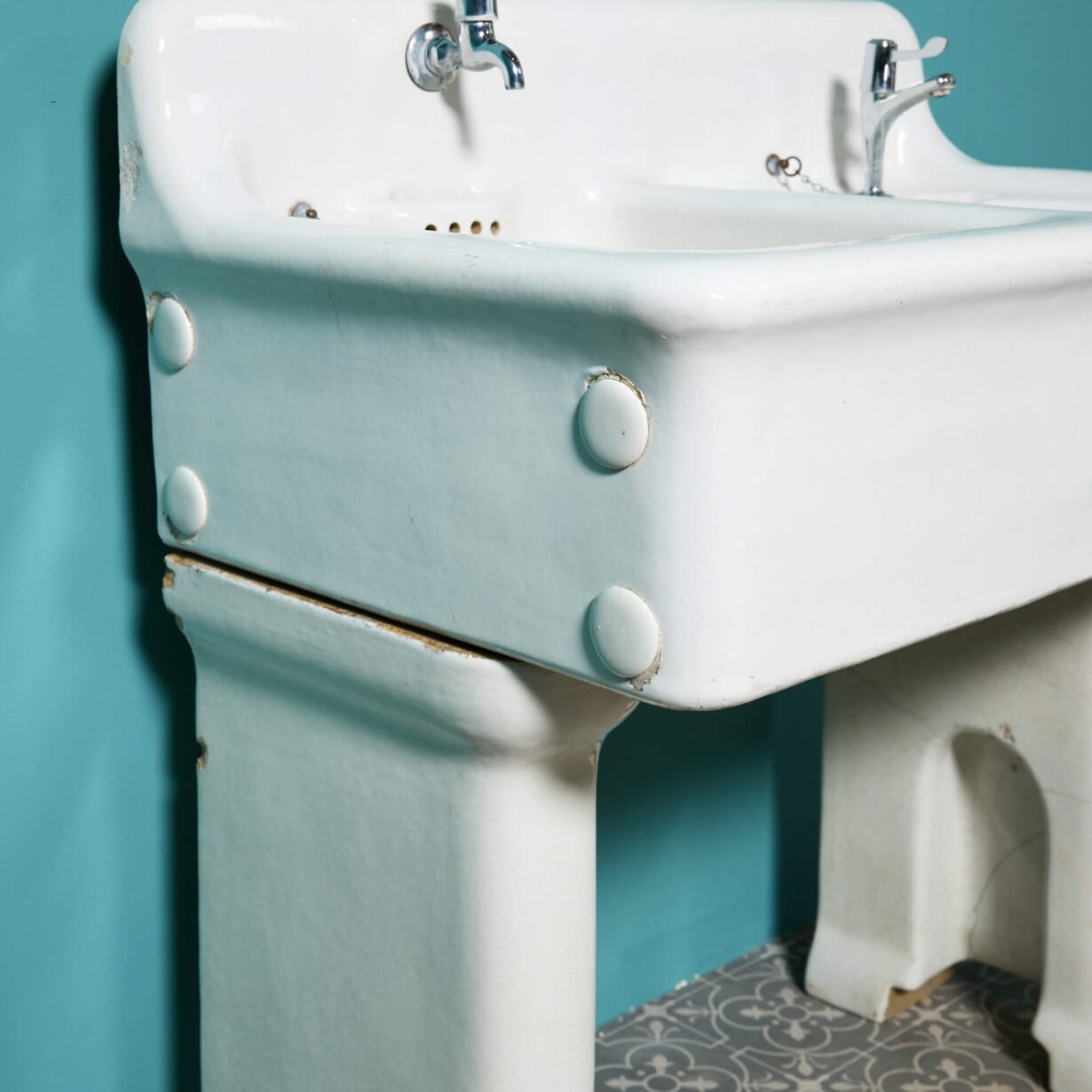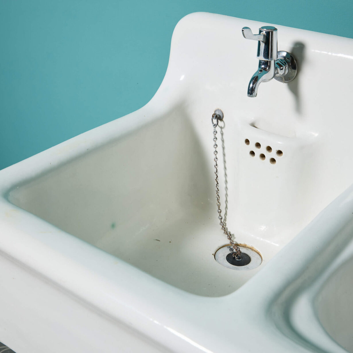 This unique laundry basin has two distinct sinks. On the left, is a deep Belfast style sink with a high tap and circular waste holes. The utilitarian style of this practical and deep sink is complimented by the shallow bowl on the right.