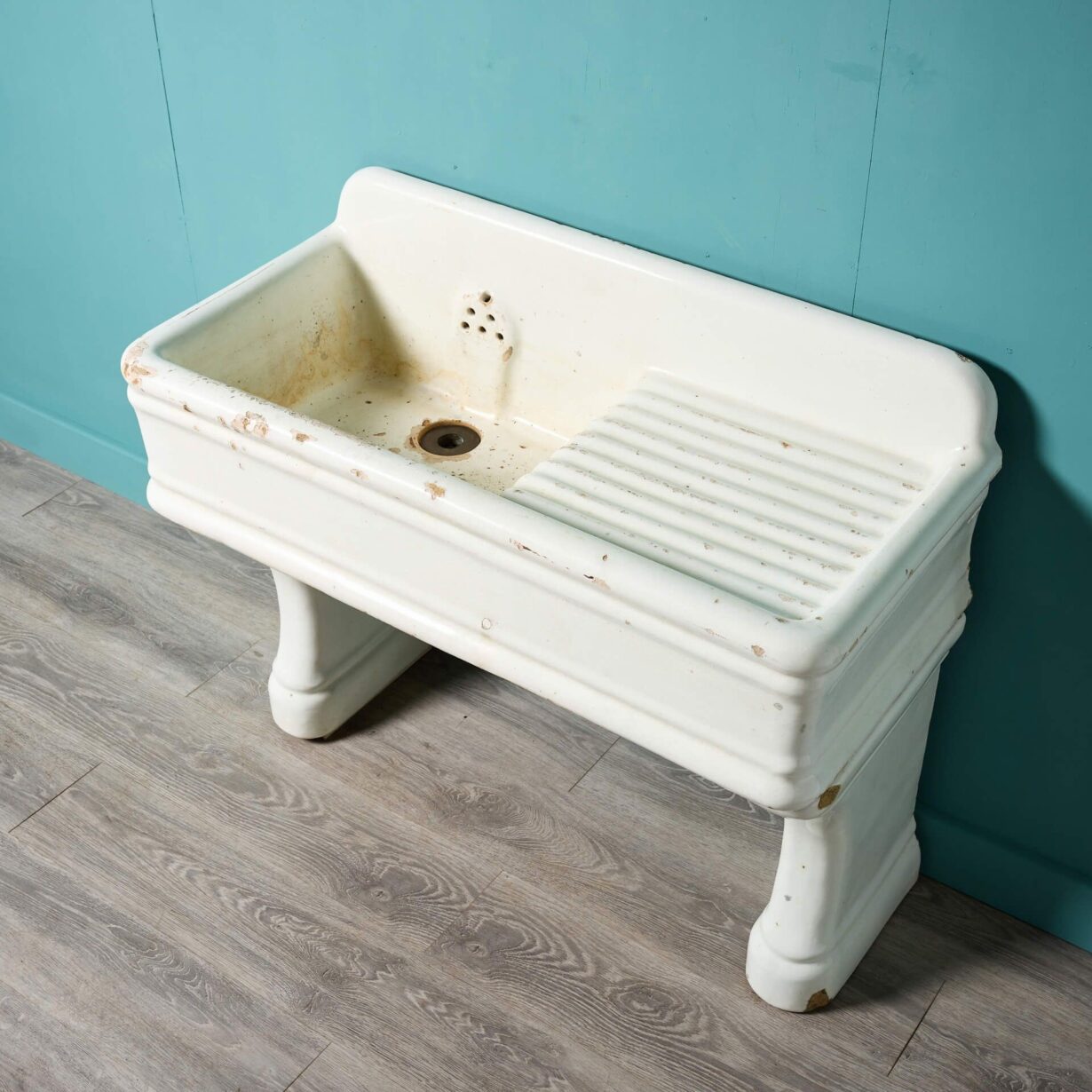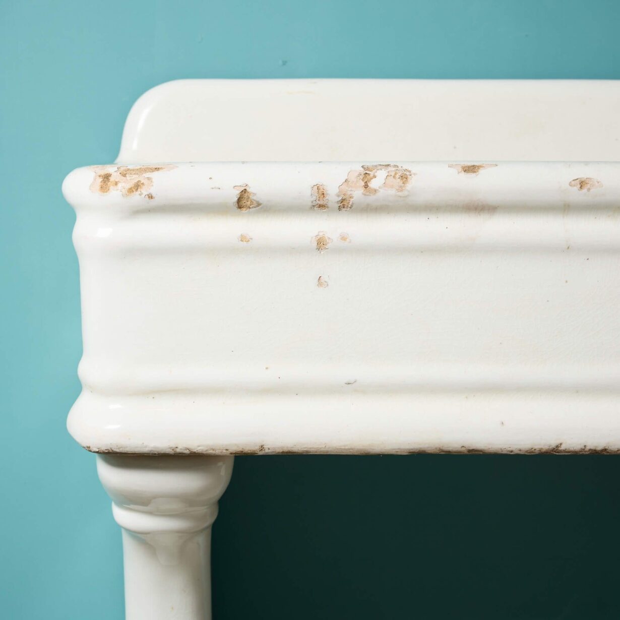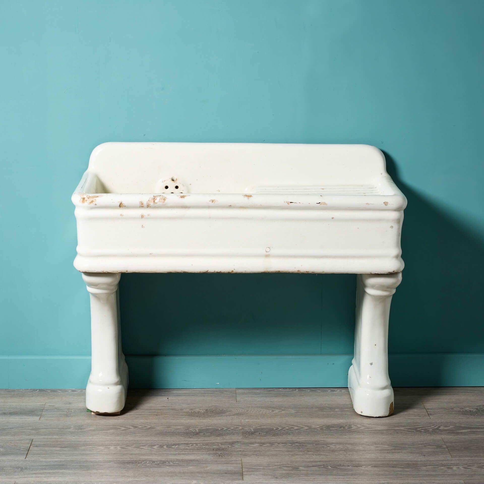 back to topA large Victorian glazed stoneware utility sink on matching ceramic legs, circa 1890. This antique sink has a charming, distressed finish that offers a glimpse into its history. Perhaps it was once a utility or slop sink in a large English country house with its integrated drainer and decorative moulded front.