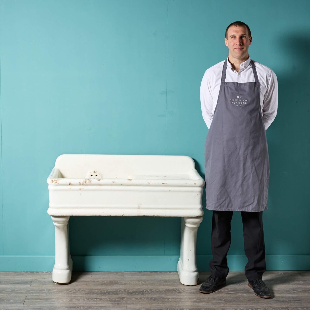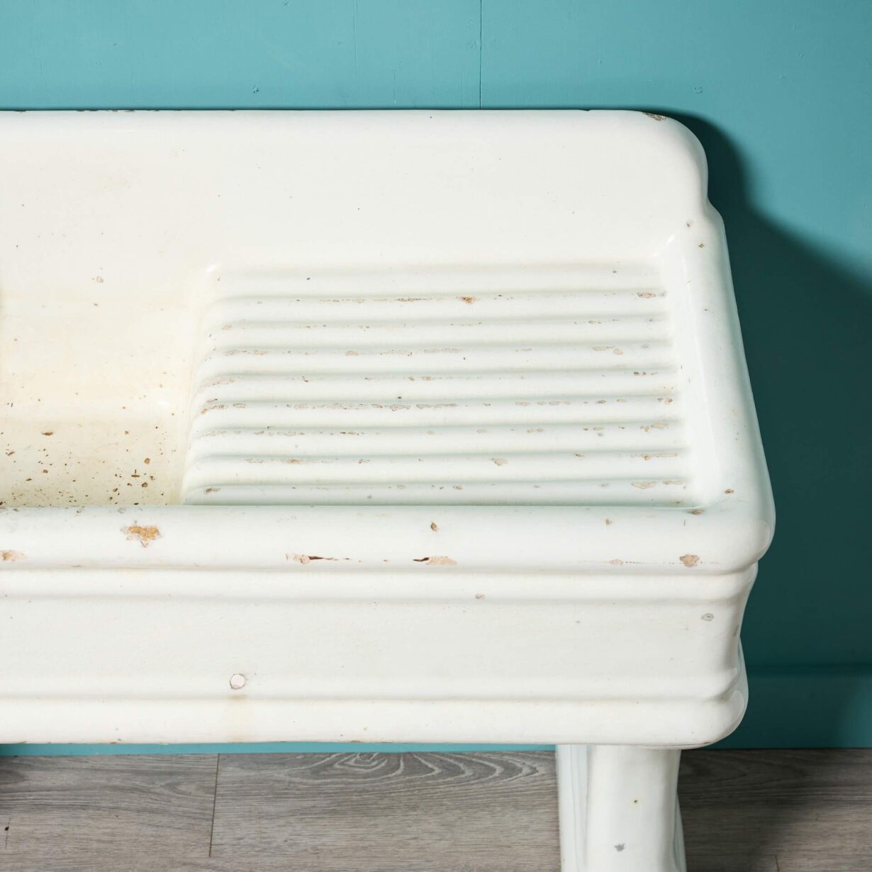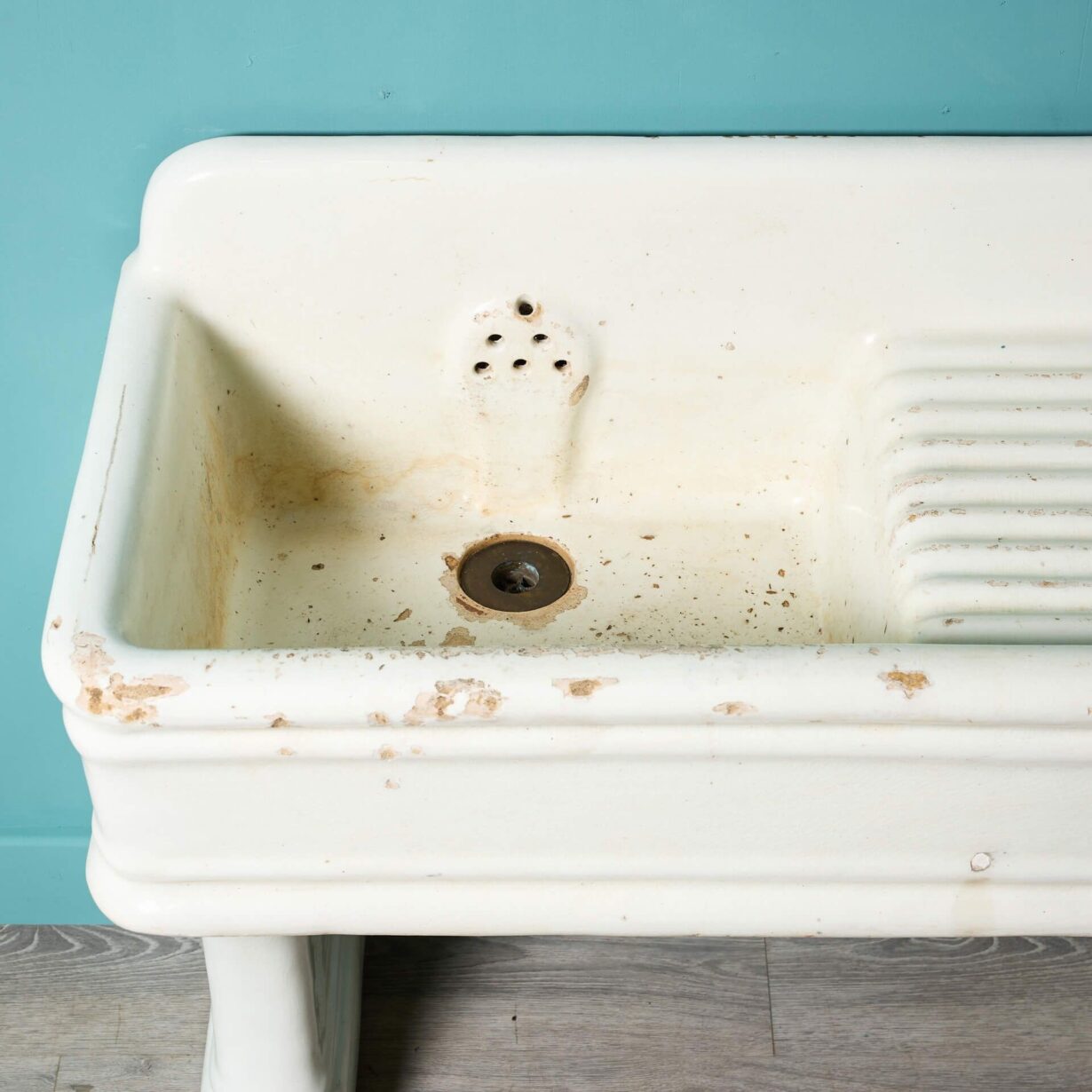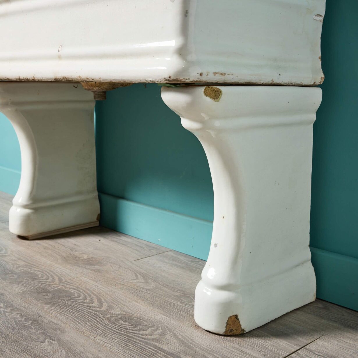 back to topA large Victorian glazed stoneware utility sink on matching ceramic legs, circa 1890. This antique sink has a charming, distressed finish that offers a glimpse into its history. Perhaps it was once a utility or slop sink in a large English country house with its integrated drainer and decorative moulded front.