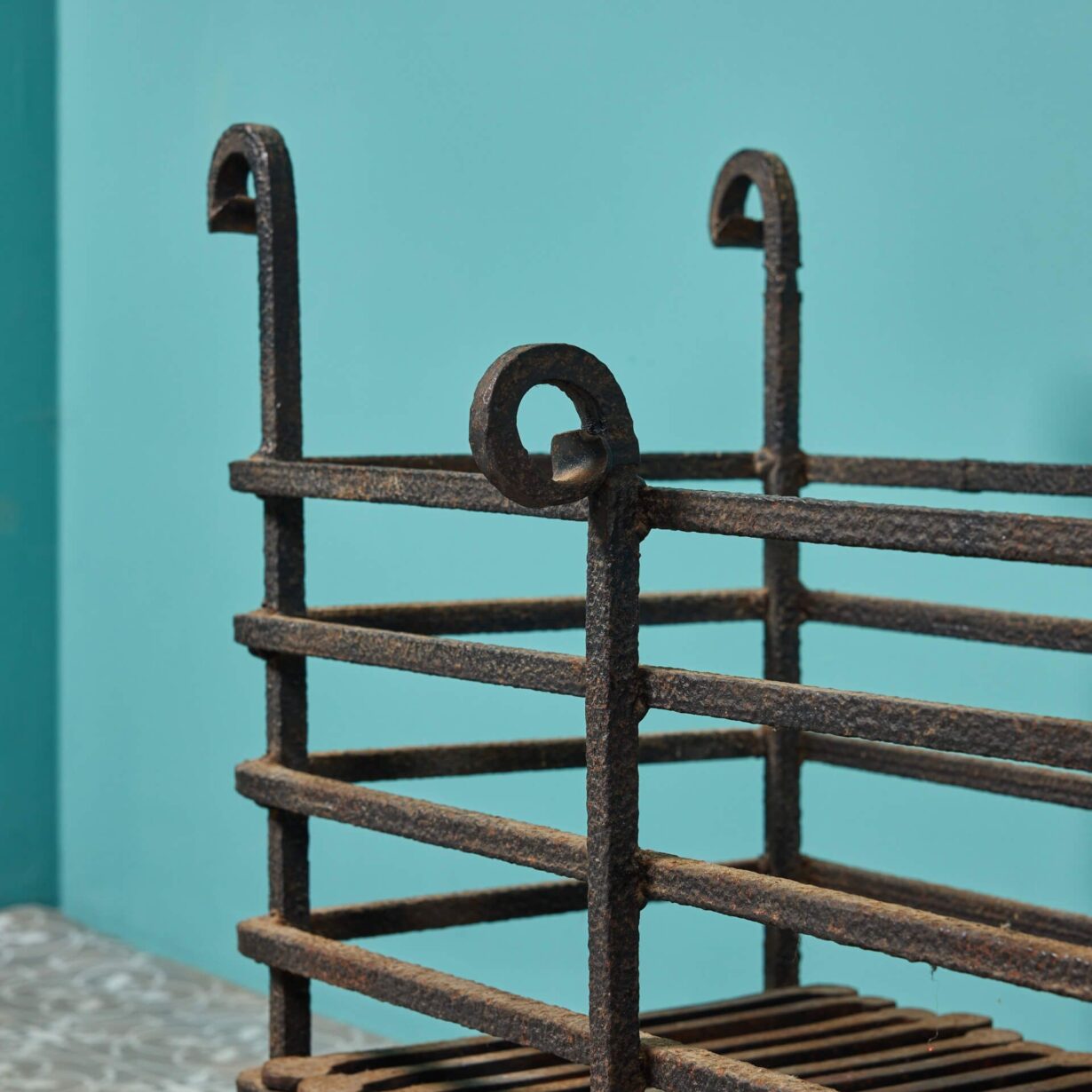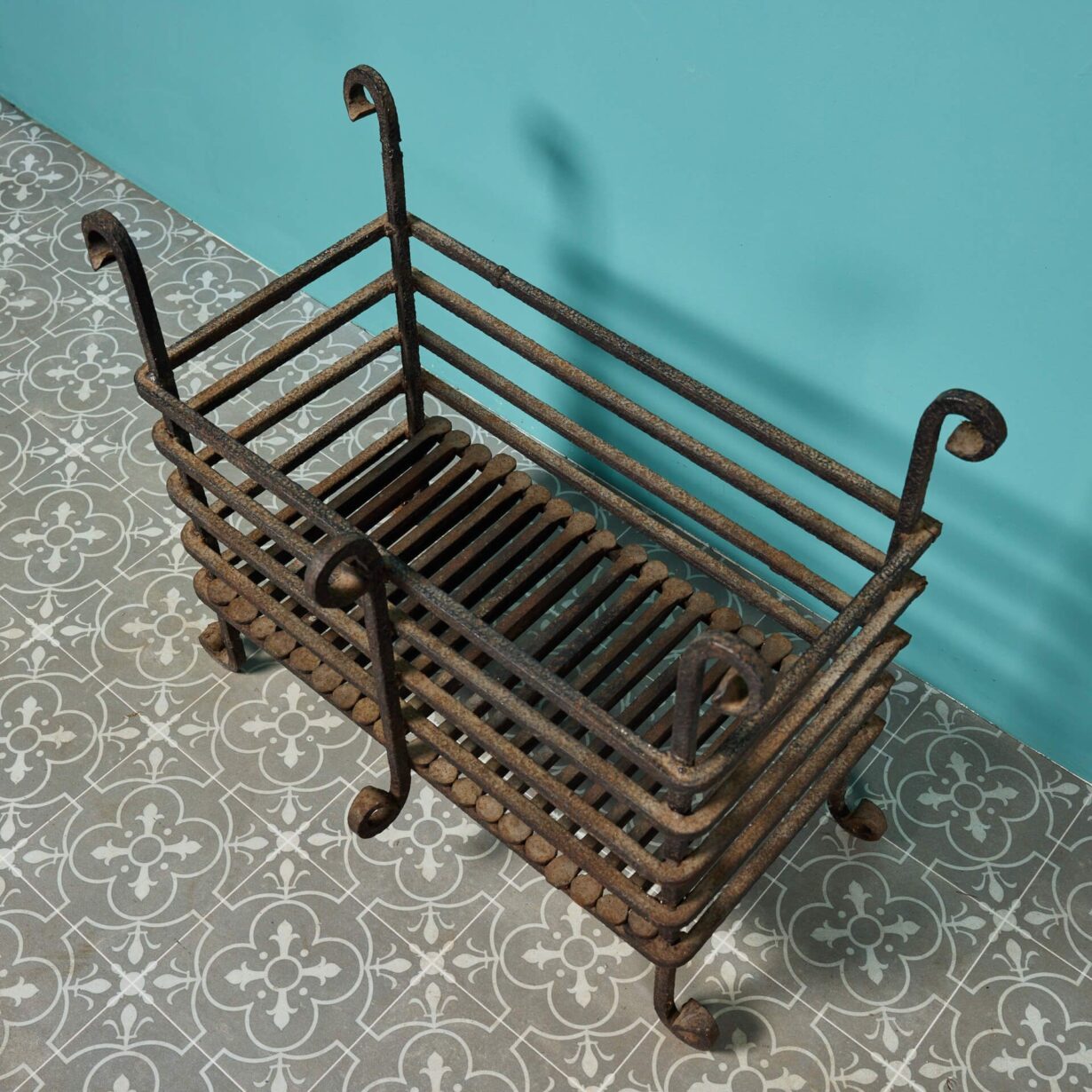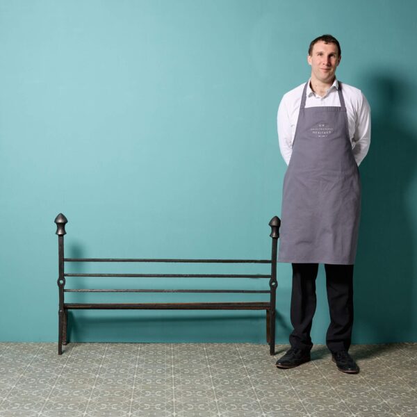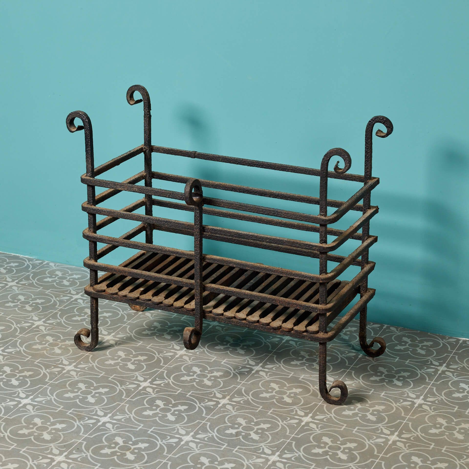 back to topA large Victorian revival wrought iron fire basket circa 1920. This reclaimed fire grate has been crafted at the hand of a talented 20th century blacksmith and features a generously sized basket with removable grills and simple scrolling details to the feet and finials.