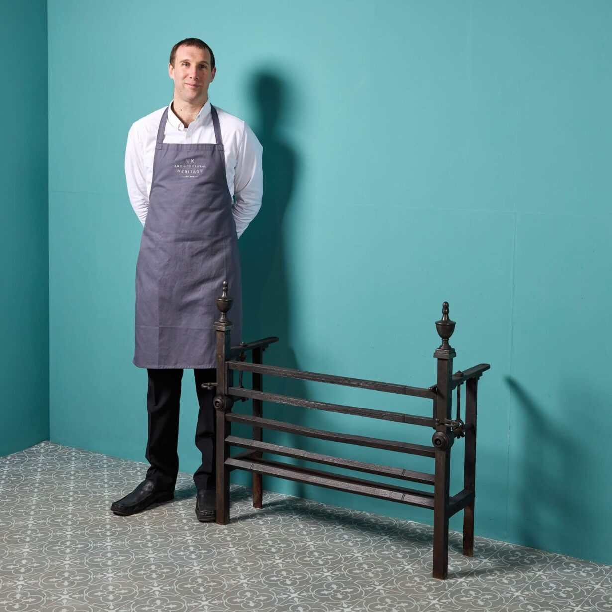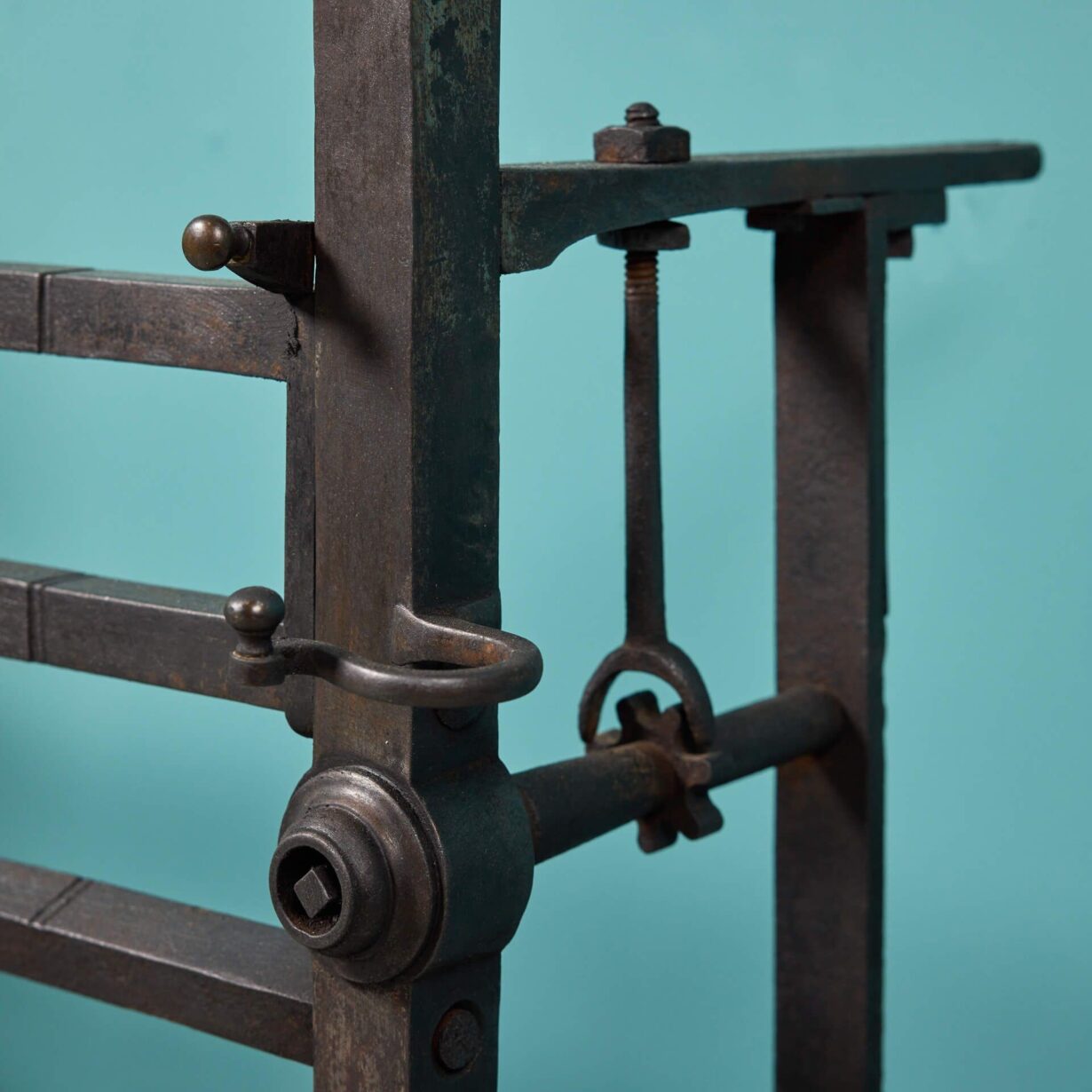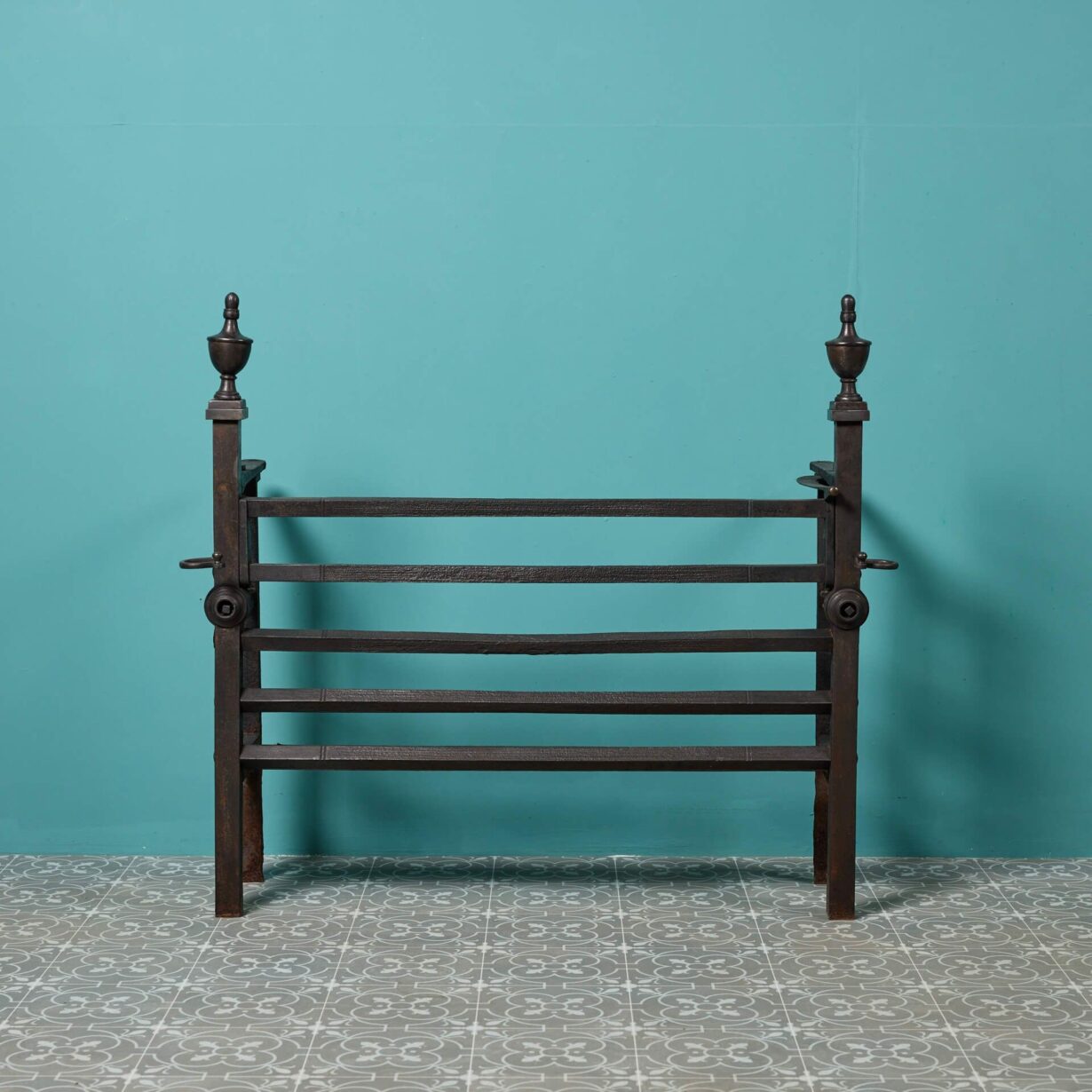 Made in wrought iron at the hand of a talented 18th century blacksmith, this fire grate is ornamented with a pair of small urn finials to the top – classically seen on fire baskets of this era. At the front, the top horizontal bar tilts down by a sophisticated mechanism to create a flat ledge.