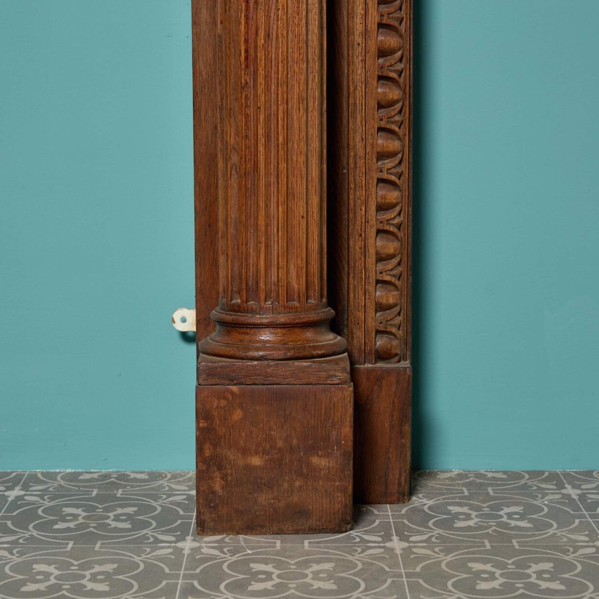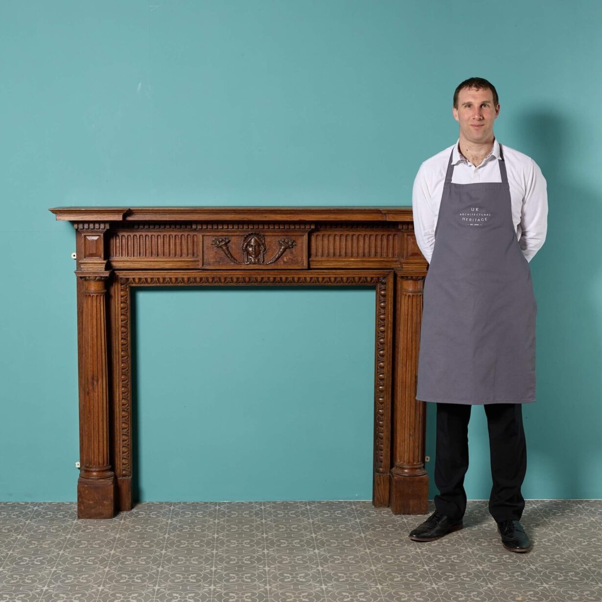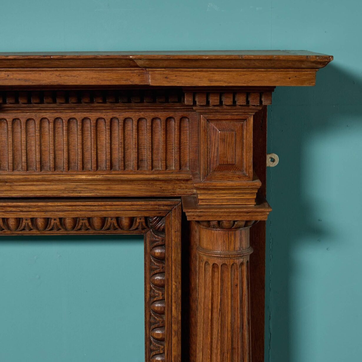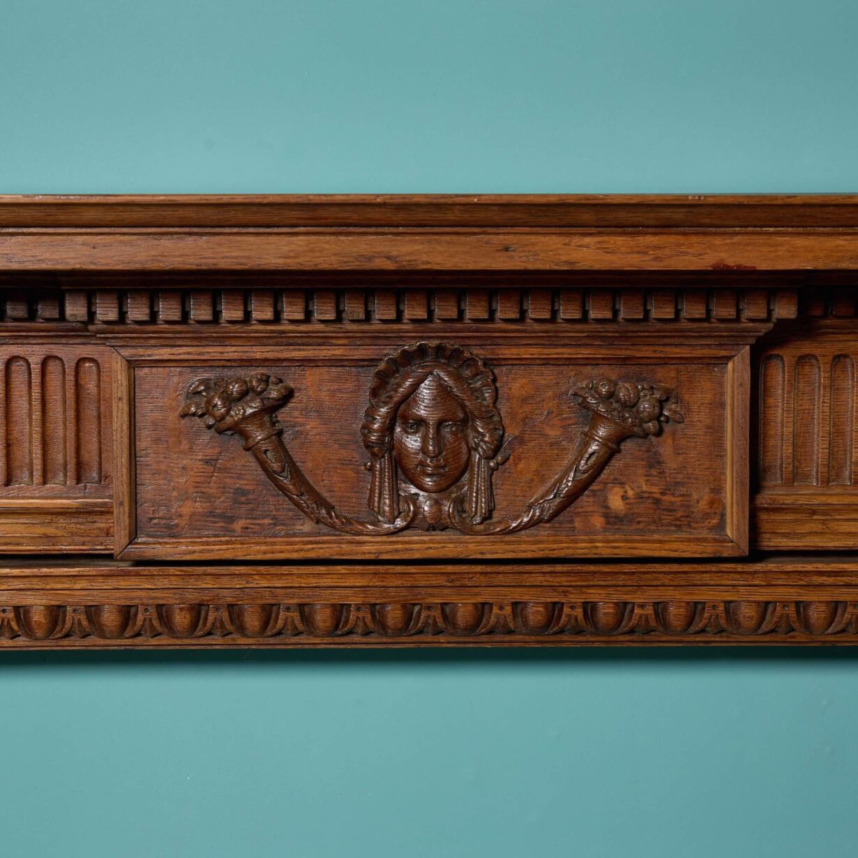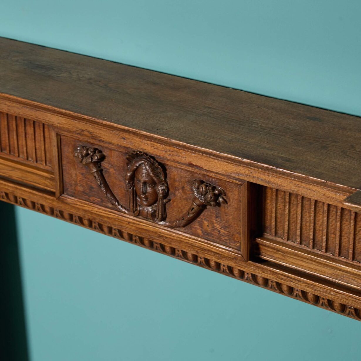 back to topWith its beautifully hand carved tablet and intricate details, this wooden fireplace in the Georgian style is a spectacular surround for a large room. It features a rich caramel brown colour that instils a space with warmth and highly decorative carved details throughout. A breakfront shelf, fluted columns and egg and dart detailing around the opening are synonymous with Georgian styles. On the frieze, a female mask is carved between two horns of plenty, also referred to as cornucopias. These are said to symbolise prosperity and abundance according to Greek folklore and perhaps tells us something more about the provenance of this oak fireplace surround… Whatever it’s story, this antique oak fireplace becomes a feature of a space with its superb craftsmanship and hand carved details.