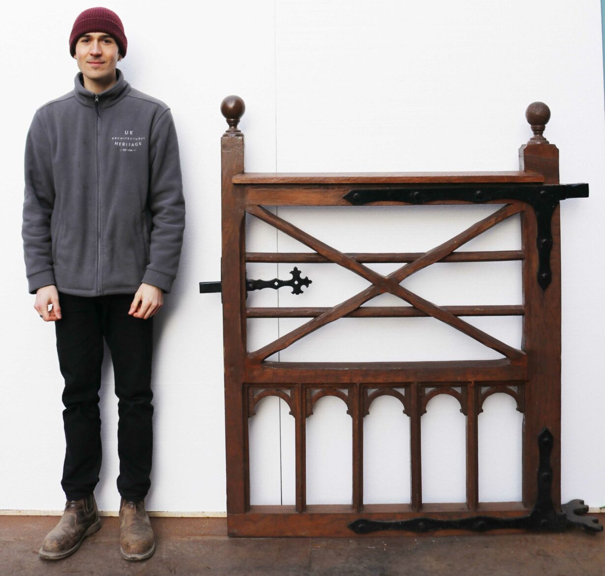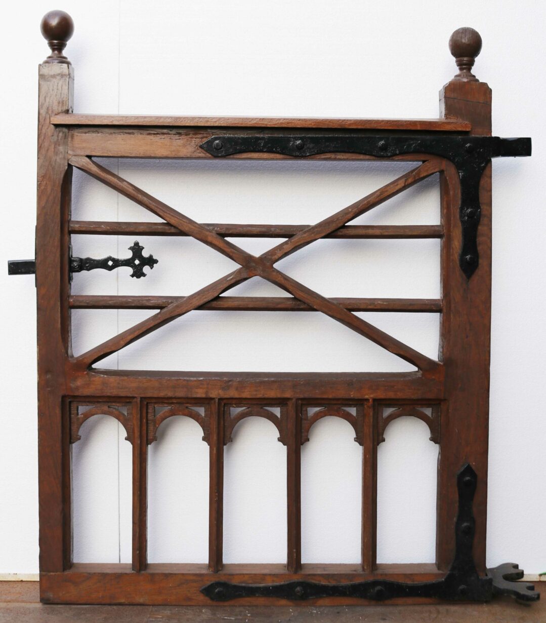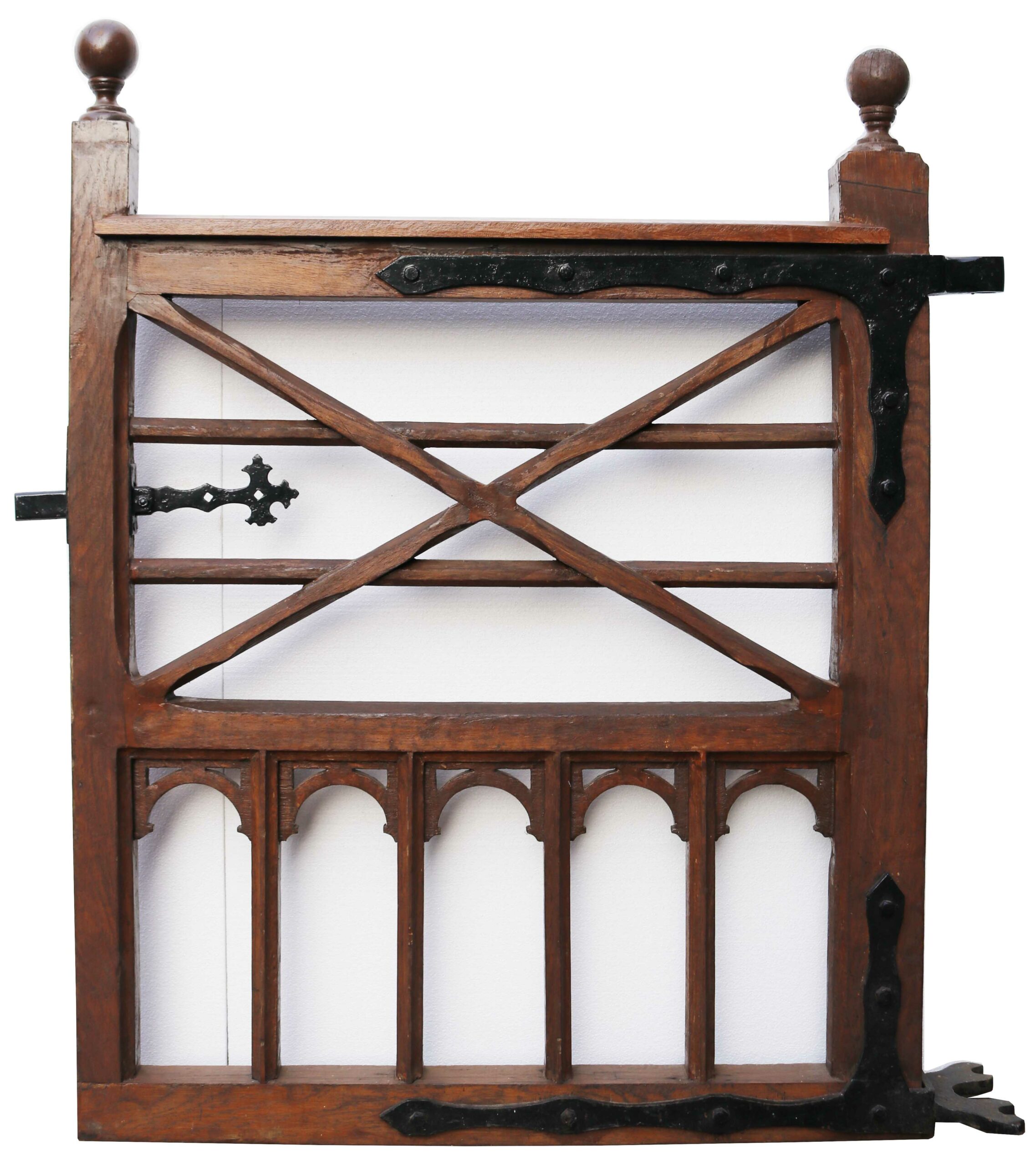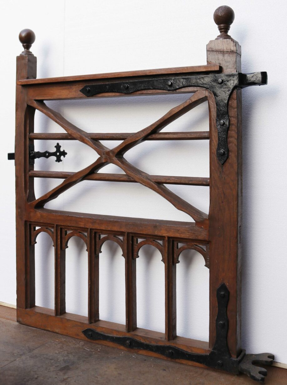 back to topLate Victorian Gothic Style Oak Gate. A beautifully crafted oak gate with a decorative iron latch and hinges, finished in a brown wood preserver.