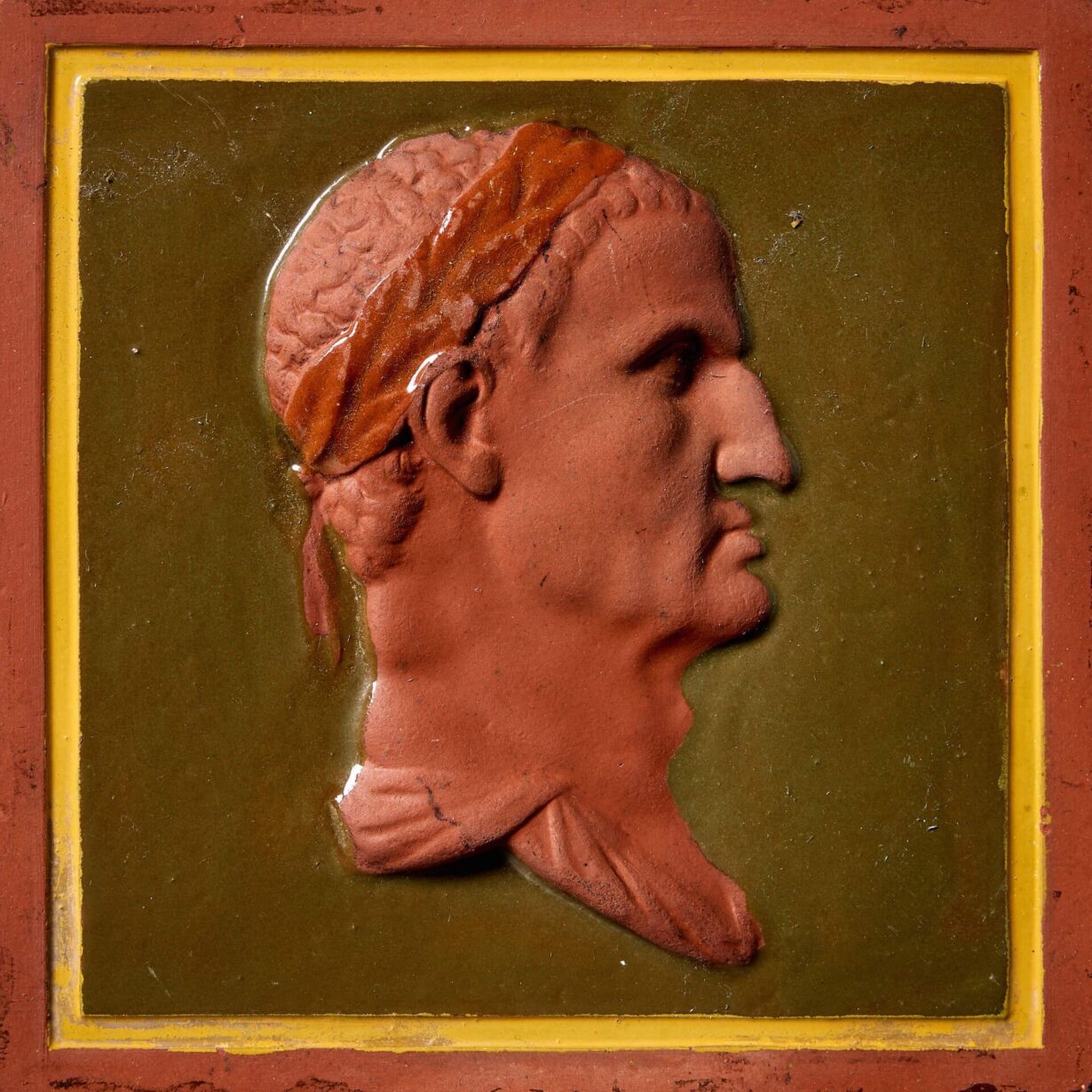 back to topA decorative 6-inch dust-pressed terracotta tile by Maw & Co. (stamped) decorated with a neoclassical profile portrait in relief before an olive green backdrop and yellow border.