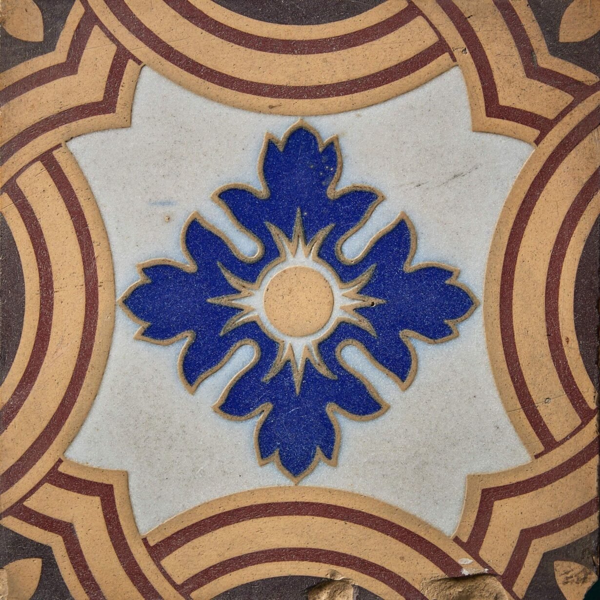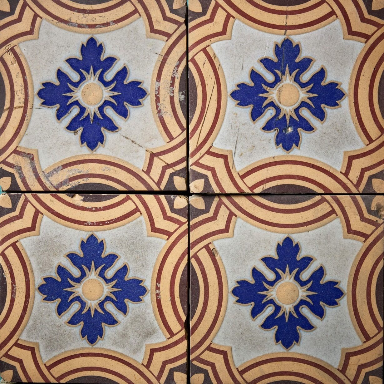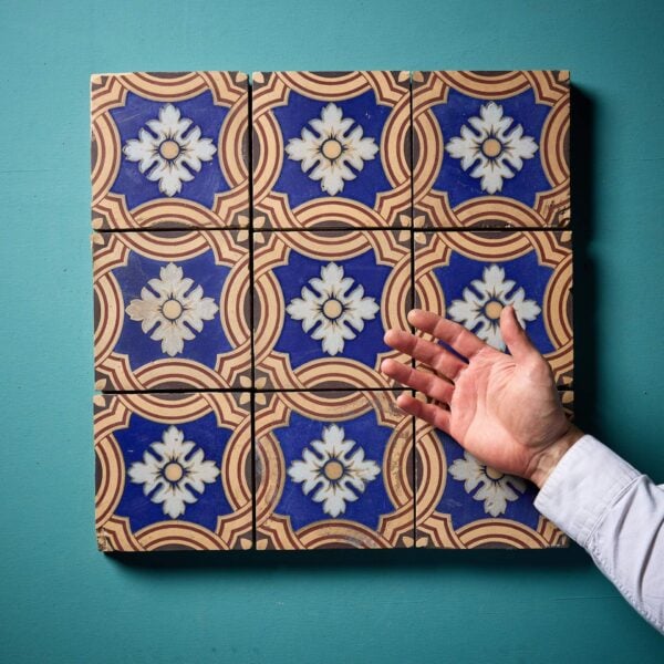 Supplied loose, these 6-inch tiles are reclaimed and as such have a characterful, timeworn look with scuffs and crazing here and there that only enhances the beauty of these striking patterned tiles.