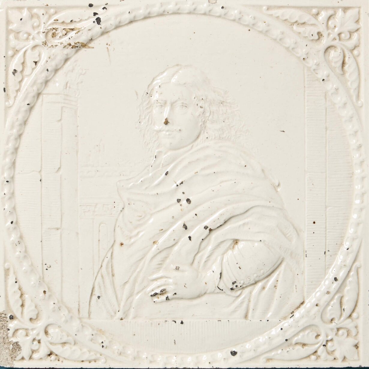 back to topThis Minton Hollins antique tin glaze portrait tile depicting a nobleman from possibly the English civil war. This could make the subject Oliver Cromwell or King Charles II.
