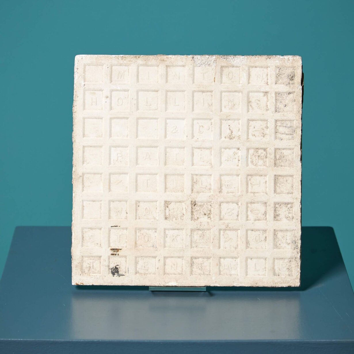 On the reverse, in addition to regular markings found on Minton Hollins tiles of the era, symbols and letters are placed in different orientations between the branding.