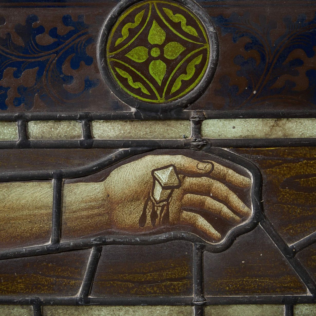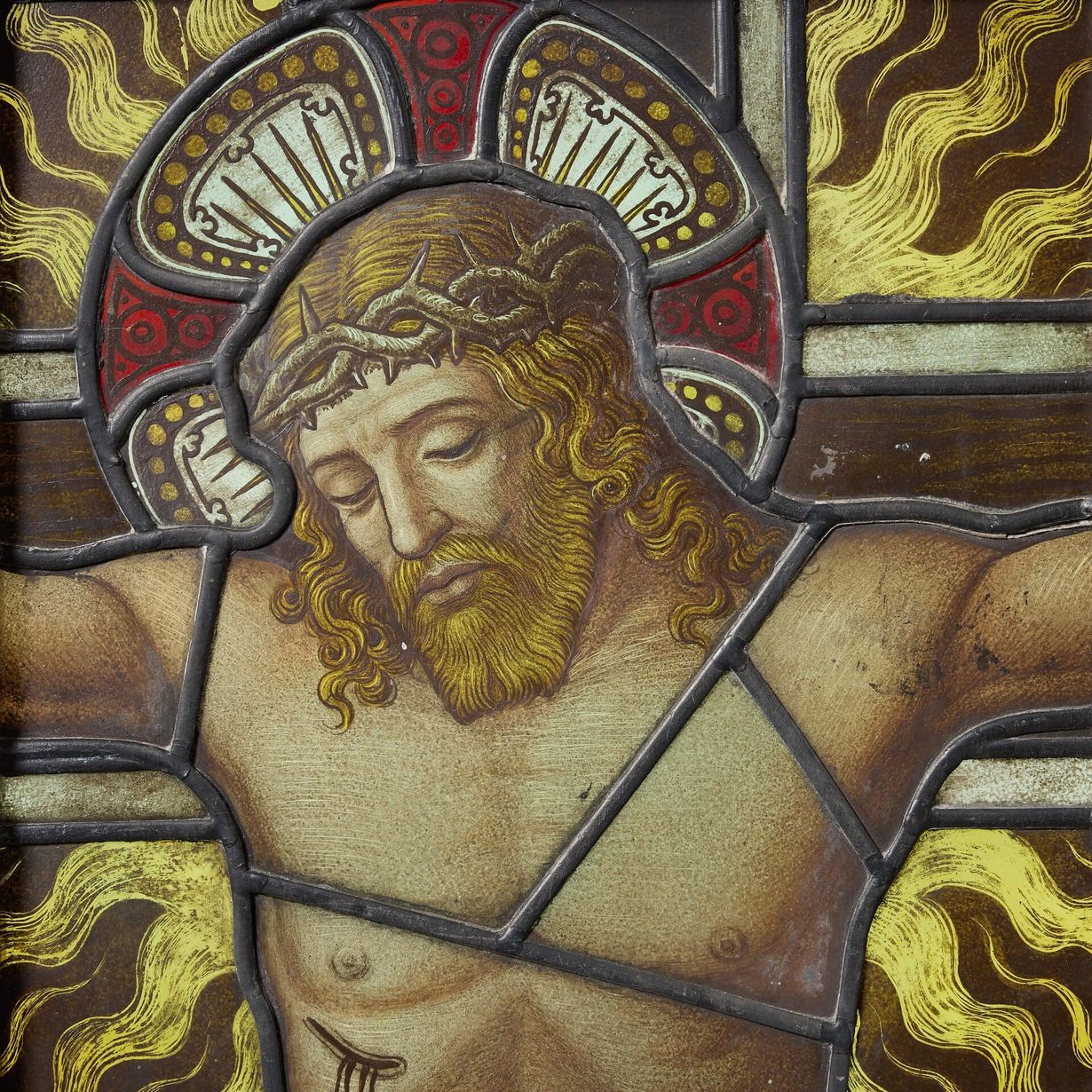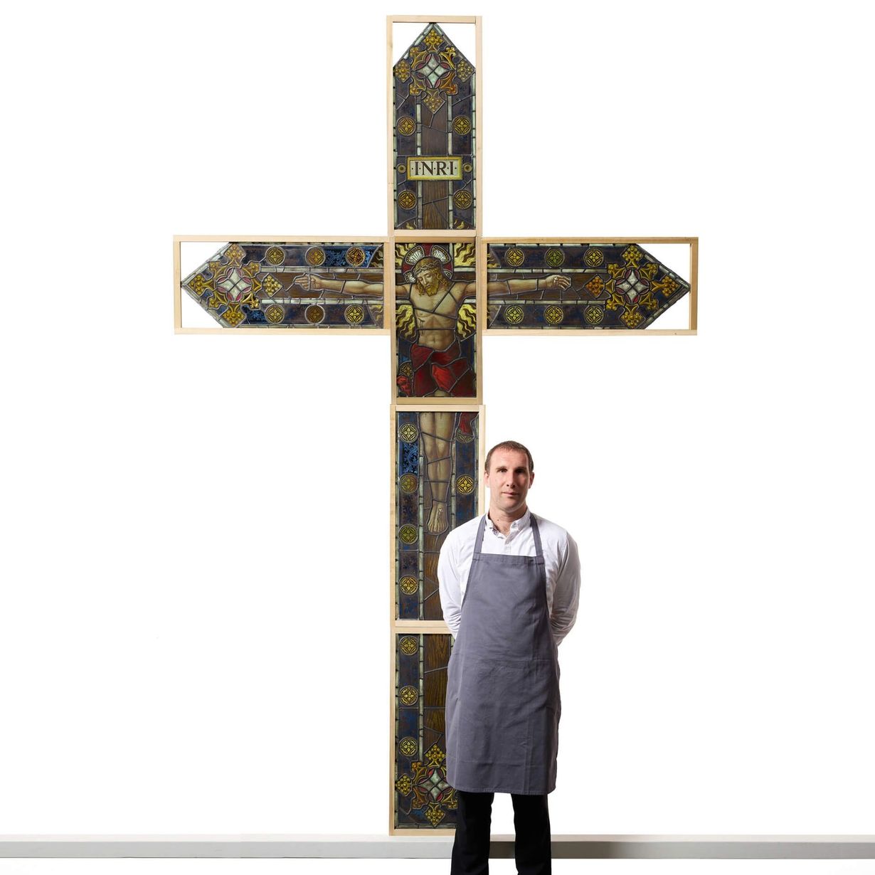 Certain to make a statement in any setting with its sheer scale and size, this reclaimed stained glass cross window is a stunning example of late 19th century glasswork, using a range of coloured and handpainted glass to artistically retell this bible scripture central to Christian belief.