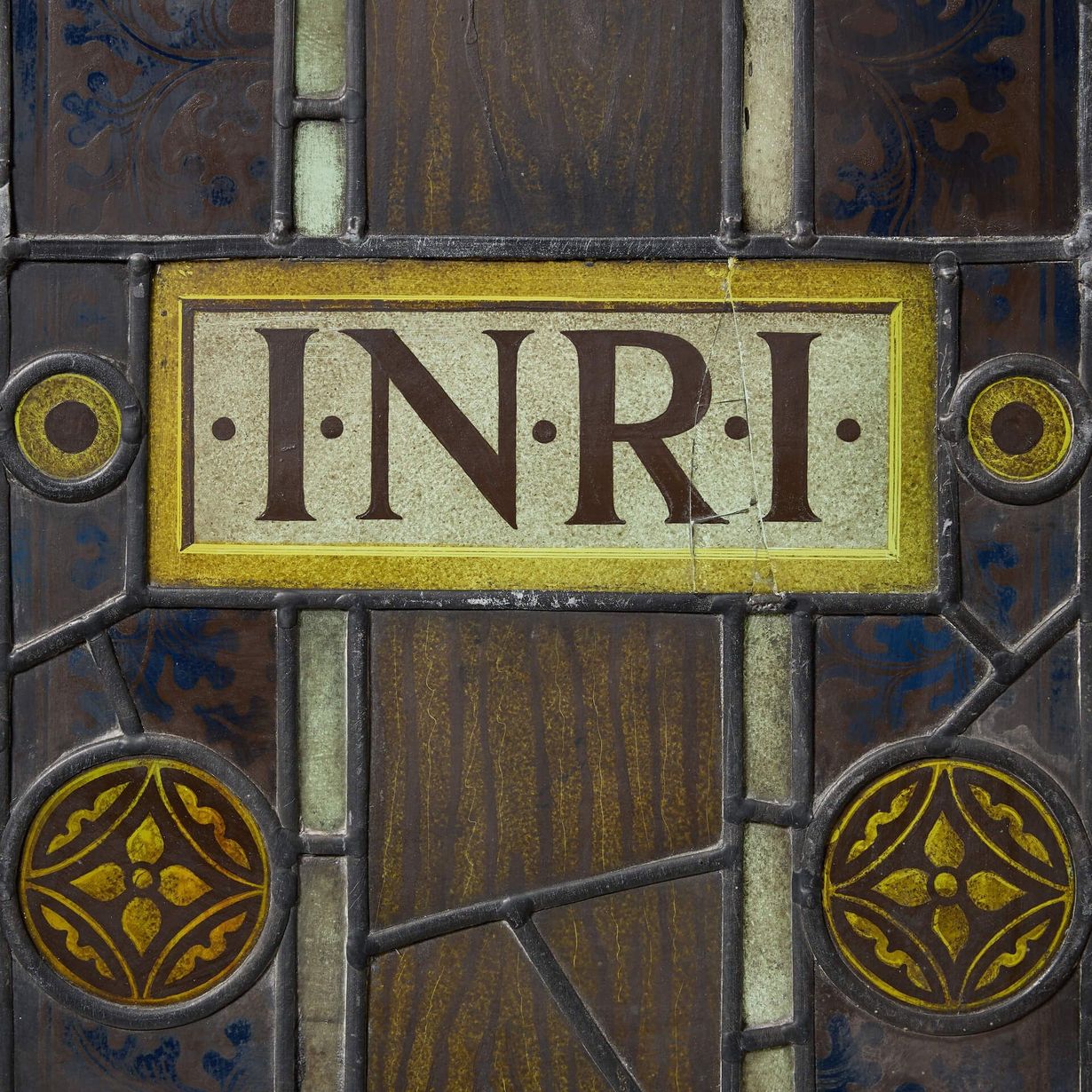 back to topA monumental antique 19th century stained glass crucifixion window depicting Jesus on the cross below the Latin inscription ‘INRI’. This impressive religious stained glass window comprises of 6 individual glass panels, together creating a huge window in the shape of a cross which was likely once situated in an English church or similar religious building.