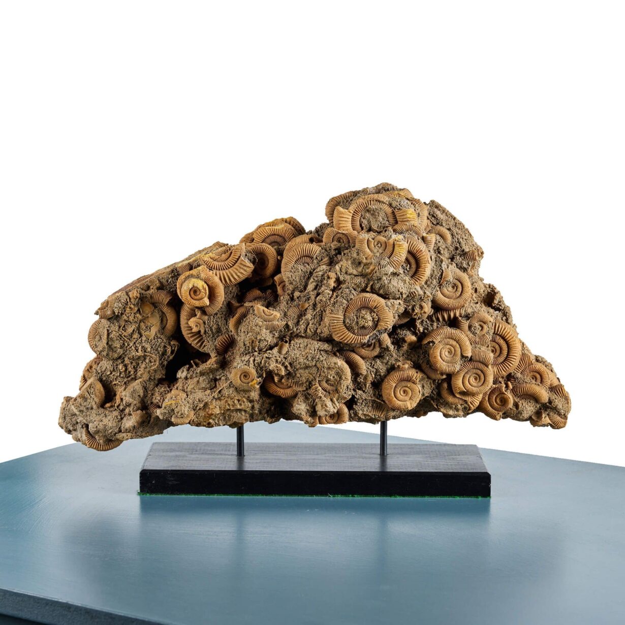 back to topA natural ammonite death bed mounted on a wooden and steel stand, originating from Schlaifhausen near Forchheim, Germany.