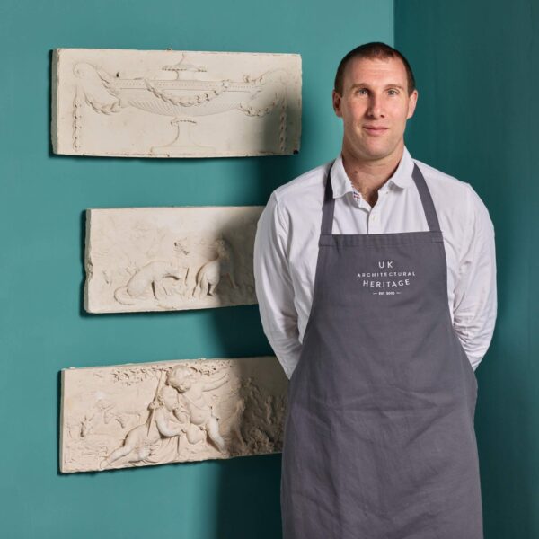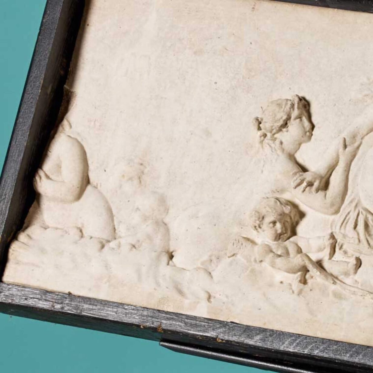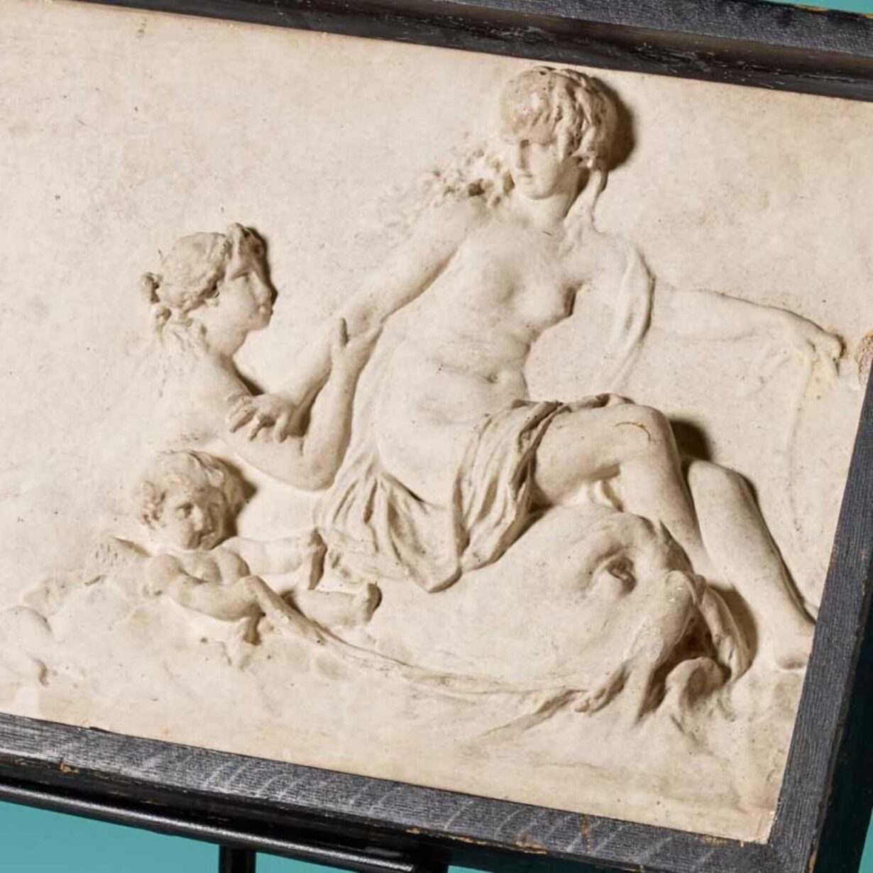 back to topNeo-classical style plaster plaque mounted in a frame. This decorative piece, at nearly 120 years old, has kept the details of its eye-catching classical scene. Unlike others of its likeness, this plaque has a painted timber frame and is mounted onto a steel stand. It could be displayed inside a home ready for visitors to admire. It depicts a mythical creature, with sea lion like features, in cloud-like waves, while a woman reaches down to another, and a third character hides away. A baby sits on top of the waves in awe of its sea lion friend carrying them on a journey across the waves.