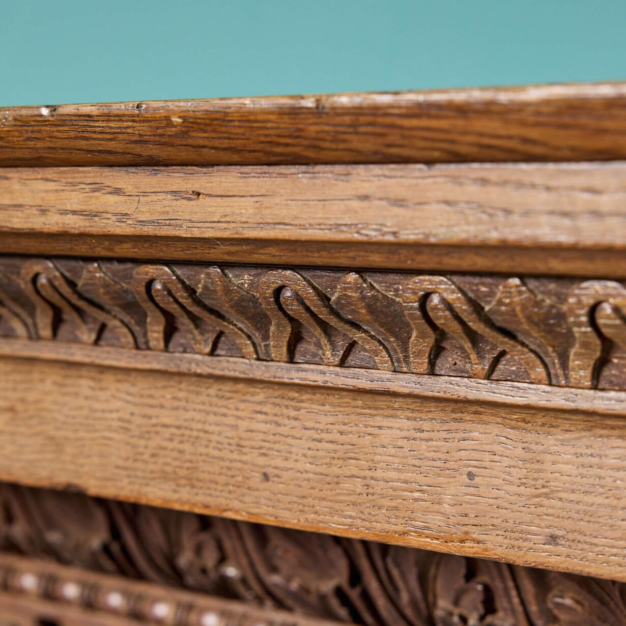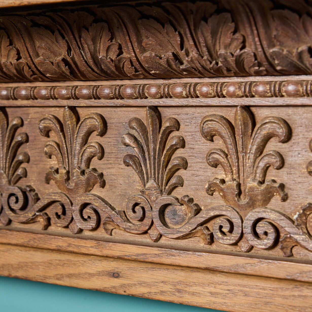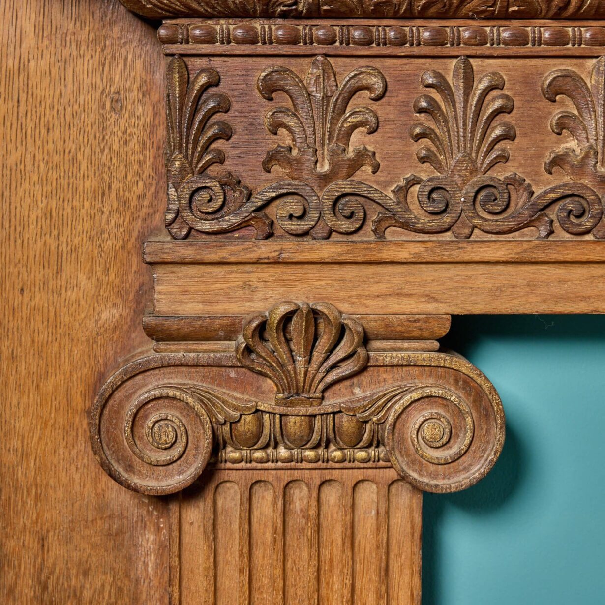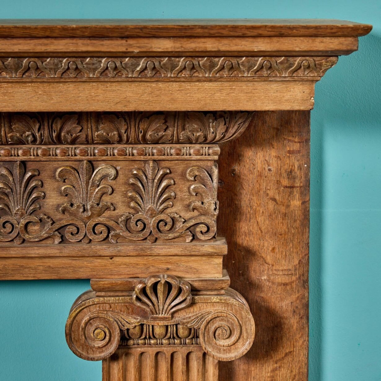 back to topA handsome Neoclassical Georgian style English oak fireplace of beautiful colour and quality. Circa 1870, this antique fireplace is exceptionally ornate, crafted at the hand of a talented 19th century artisan. Column shaped jambs and carved honeysuckle and anthemion to the frieze make for a striking feature surround in any traditional setting.