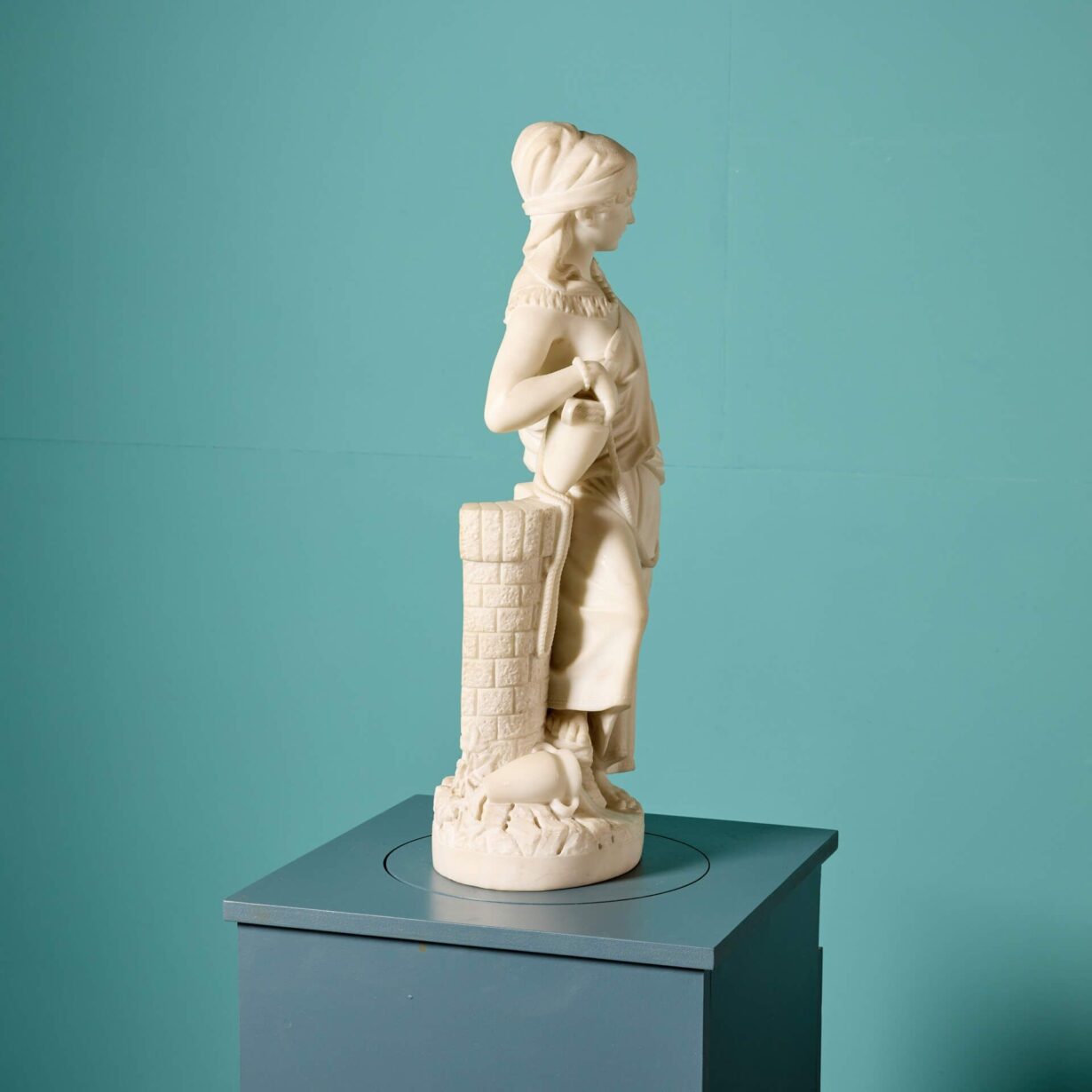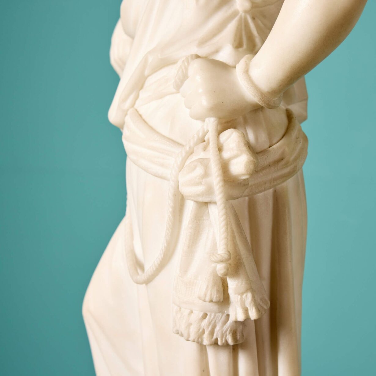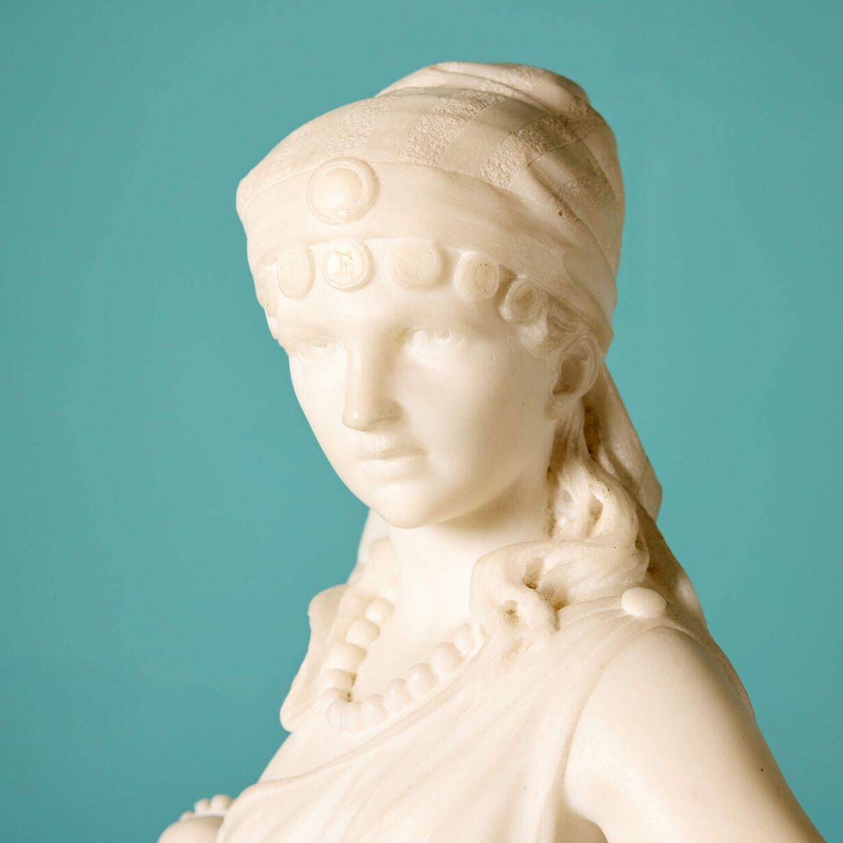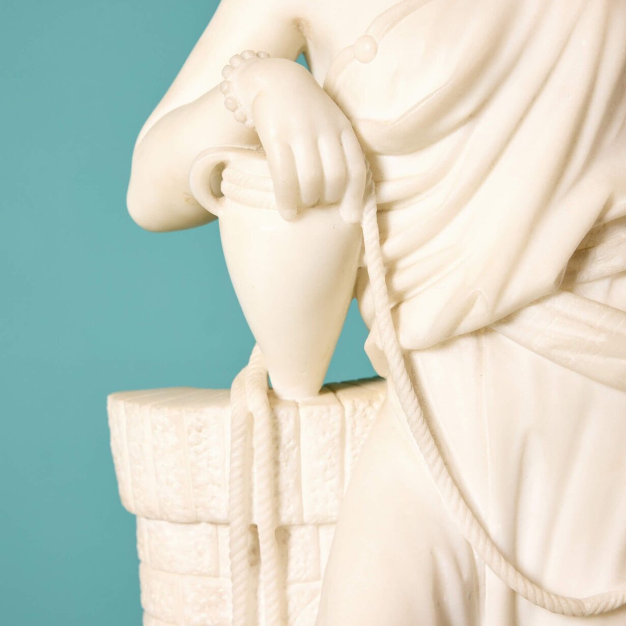 Dating to circa 1880, this expertly hand-carved sculpture is in excellent original condition. Of beautiful scale and detail, she holds the rope of a well bucket, while a jar of water sits at her feet; pearl jewellery hangs around her neck, and bracelets wrap around her wrists. Highly detailed, this statue would certainly look impressive on display in any grand, Neoclassical and Grand Tour style home.