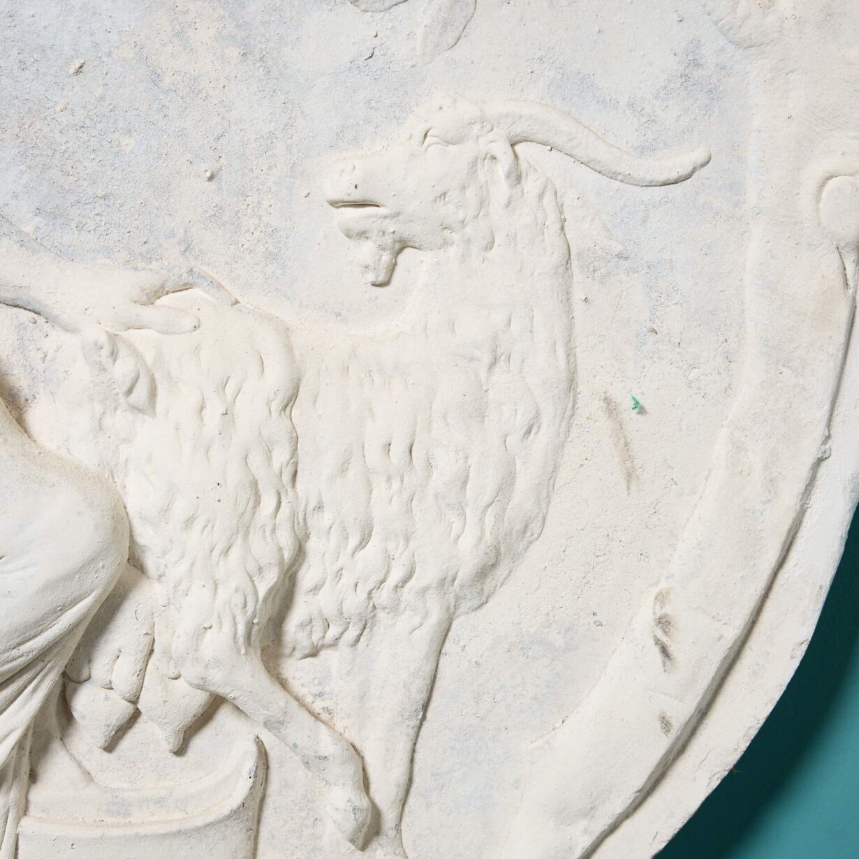 Sculpted in relief, this wall plaque is one of three similar we have for sale, this one depicting an impression of Canova’s work titled ‘The Goat Amalthea with the Infant Jupiter and a Faun’.