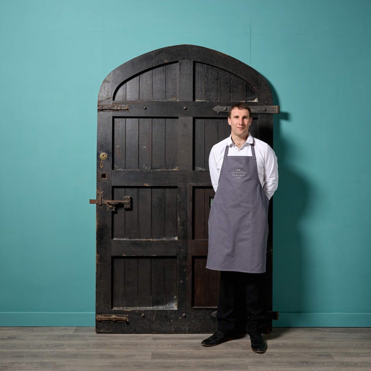 Perhaps this arched door once stood at the entrance to a prestigious English castle or historic heritage building. Whatever its former use, it will today stand out as a focal point thanks to its very large scale and defined arch to the top.