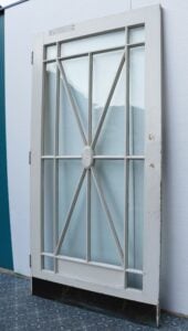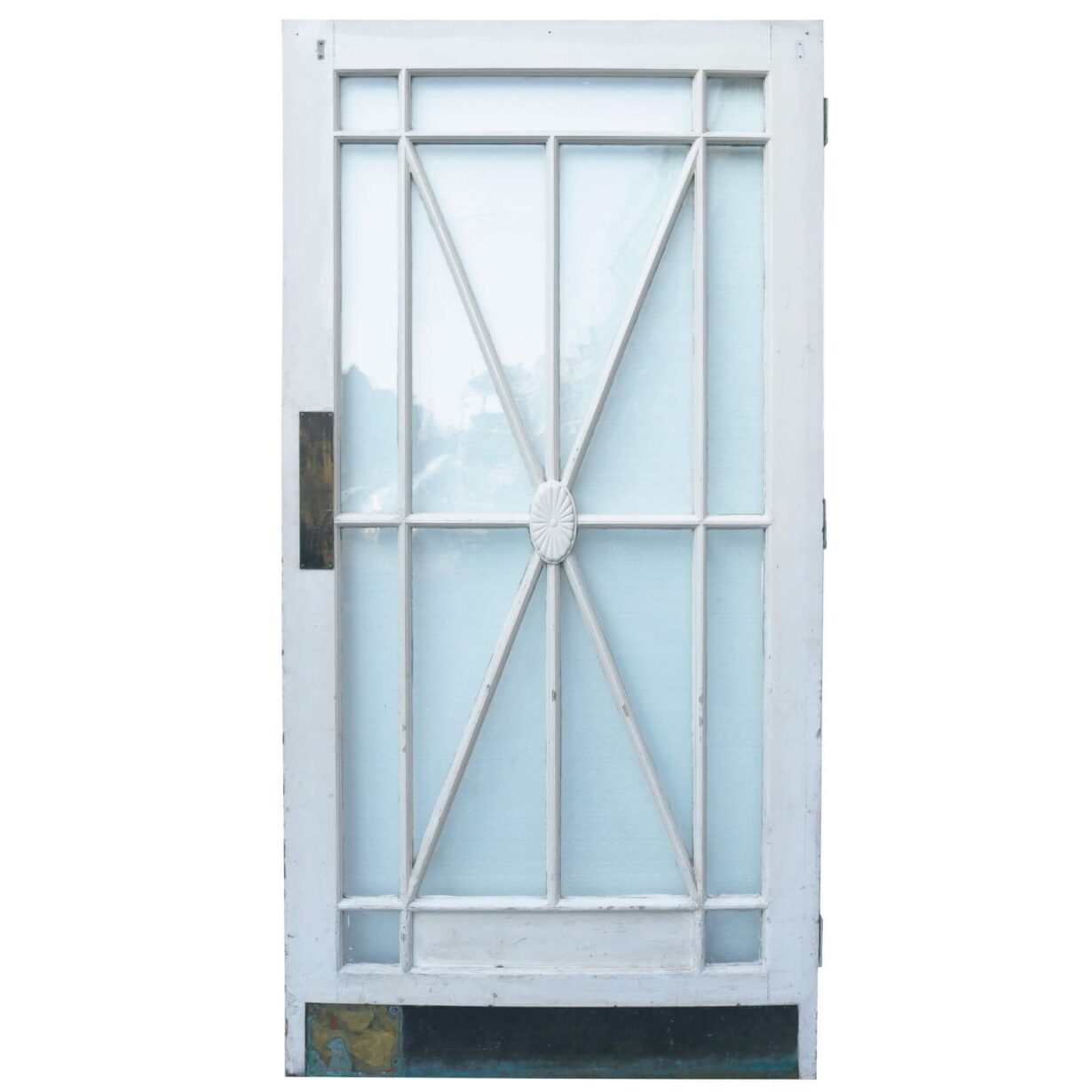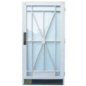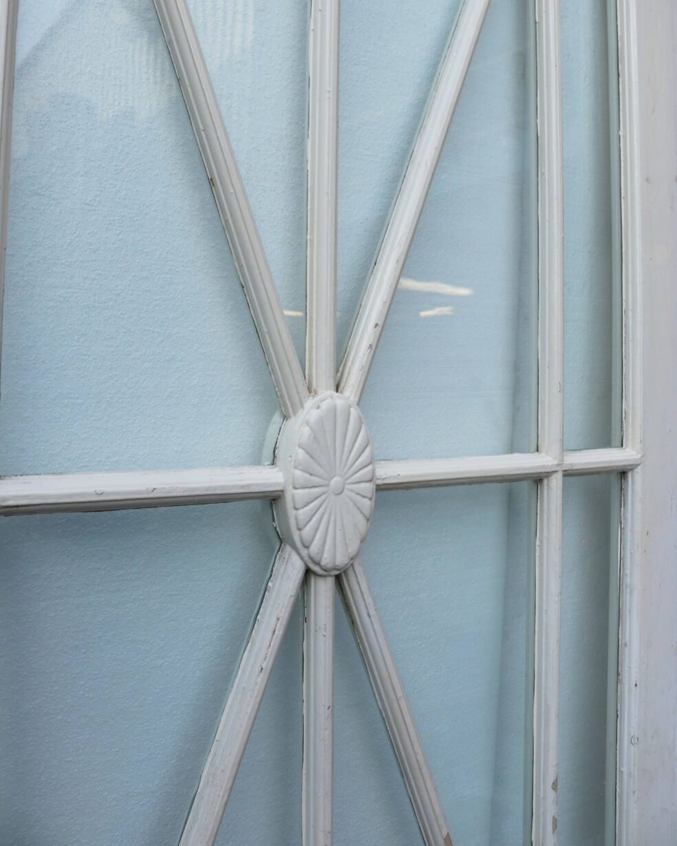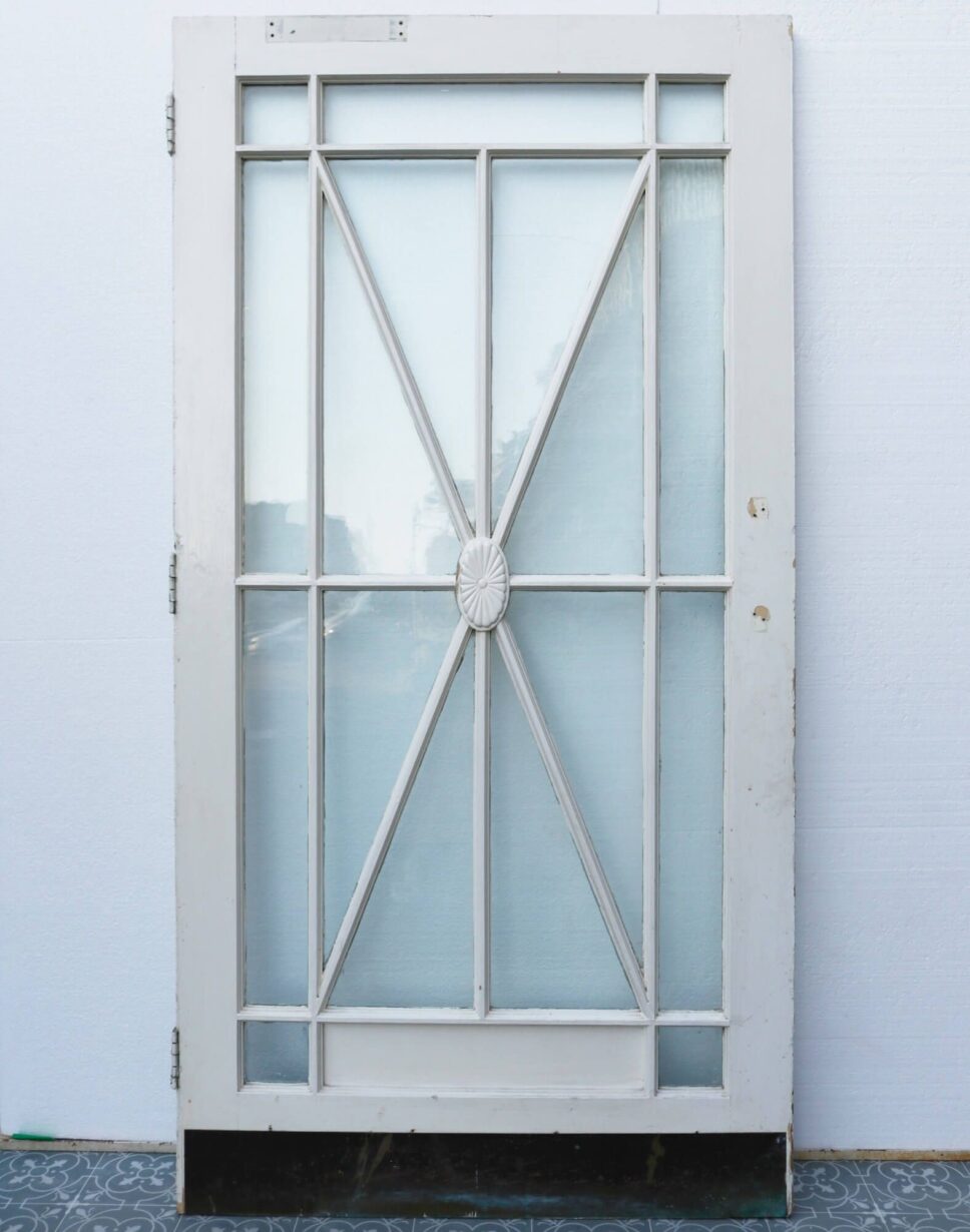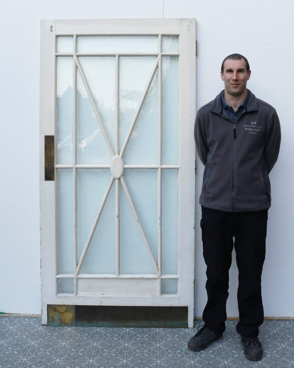 back to topThis reclaimed 1920s painted Art Deco glass door makes a stylish internal door or external door with its striking sunburst glazing detailed at the centre with an oval floral embellishment. It is single glazed with clear glass and features and old painted finish.