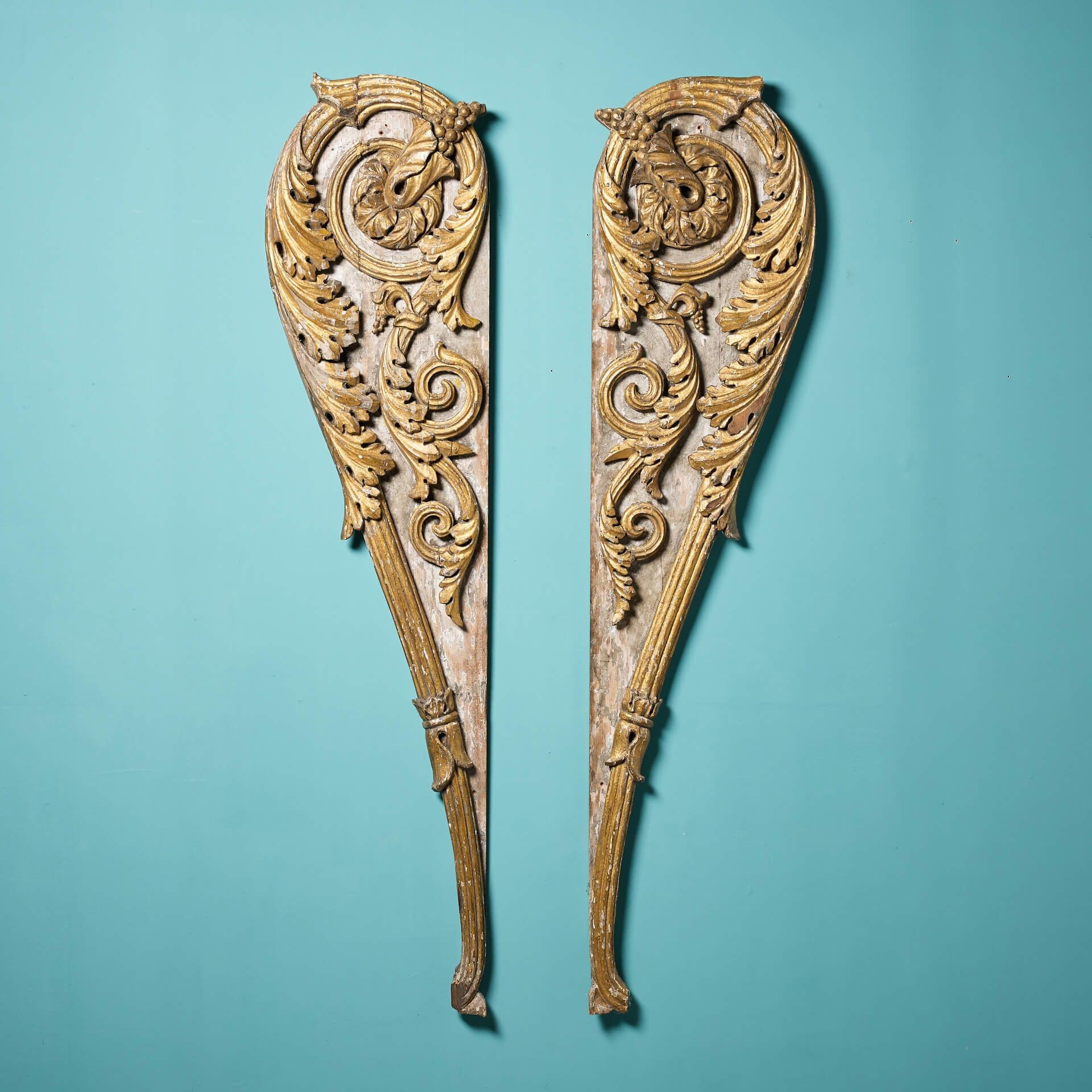 back to topA pair of antique 18th century carved and gilded wooden architectural carvings.