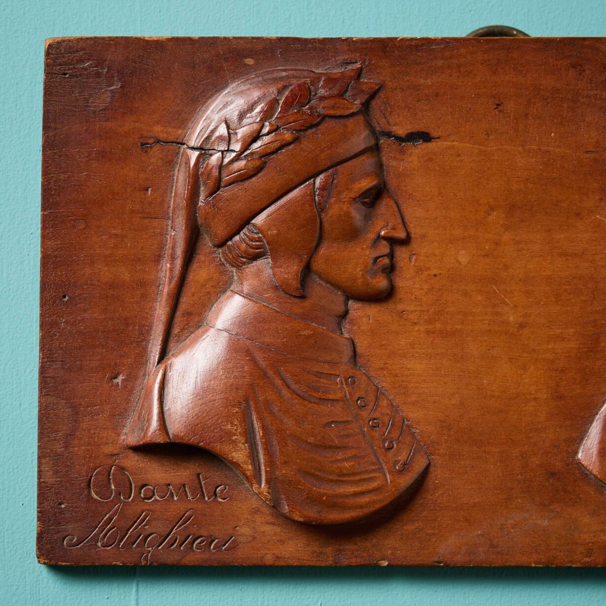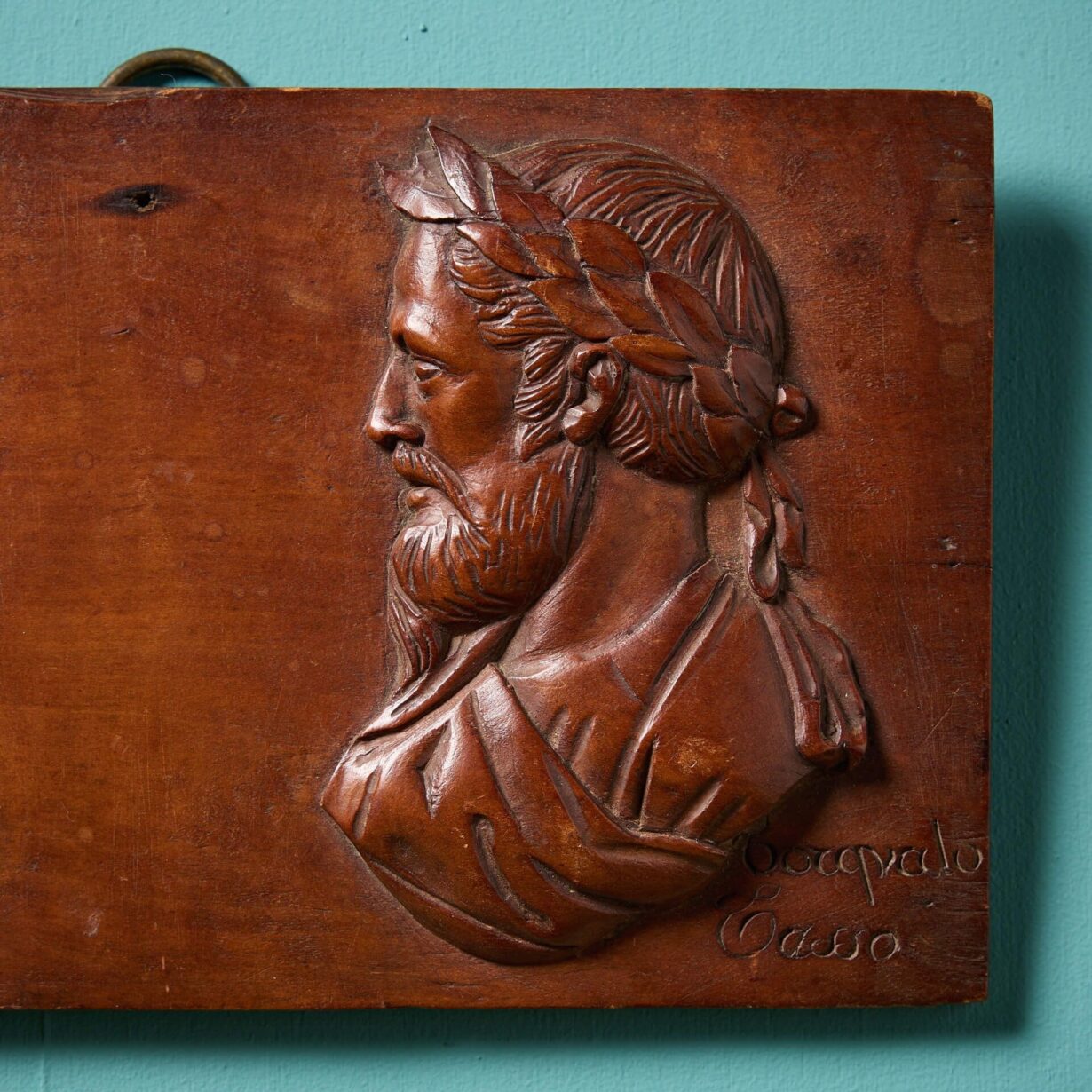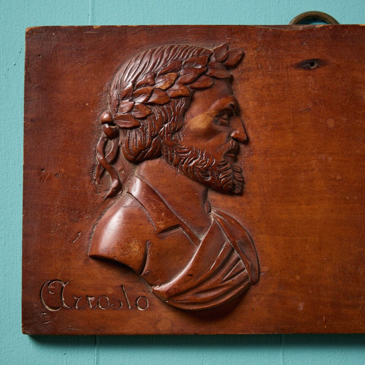 Finely handcarved, these decorative wall plaques are handsome pieces of Italian renaissance inspired interest, fitted with hooks ready for wall hanging in an interior. Each poet is dressed in neoclassical attire with a laurel wreath headdress and their name inscribed to each corner.
