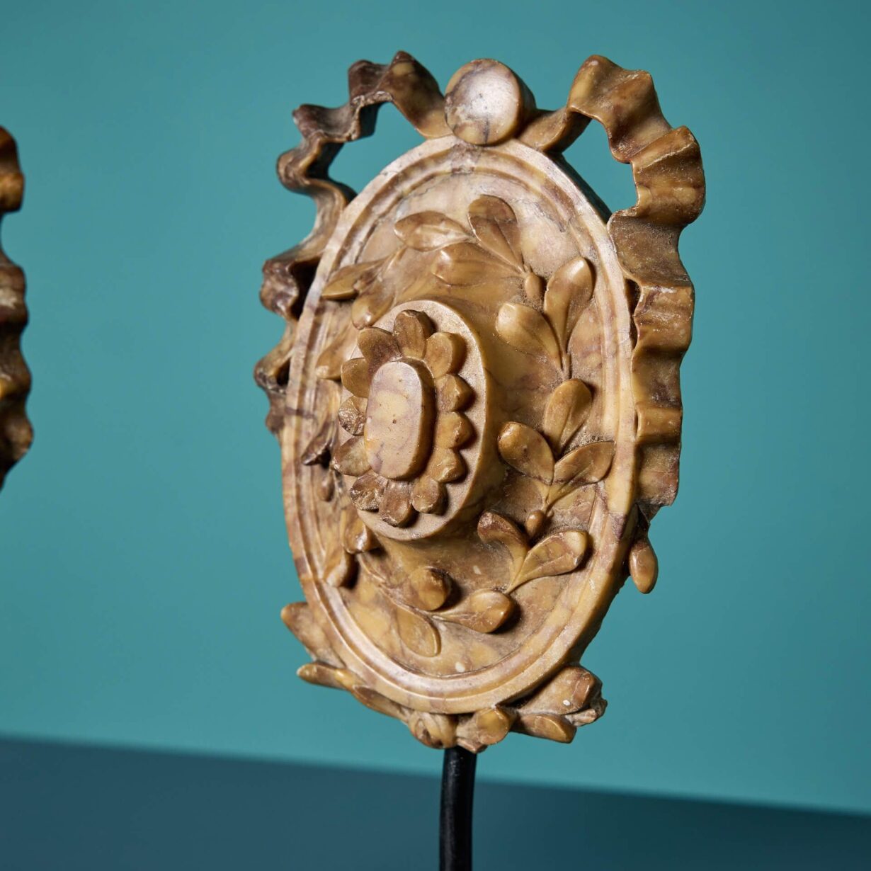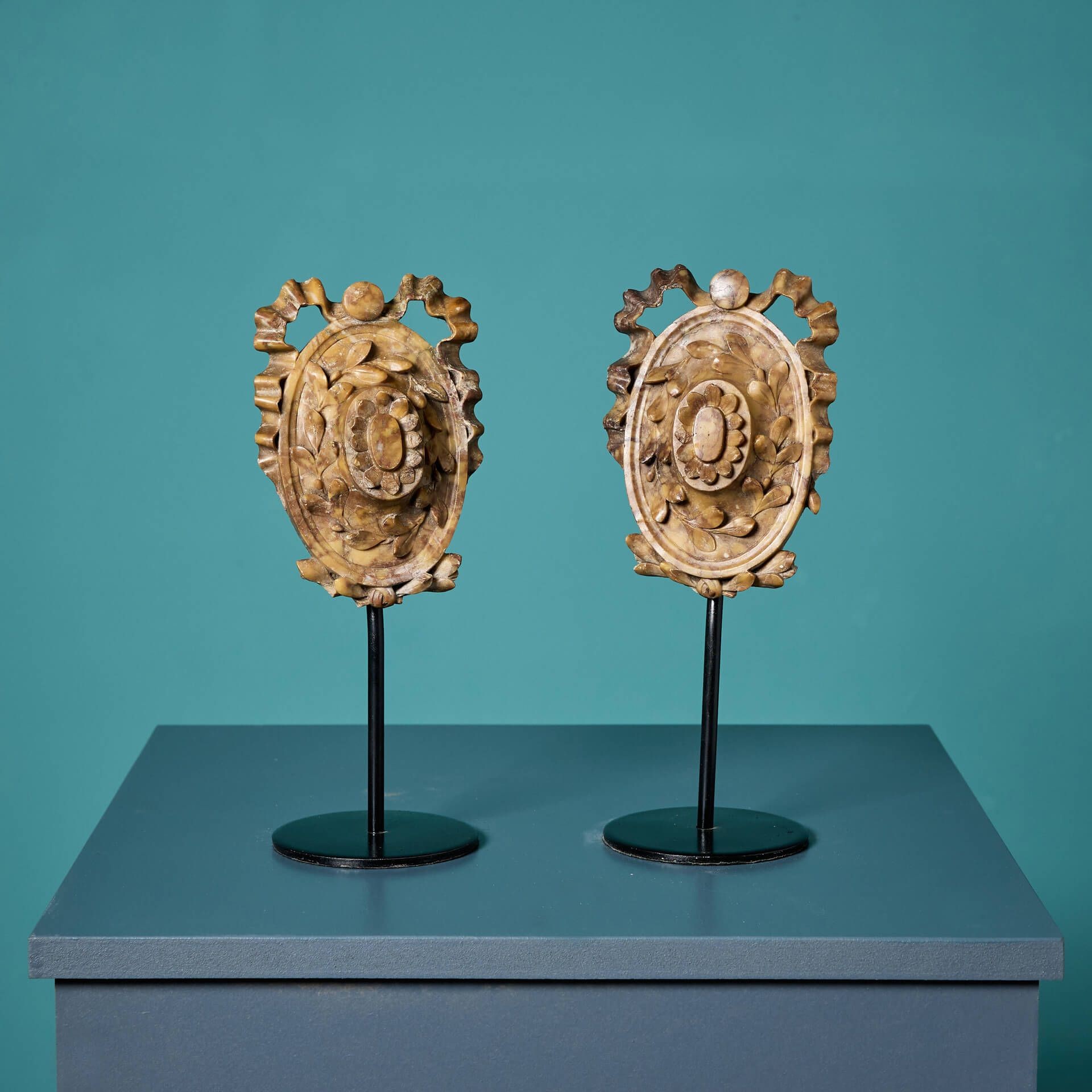 Showcasing expertly carved floral and swags designs, this pair have been brought to life on bespoke steel stands to allow the intricacy of their design to be enjoyed and observed up close on a mantle, shelf or side board.