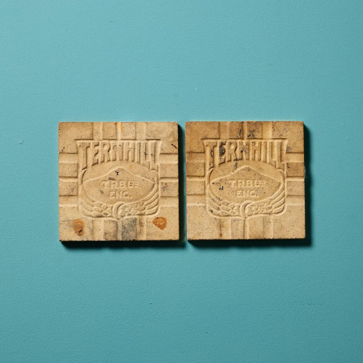 Modelled in relief, these deeply cast 5-inch tiles display a classically dressed jousting knight on horseback in striking colourful glazes, in front of a castle in buff on a deep black background with gold edging. Together the pair create this impressive medieval scene.
