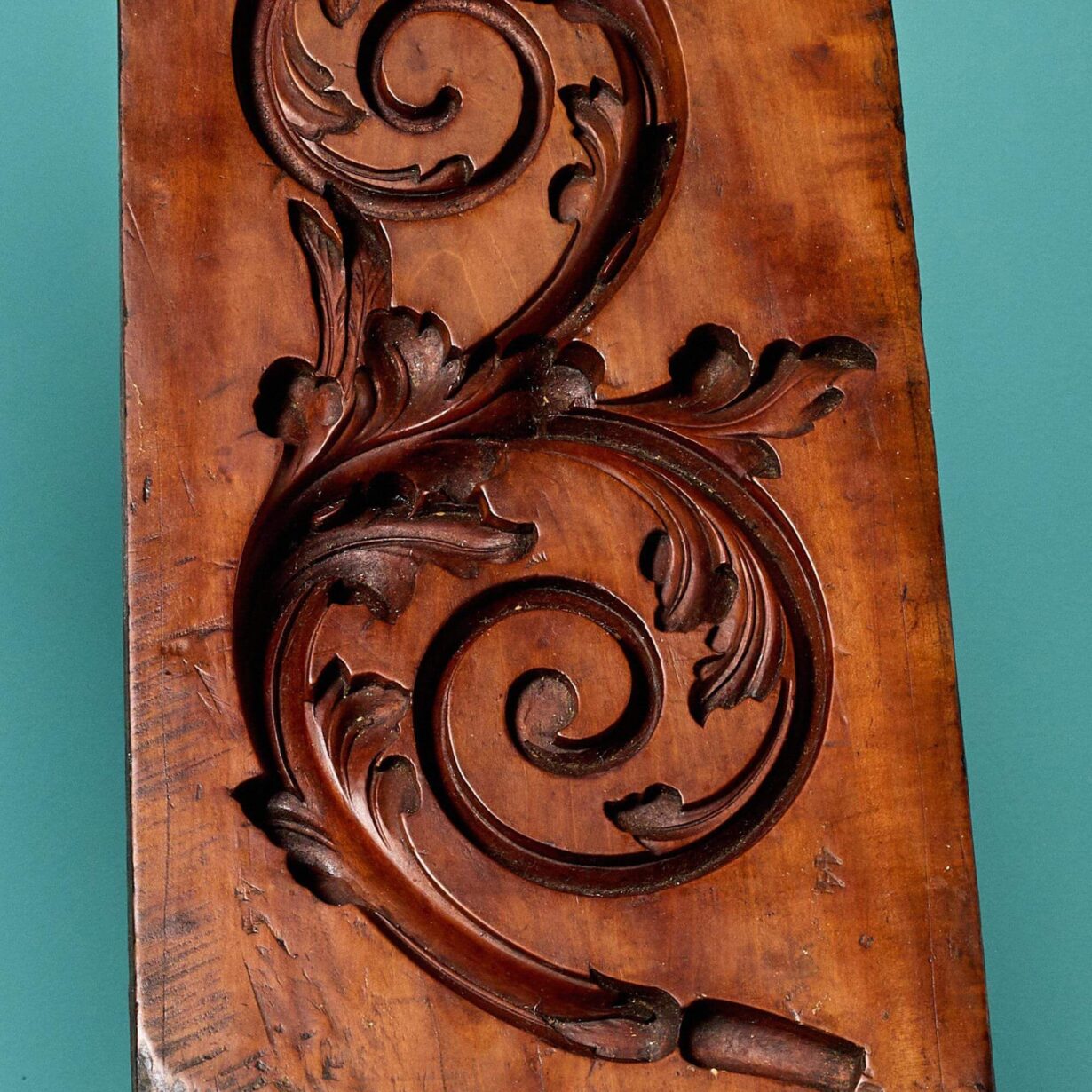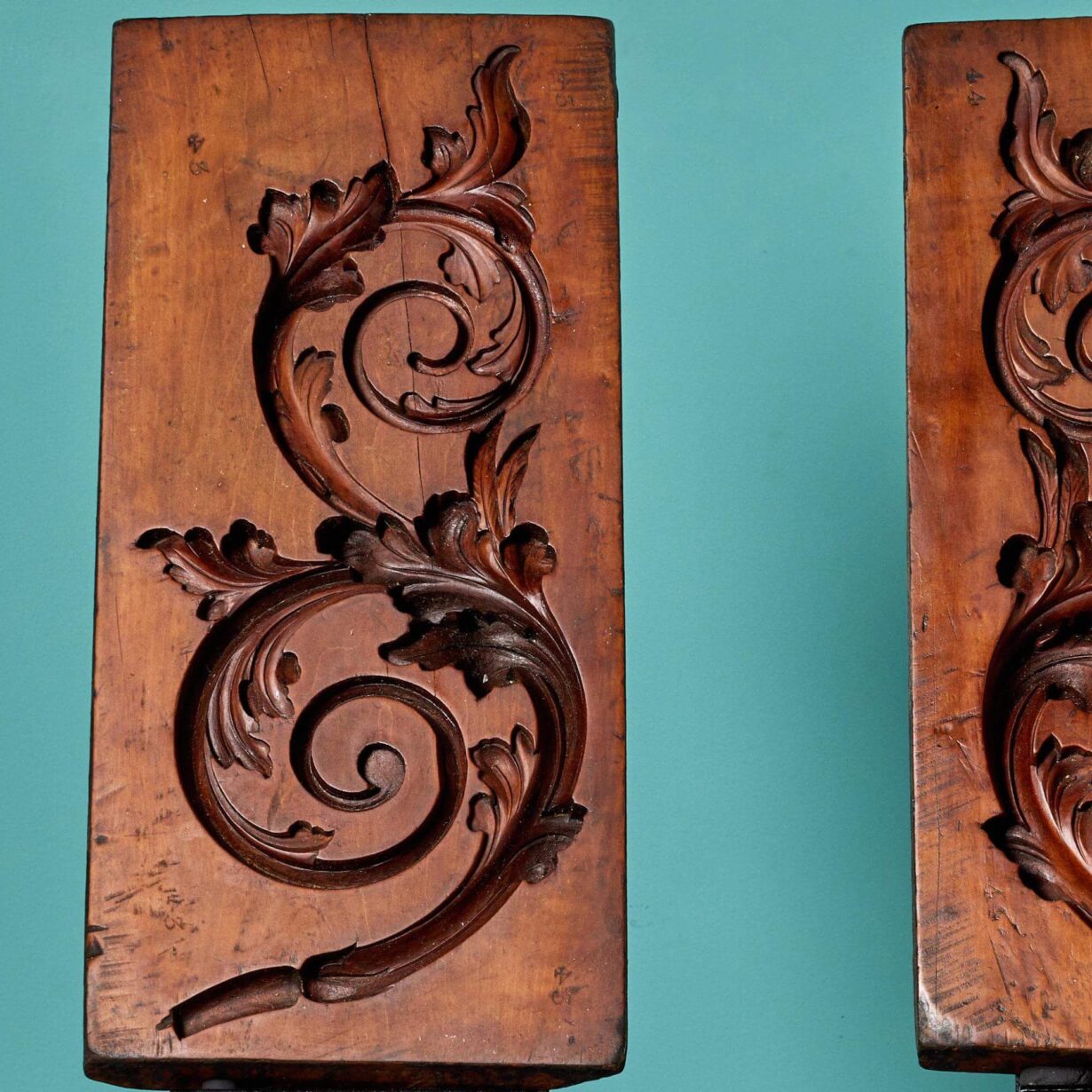 A handed pair, these moulds feature a matching foliated scroll design, carved deeply into the wood. One is marked with the number 43 and the other 44. This results in a highly ornate and precise compo embellishment that appears as though it has been carved rather than cast. These wooden moulds come with two accompanying custom-made steel display stands.