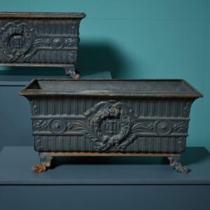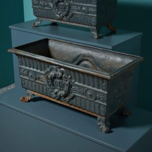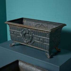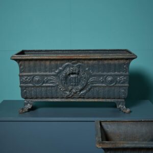 back to topTwo antique cast iron trough planters of French origin, circa 1870. These beautiful matching trough plant pots are each of a spacious rectangular form with flared sides and scroll feet, the body ornamented with central cartouche to both sides.