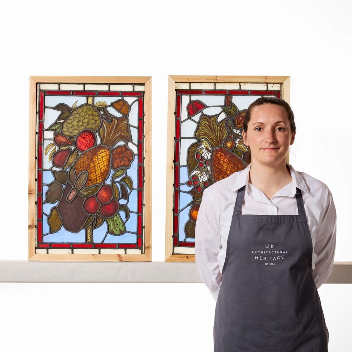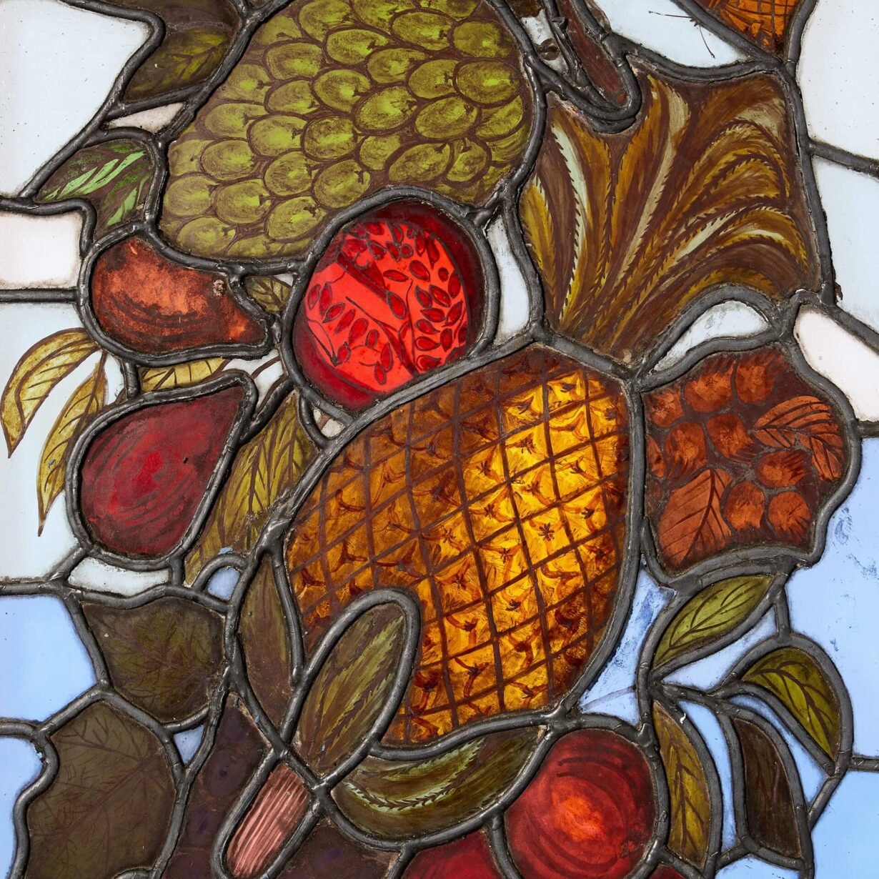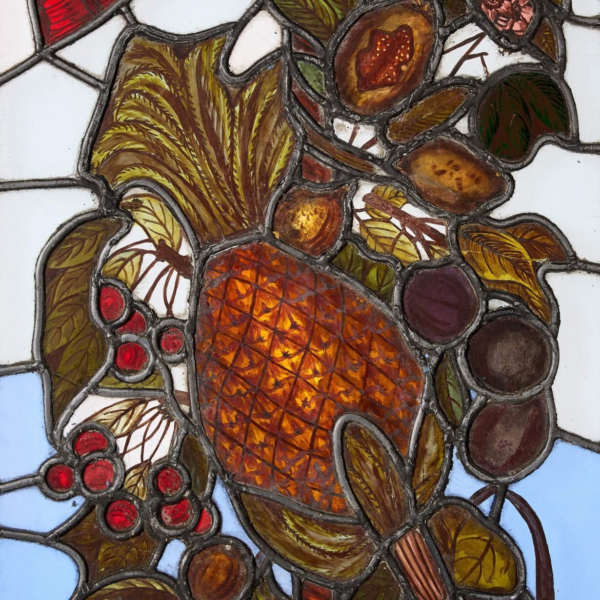 back to topA beautiful pair of late 19th century antique English stained glass windows depicting an abundance of colourful fruits including pineapples, pomegranates, grapes and cherries alongside butterflies.