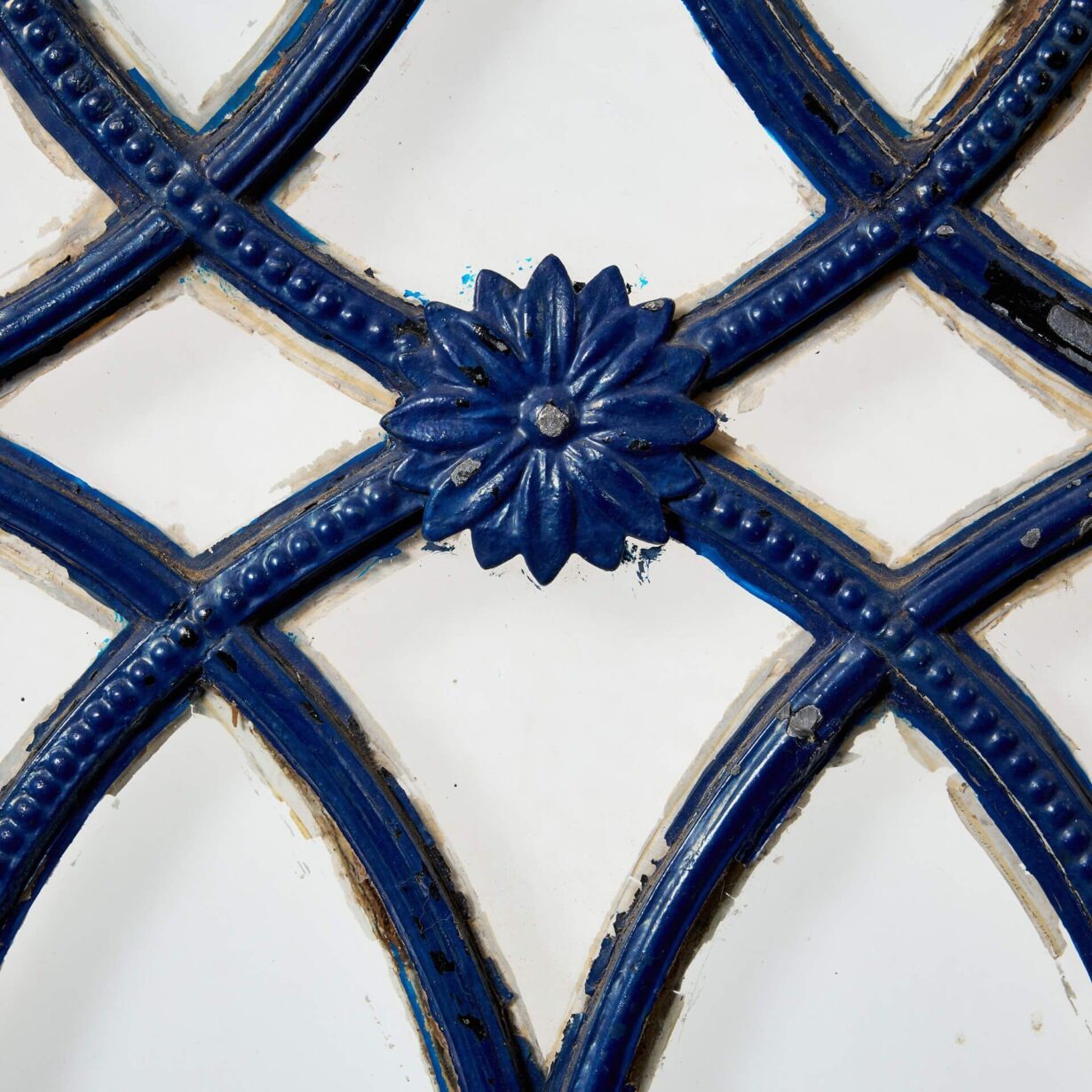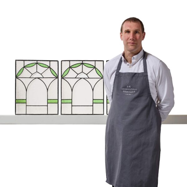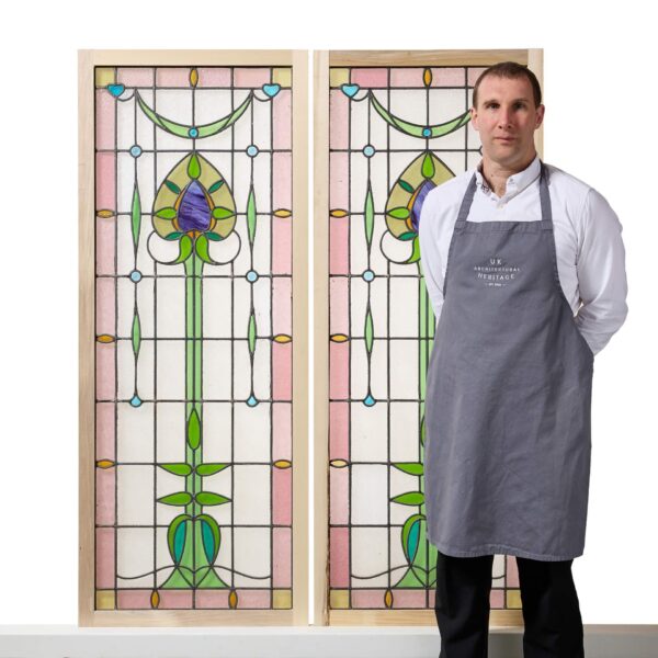 Each window is of a matching design, the clear textured leaded glass artistically hand painted to create a pleasing style pattern, displaying blue tone iron with decorative lead embellishments to the face.