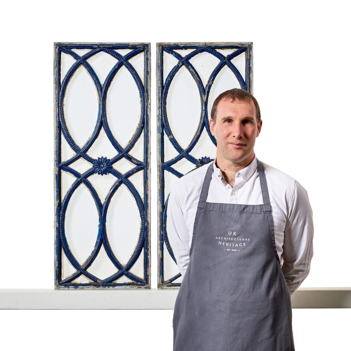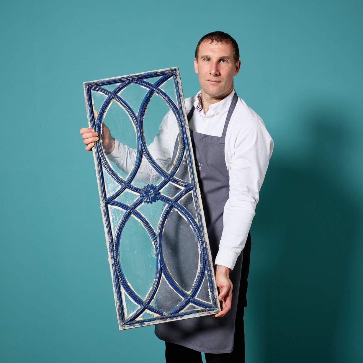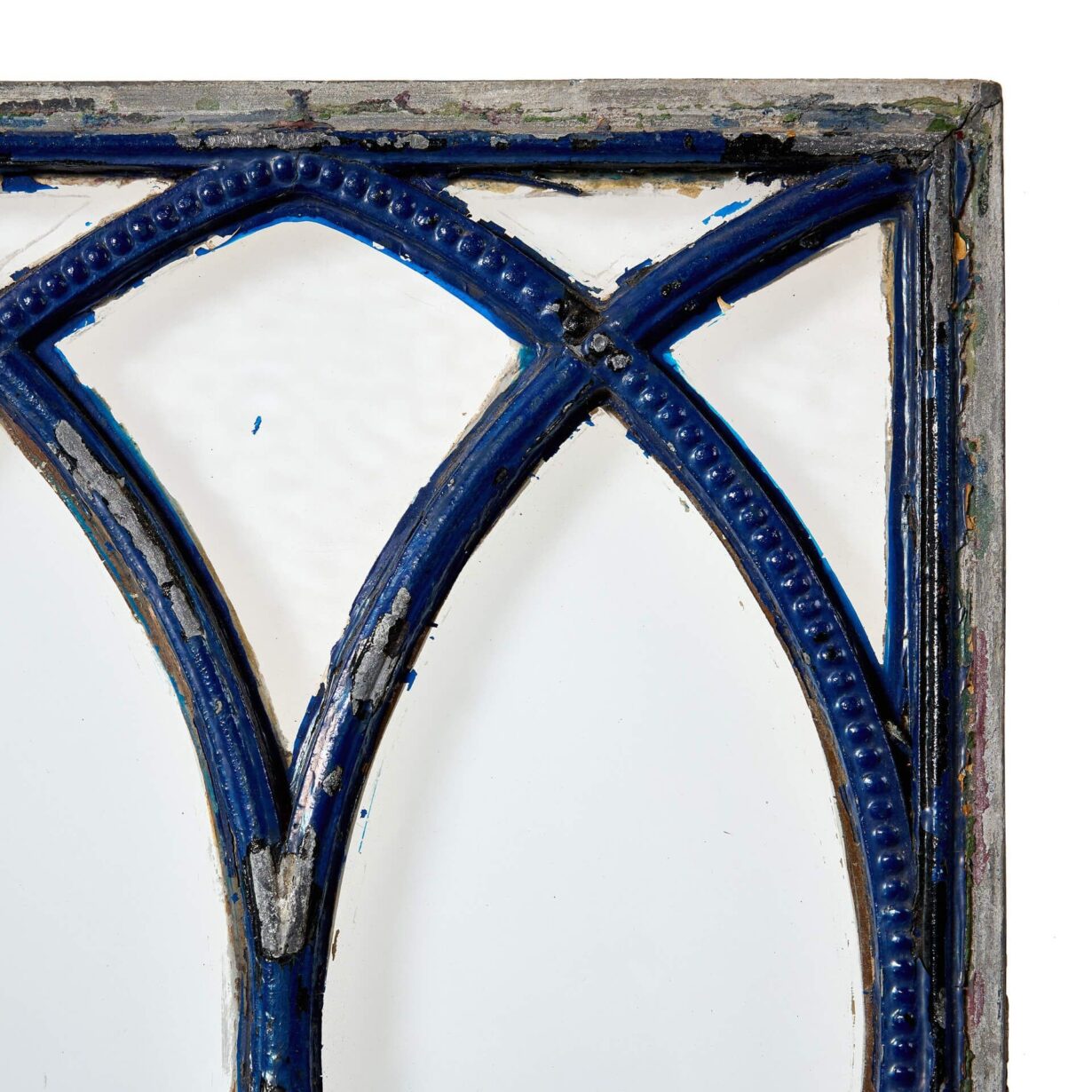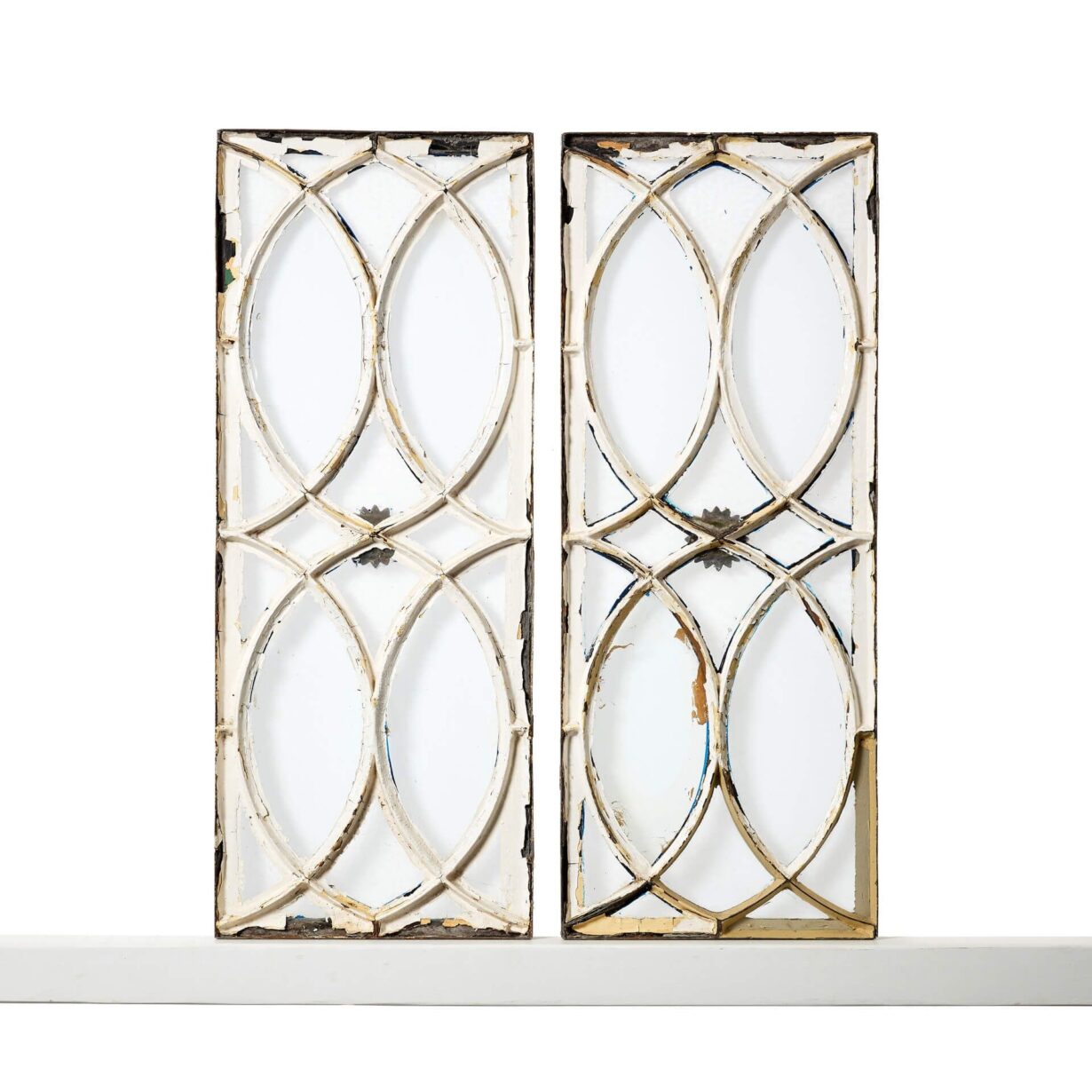 back to topA pair of antique late Georgian style iron elliptical pattern clear glass window panels, dating to circa 1880.