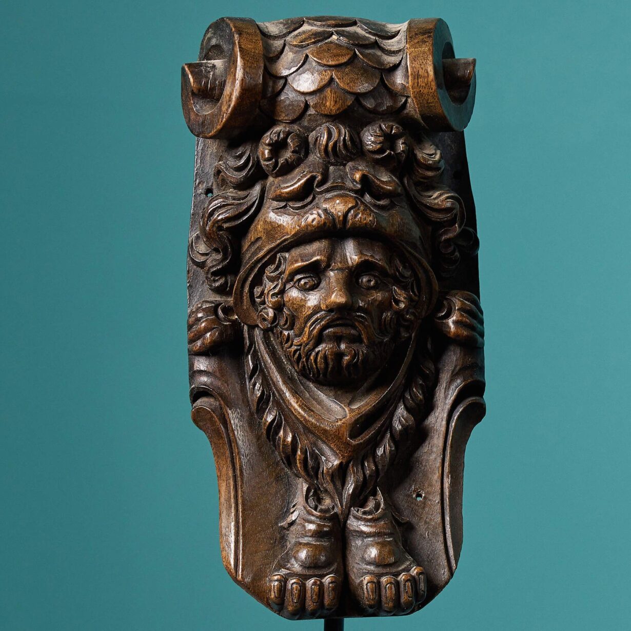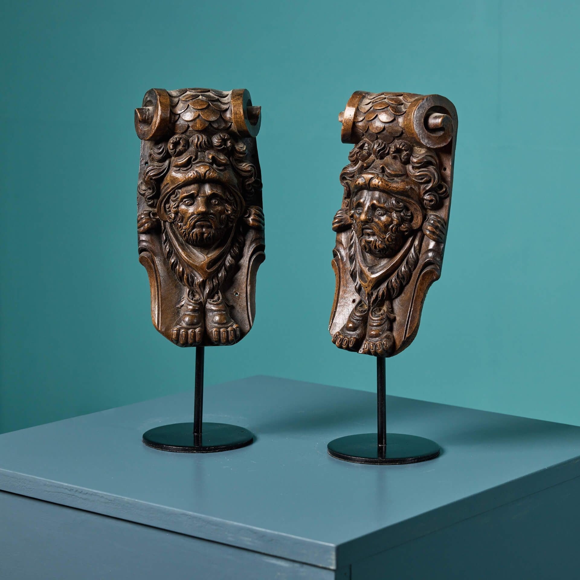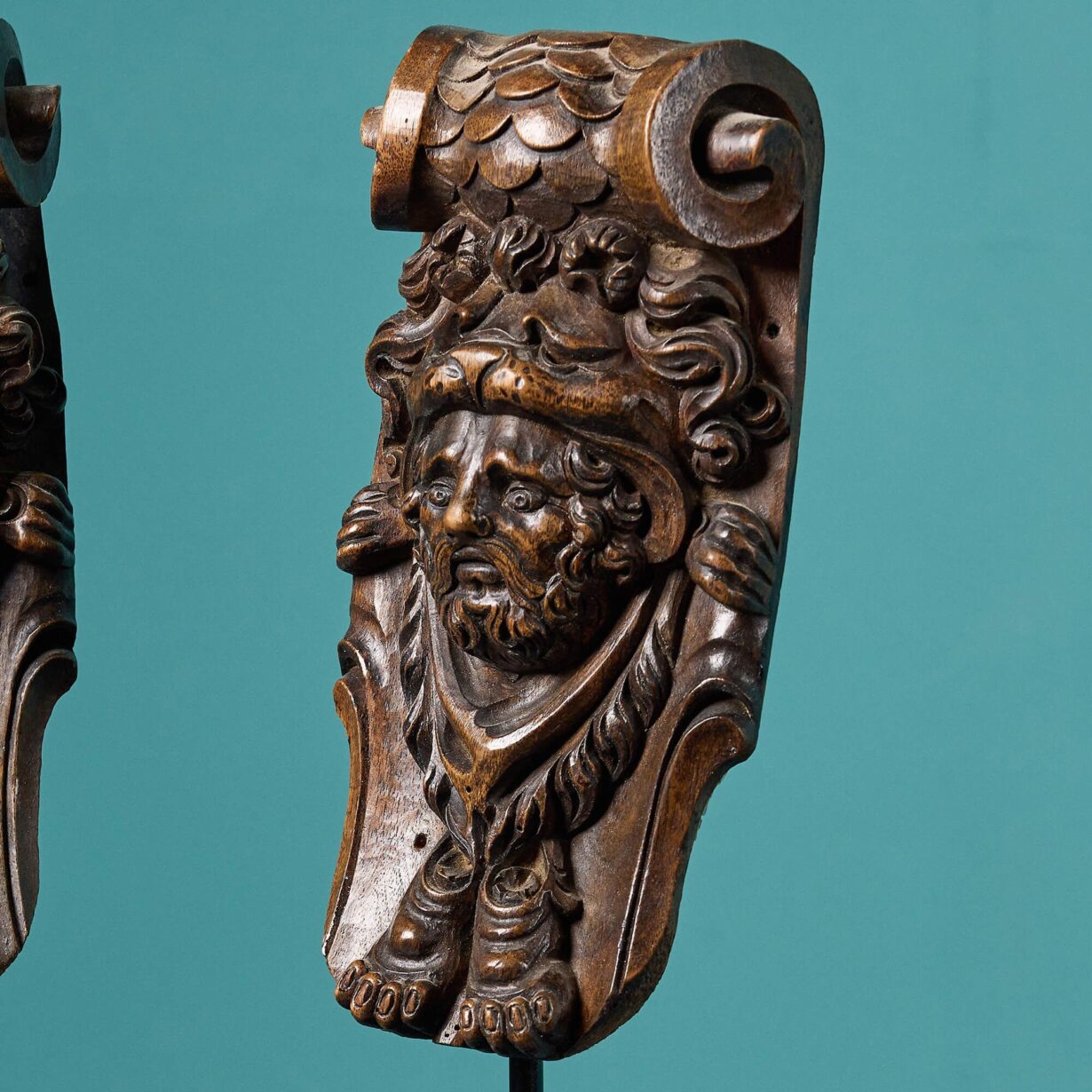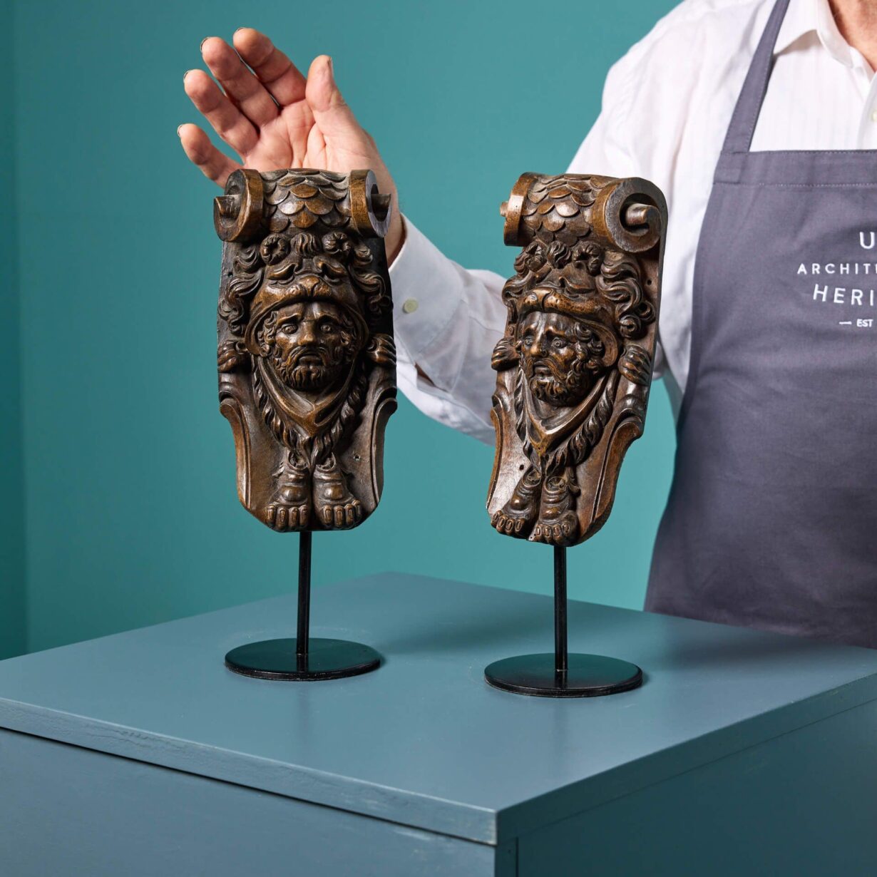 back to topA pair of hand carved wooden corbels carved in walnut and mounted onto bespoke steel bases for display. Dating from the mid 19th century, these decorative wooden corbels are handsomely carved, depicting masks that seem to peer out of a lion’s head. They likely once embellished a piece of period furniture.