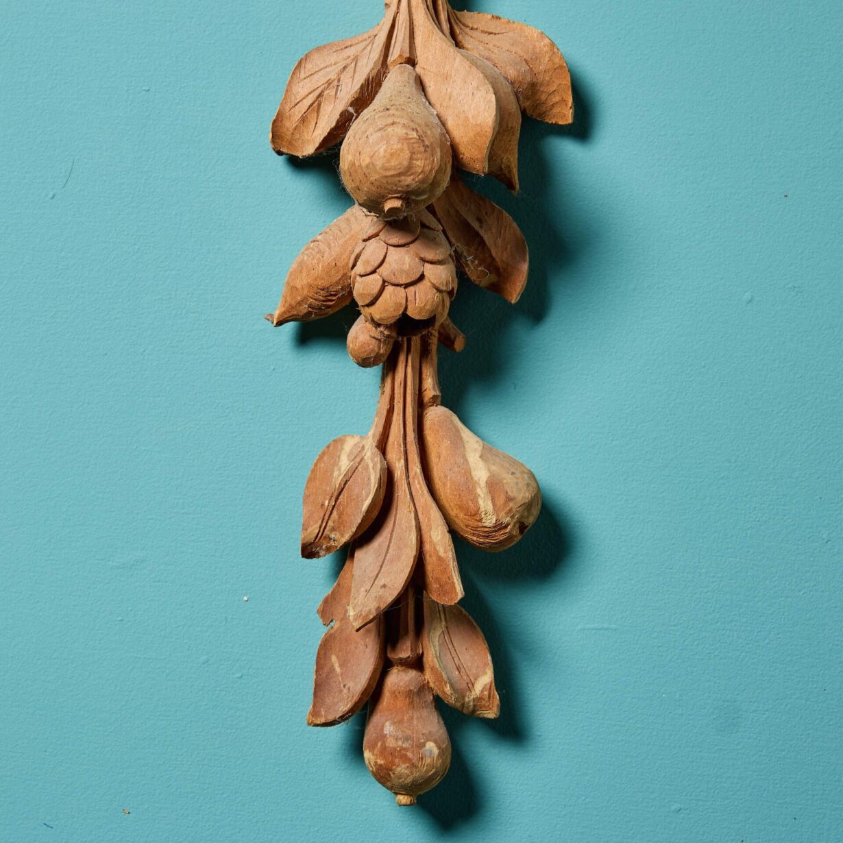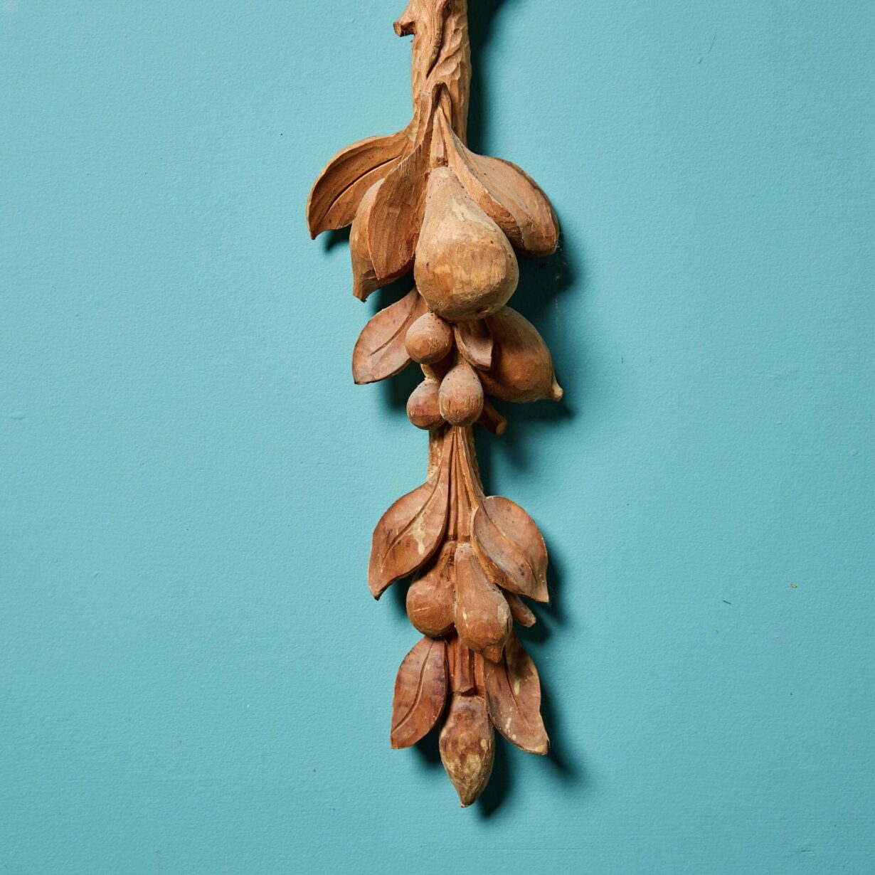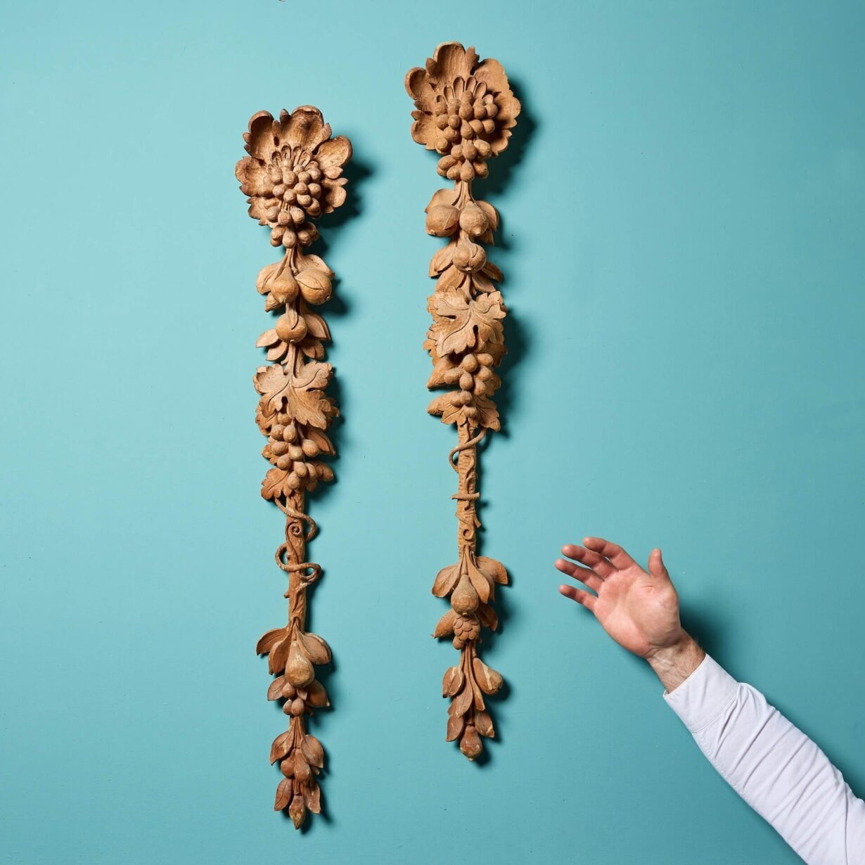 Dating to circa 1850, this pair of unique carvings showcase stylised foliage and fruits, that create a sense of movement as they flow from top to bottom.