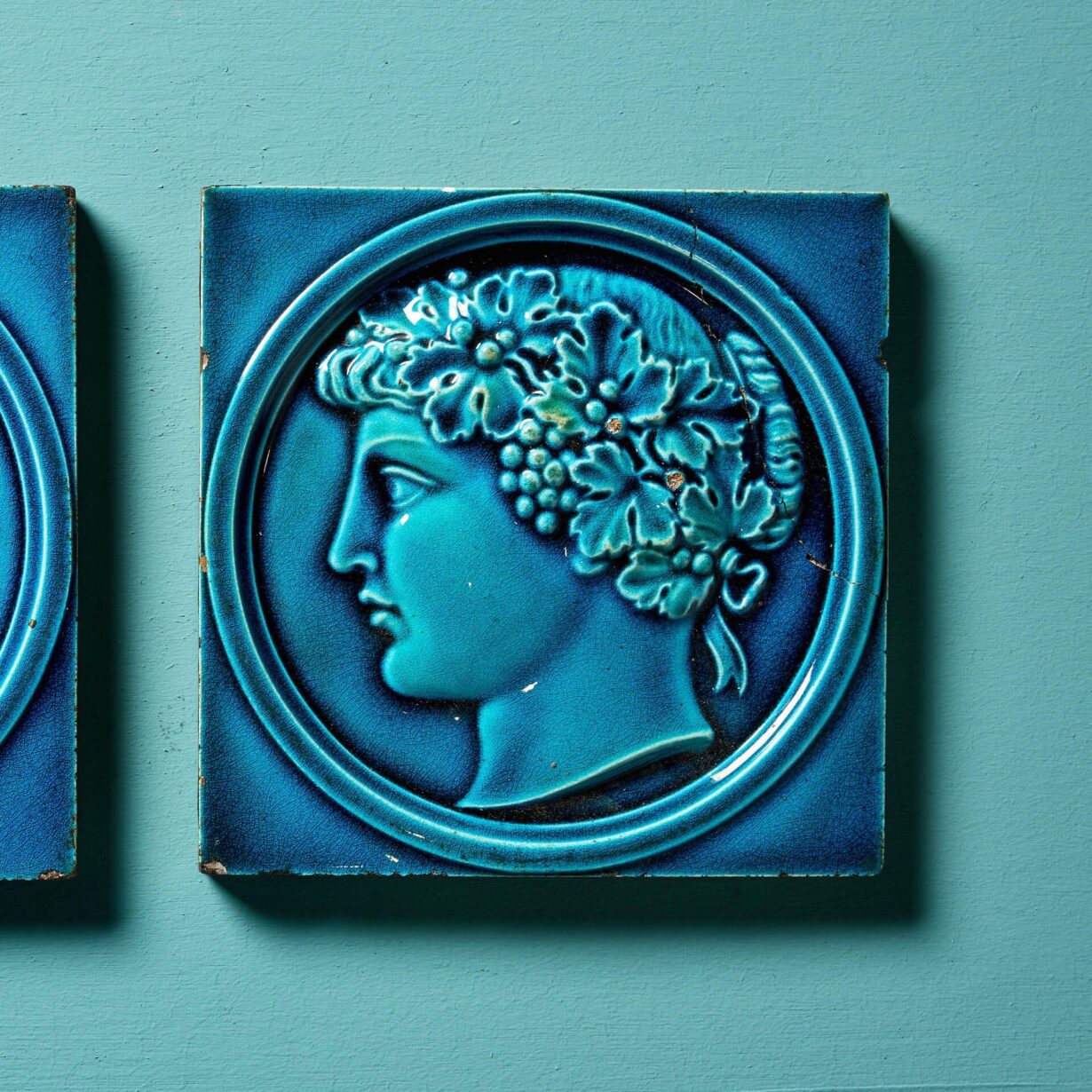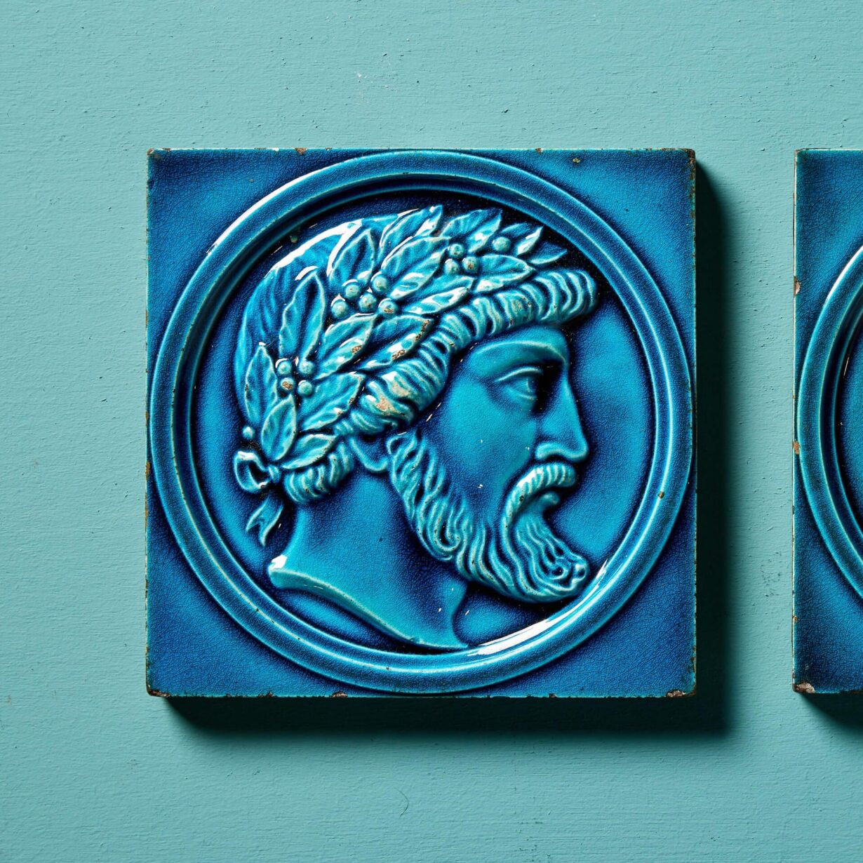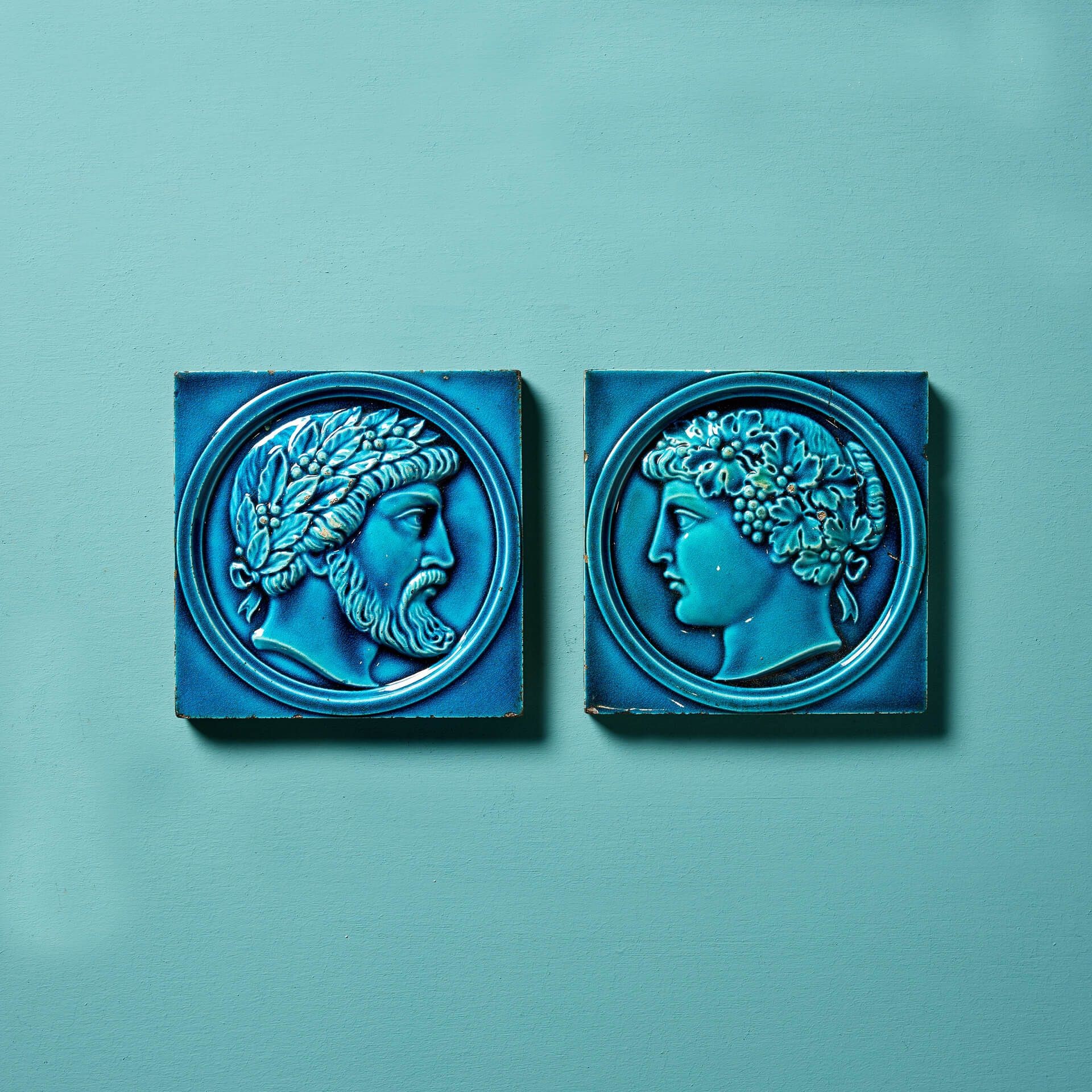 In turquoise and dark navy blue majolica glaze, one 6-inch tile is decorated with the portraits of Greek noblemen wearing an olive wreath, together with the companion tile depicting the profile of a female wearing a fruiting vine wreath.