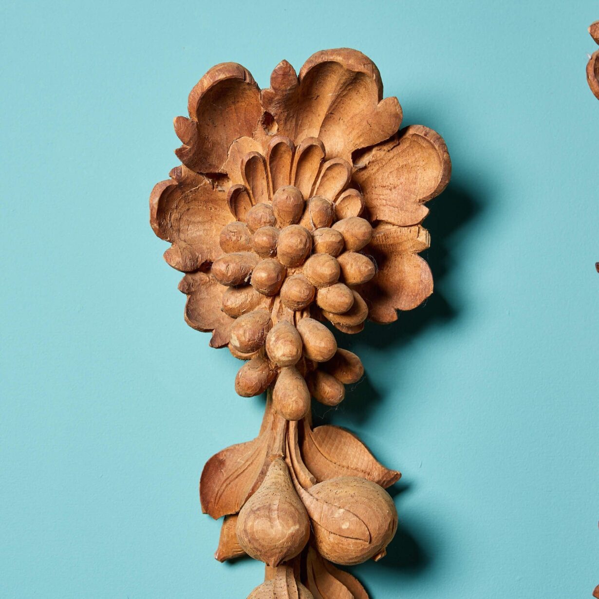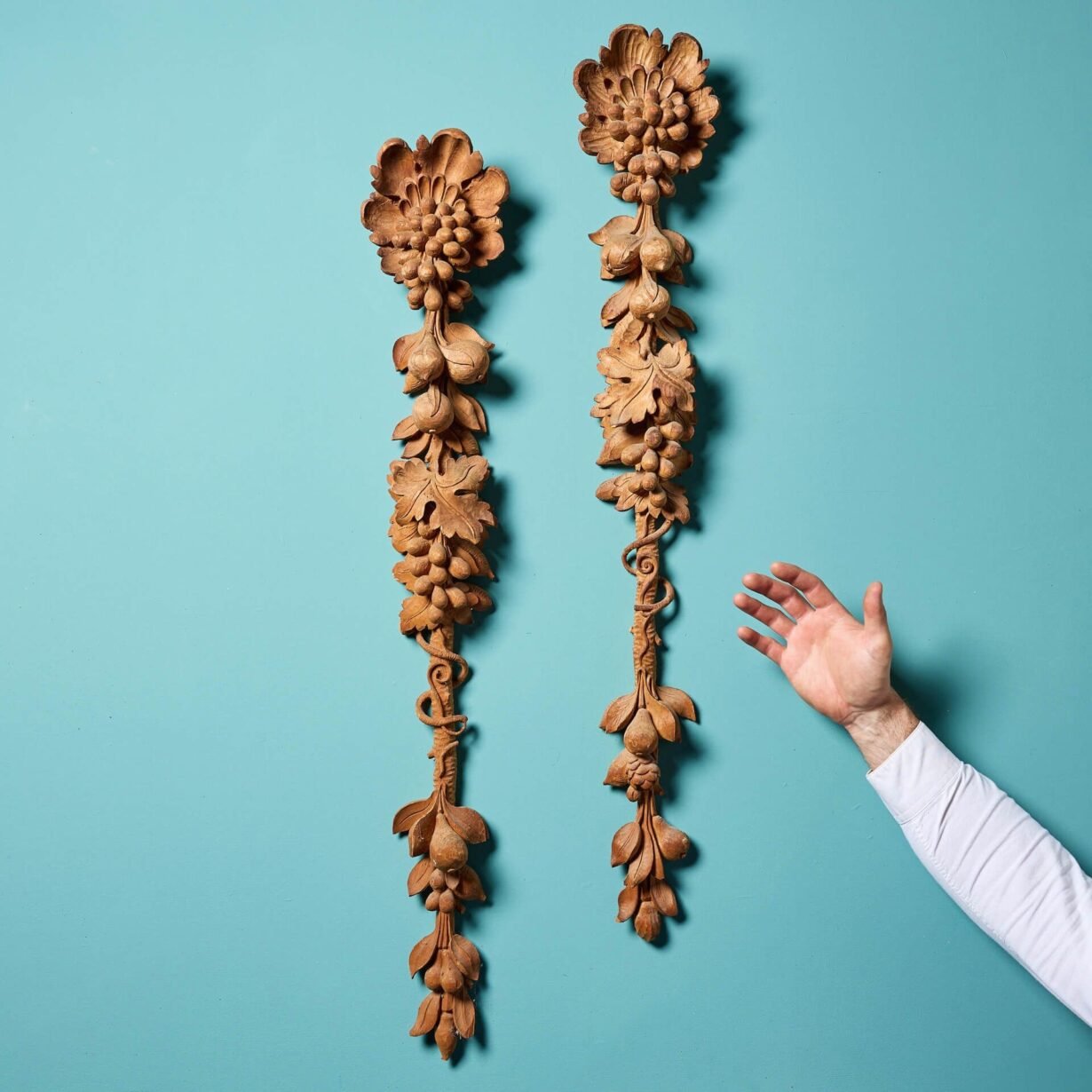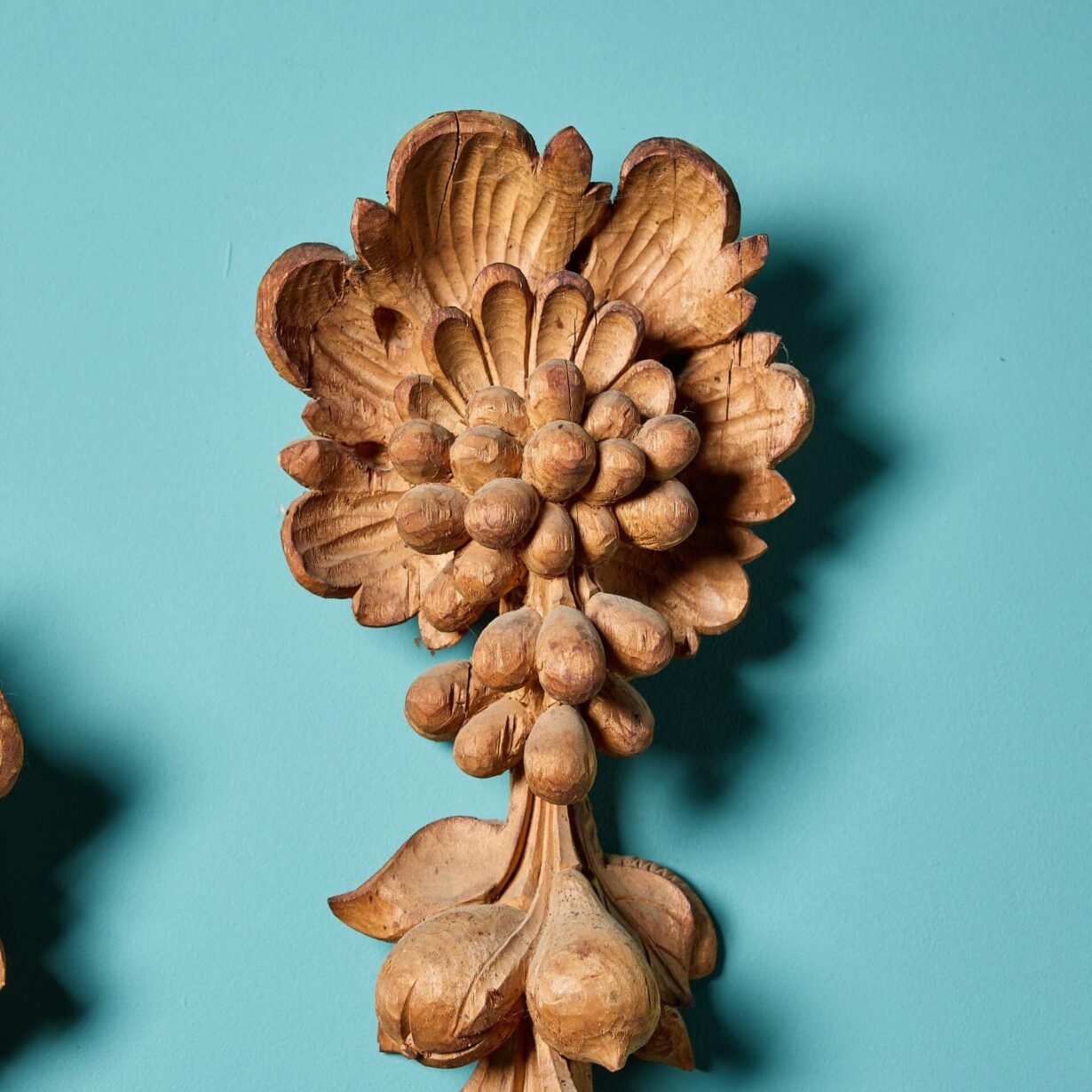 Dating to circa 1850, this pair of unique carvings showcase stylised foliage and fruits, that create a sense of movement as they flow from top to bottom.