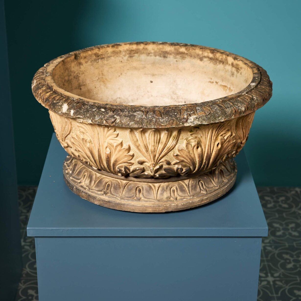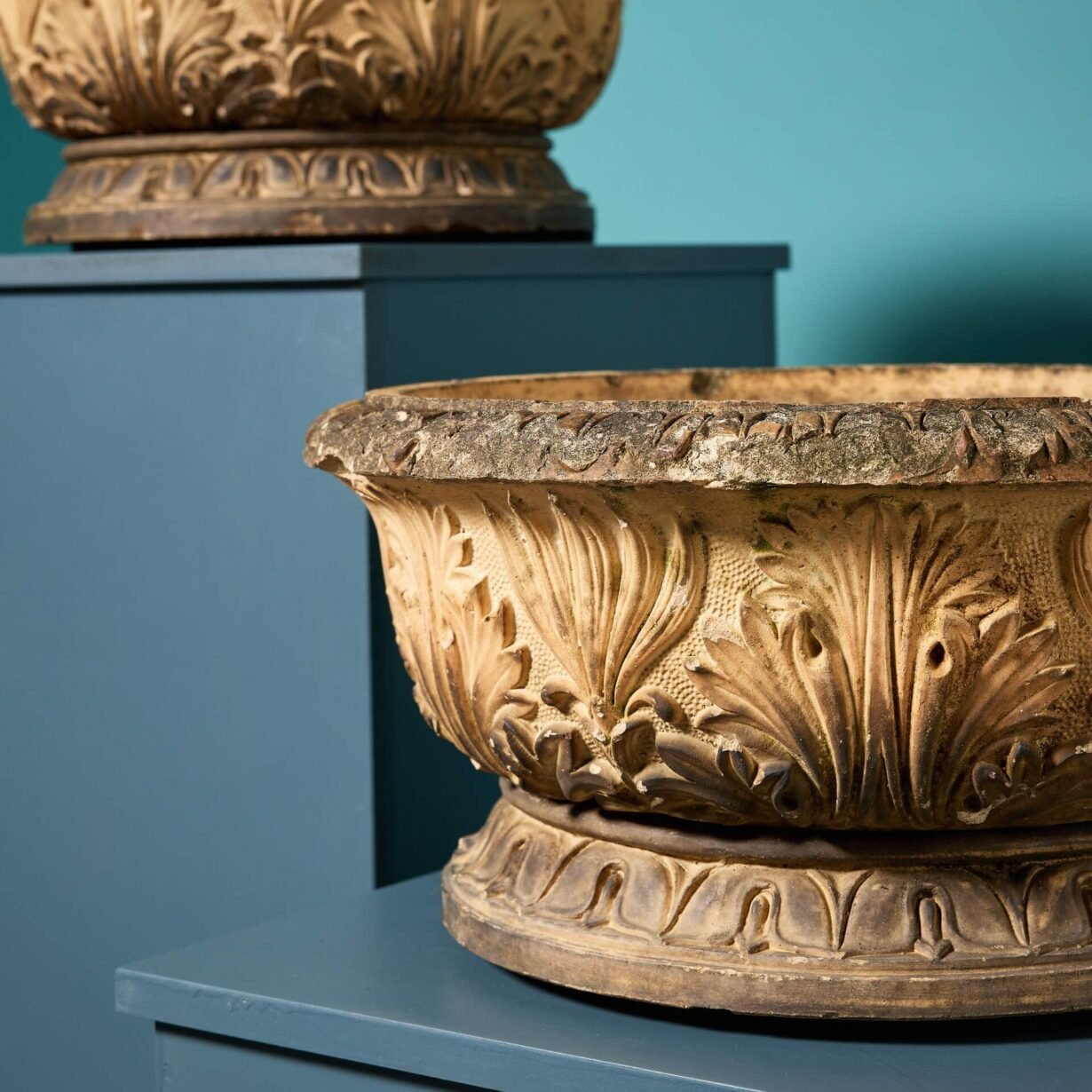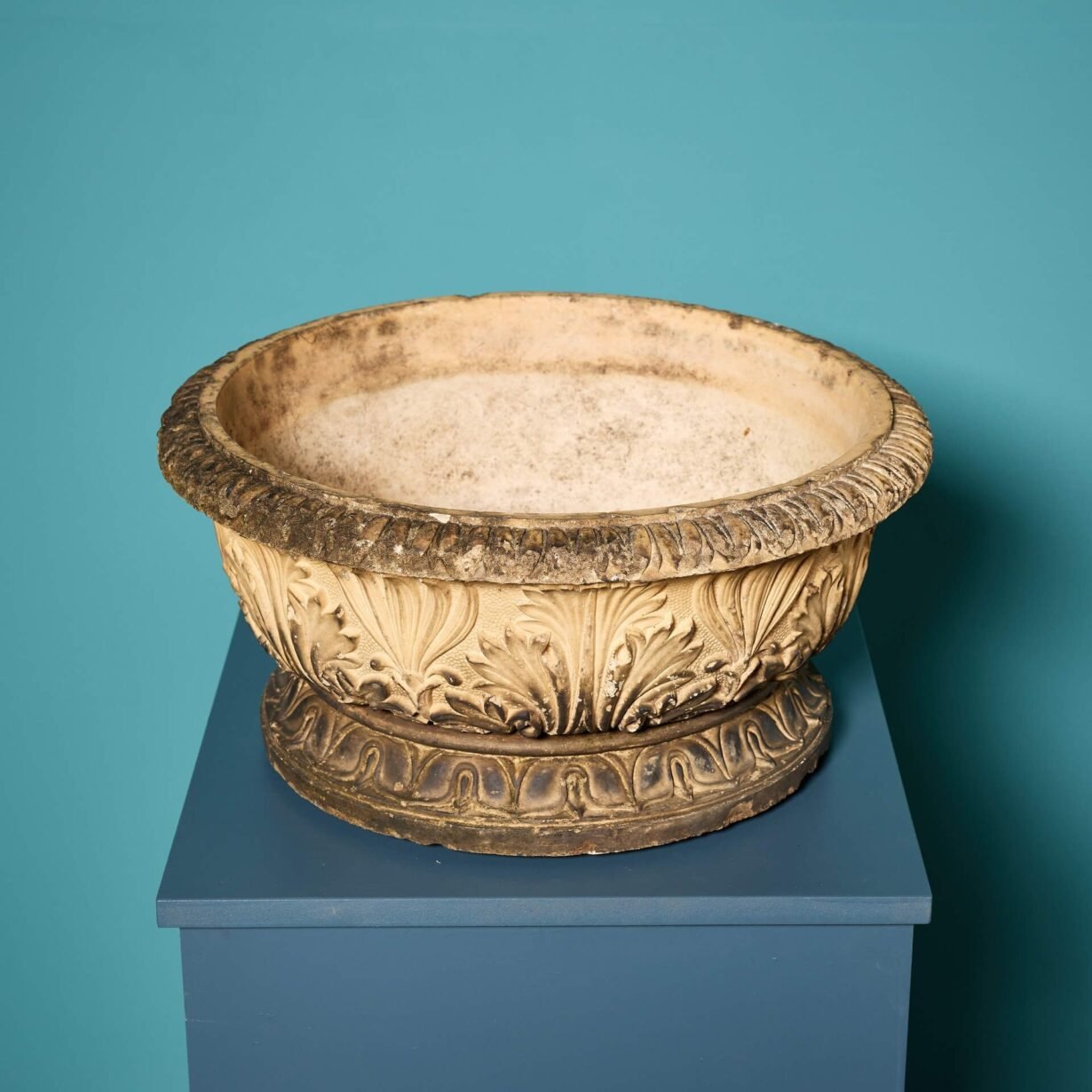 Inspired by period Georgian styling, these antique planters are each decorated with neoclassical acanthus leaves to the body above a turned rim and separate base. Their shallow nature makes them a smart addition to outdoor spaces of any period, perfect for planting with seasonal flowers or as standalone decorative bowl urns.