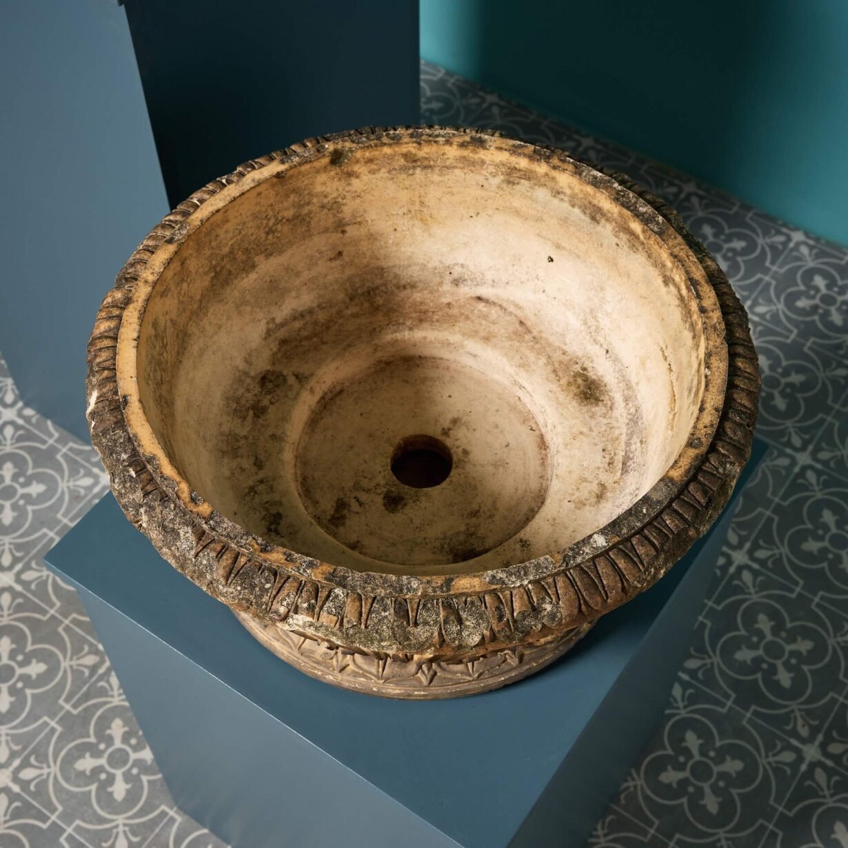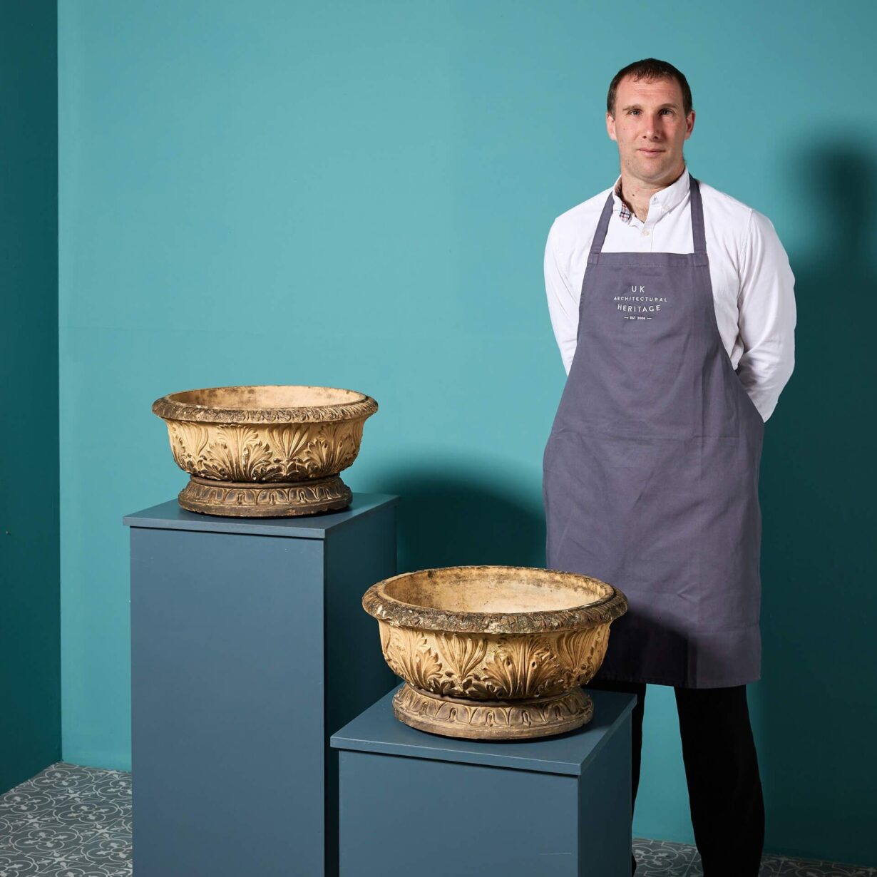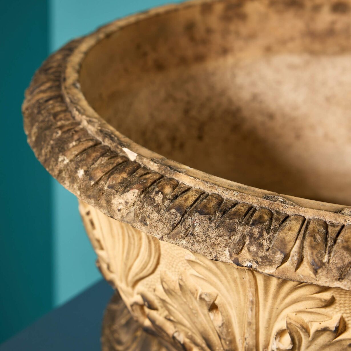 Inspired by period Georgian styling, these antique planters are each decorated with neoclassical acanthus leaves to the body above a turned rim and separate base. Their shallow nature makes them a smart addition to outdoor spaces of any period, perfect for planting with seasonal flowers or as standalone decorative bowl urns.