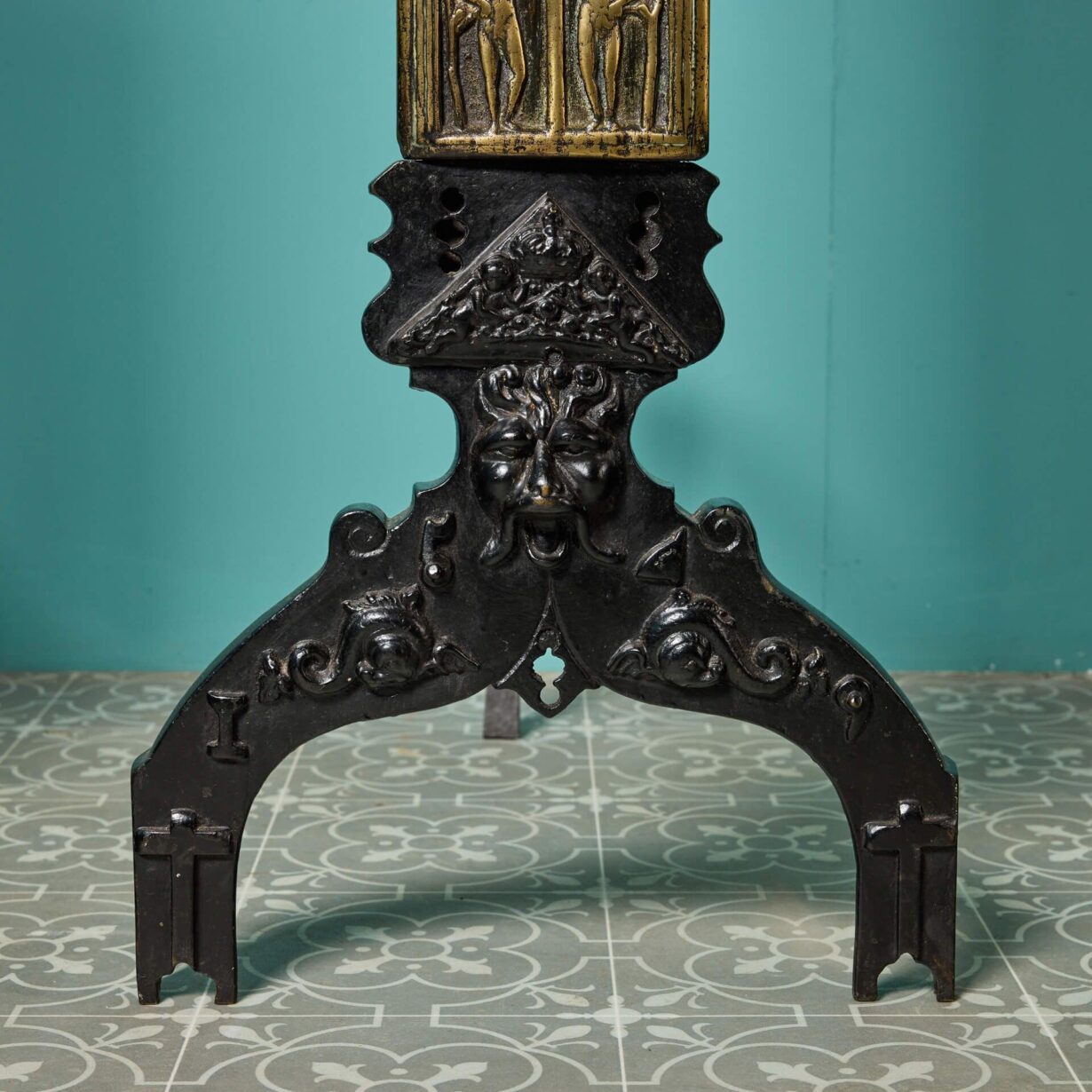 back to topA pair of antique fire dogs depicting religious scenes, dating to circa 1860. Their shining bronze large scale panels, of Baroque style, are constructed to iron, which would allow them to stand proud next to a fireplace; perhaps in the main room of a country or period property.