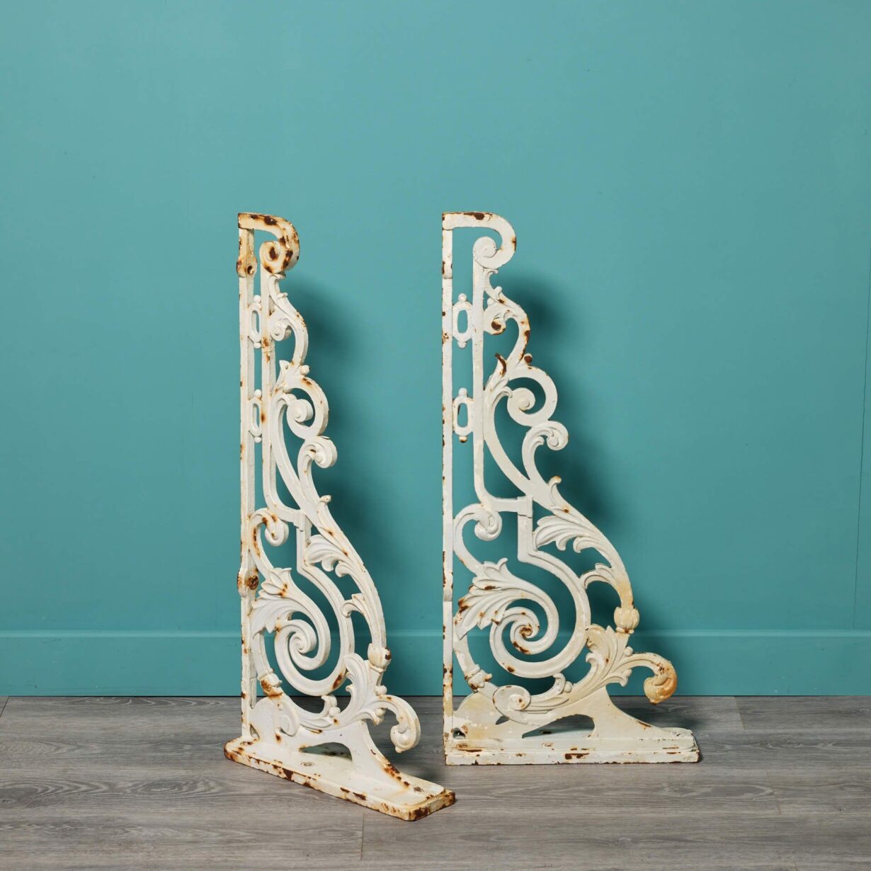 back to topA pair of antique late 19th century Victorian cast iron wall brackets with thickly cast elements, suitable for interior or exterior use. The intricate scrolling foliage design showcases fine metalwork, making these a stunning pair for use as supporting brackets in a period property, perhaps for a balcony or console. Their nicely weathered finish only adds to their elegant design.