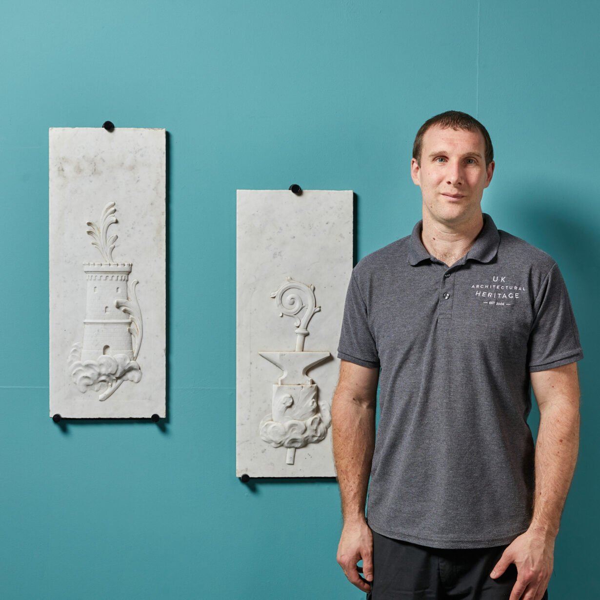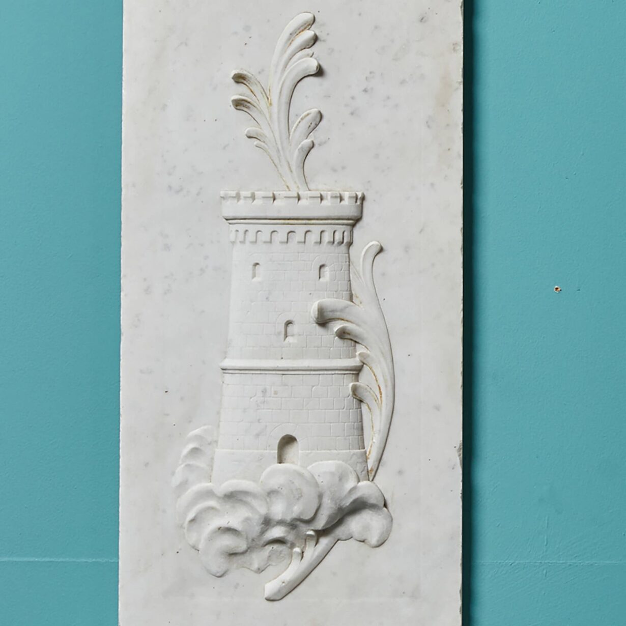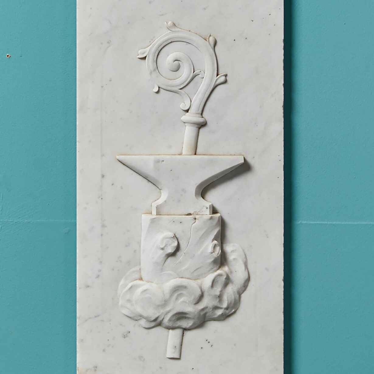 back to topPair of Carved Carrara Marble Wall Plaques. A pair of finely carved English marble panels. One depicting a tower entwined with foliage. The second depicting A blacksmiths anvil and crosier (known as the pastoral staff). Carved into finely grained Italian Carrara Marble. Reclaimed from a house in the Cotswolds.