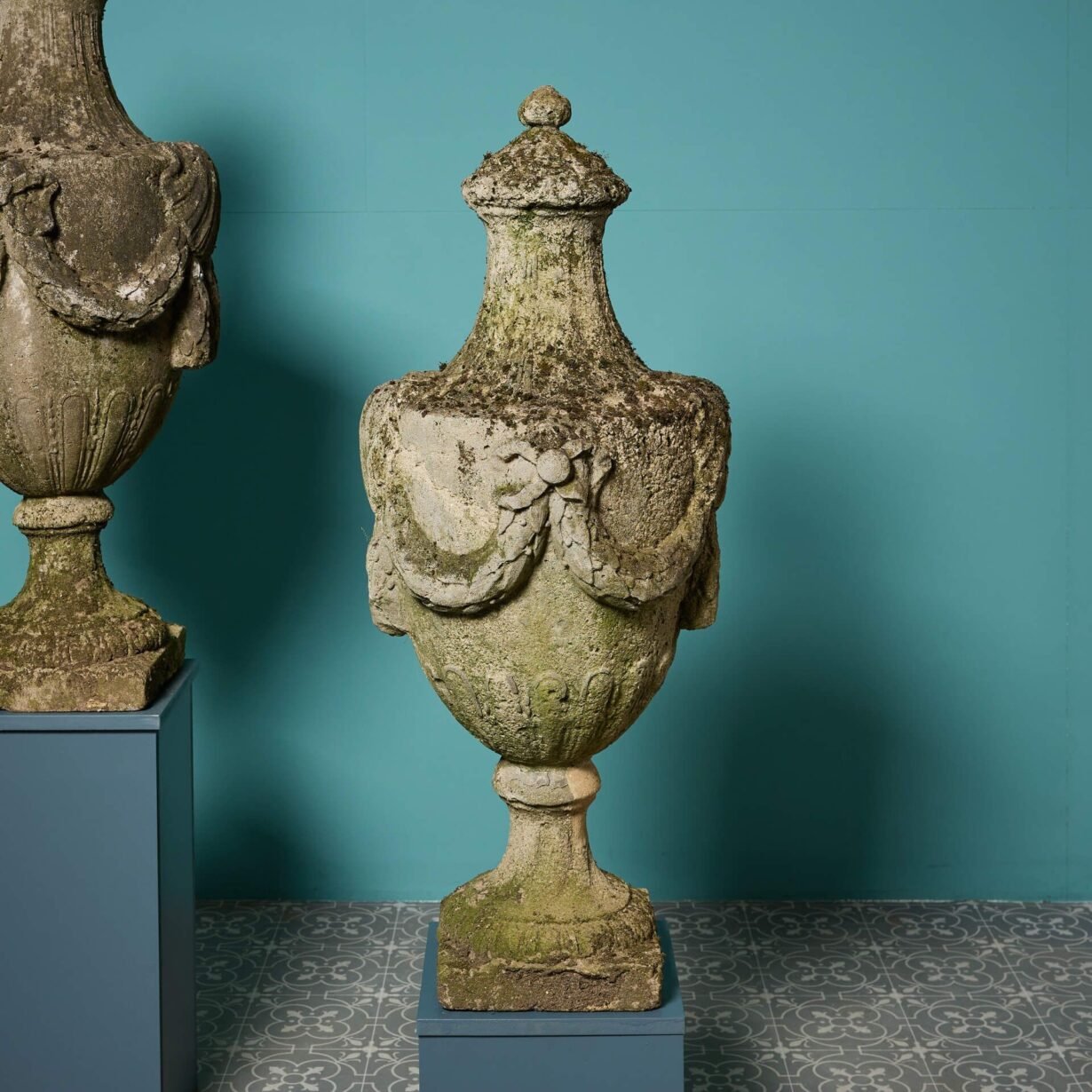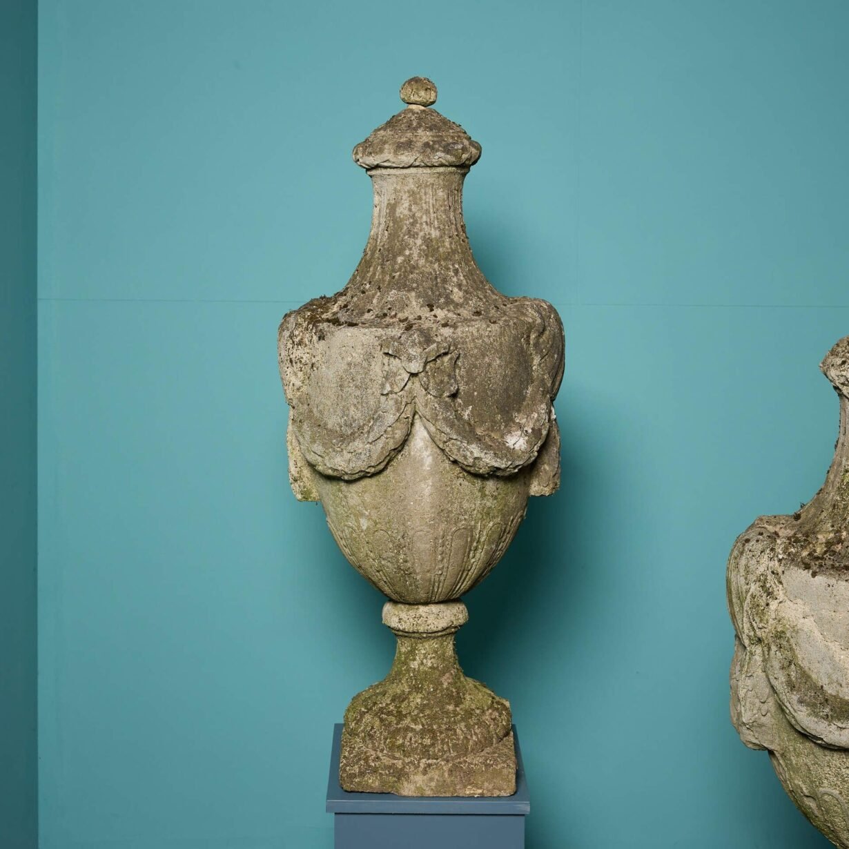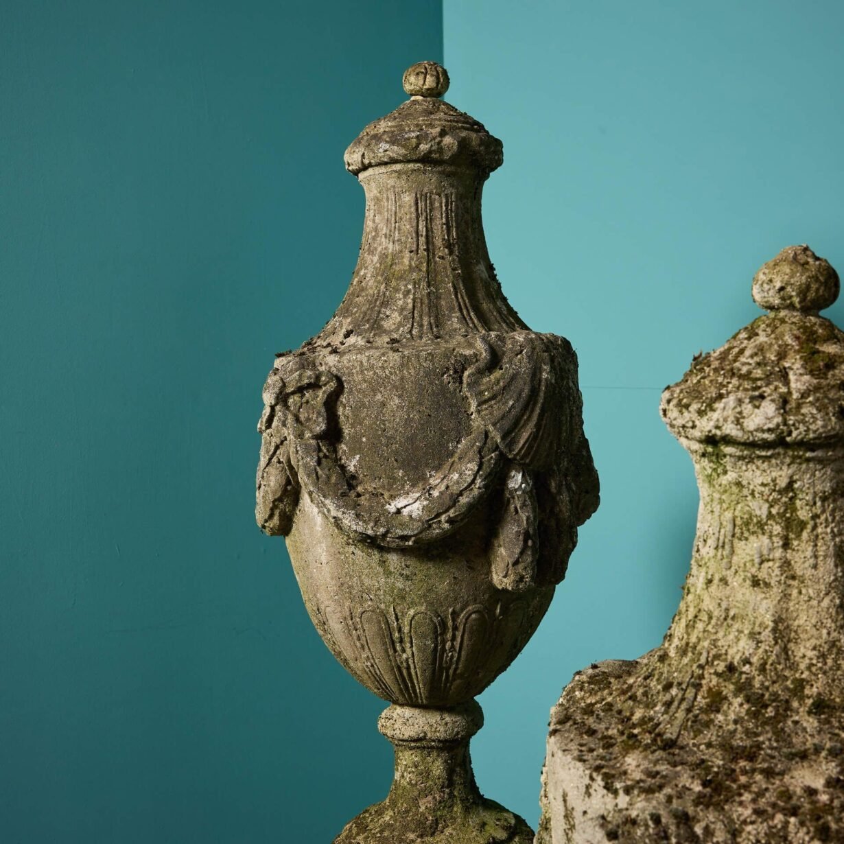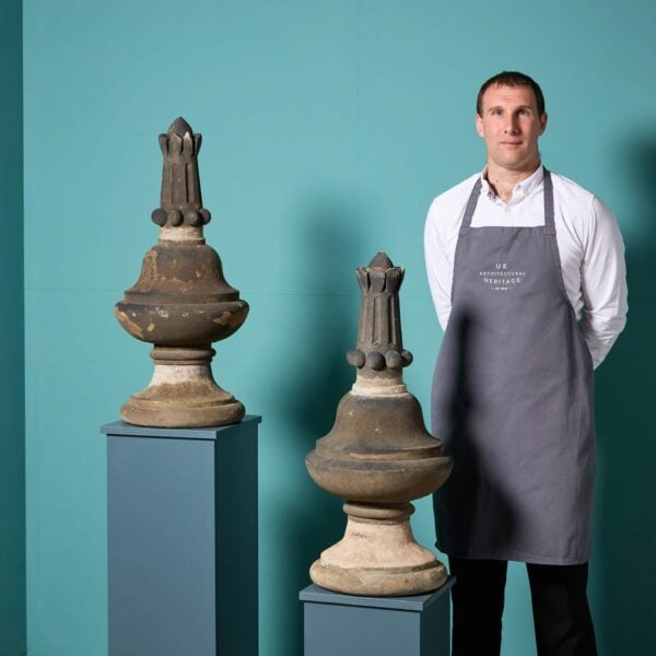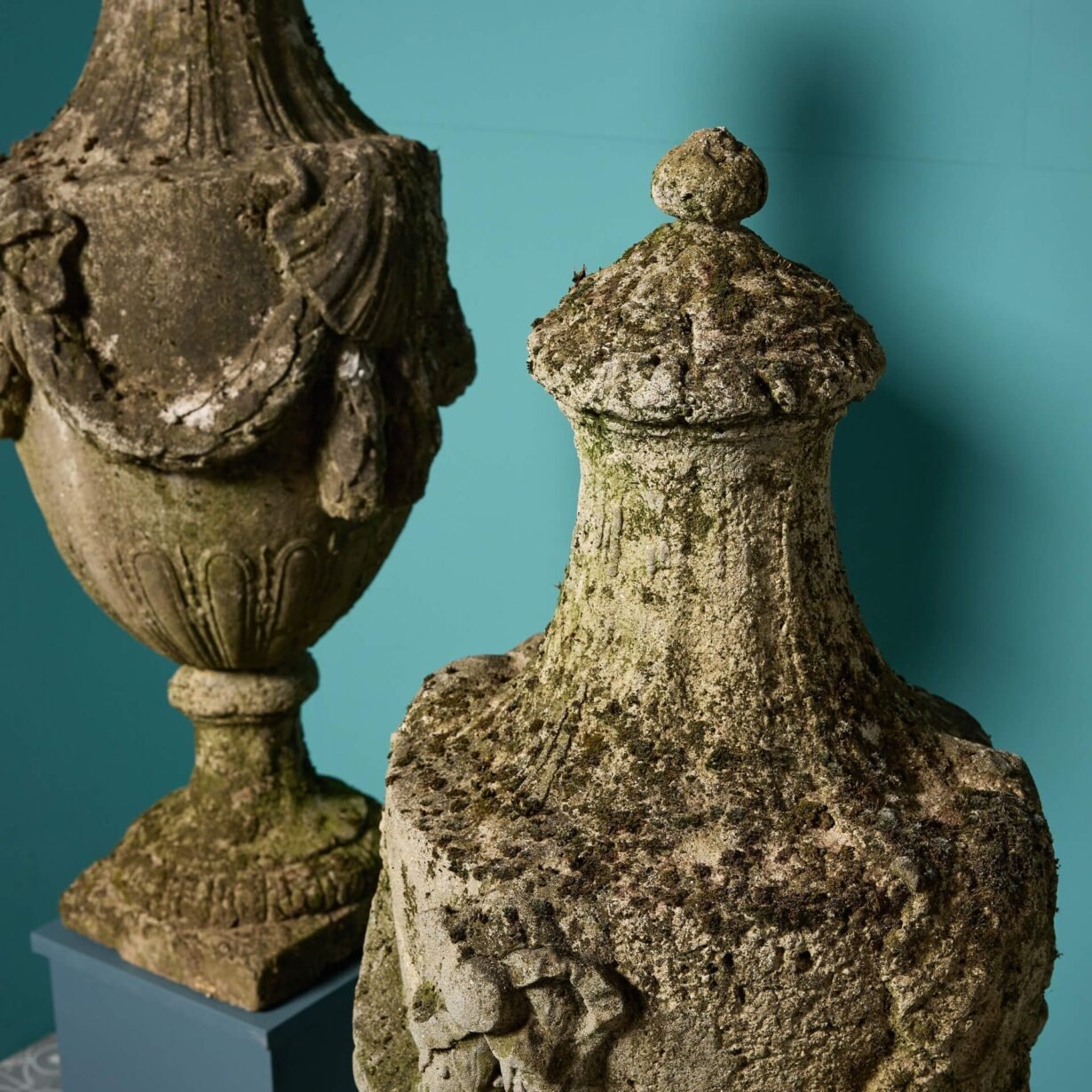 Beneath the characterful weathered surface of each large scale finial is Coade stone, with an impressive drapery details, decorated rounded socle and square base.