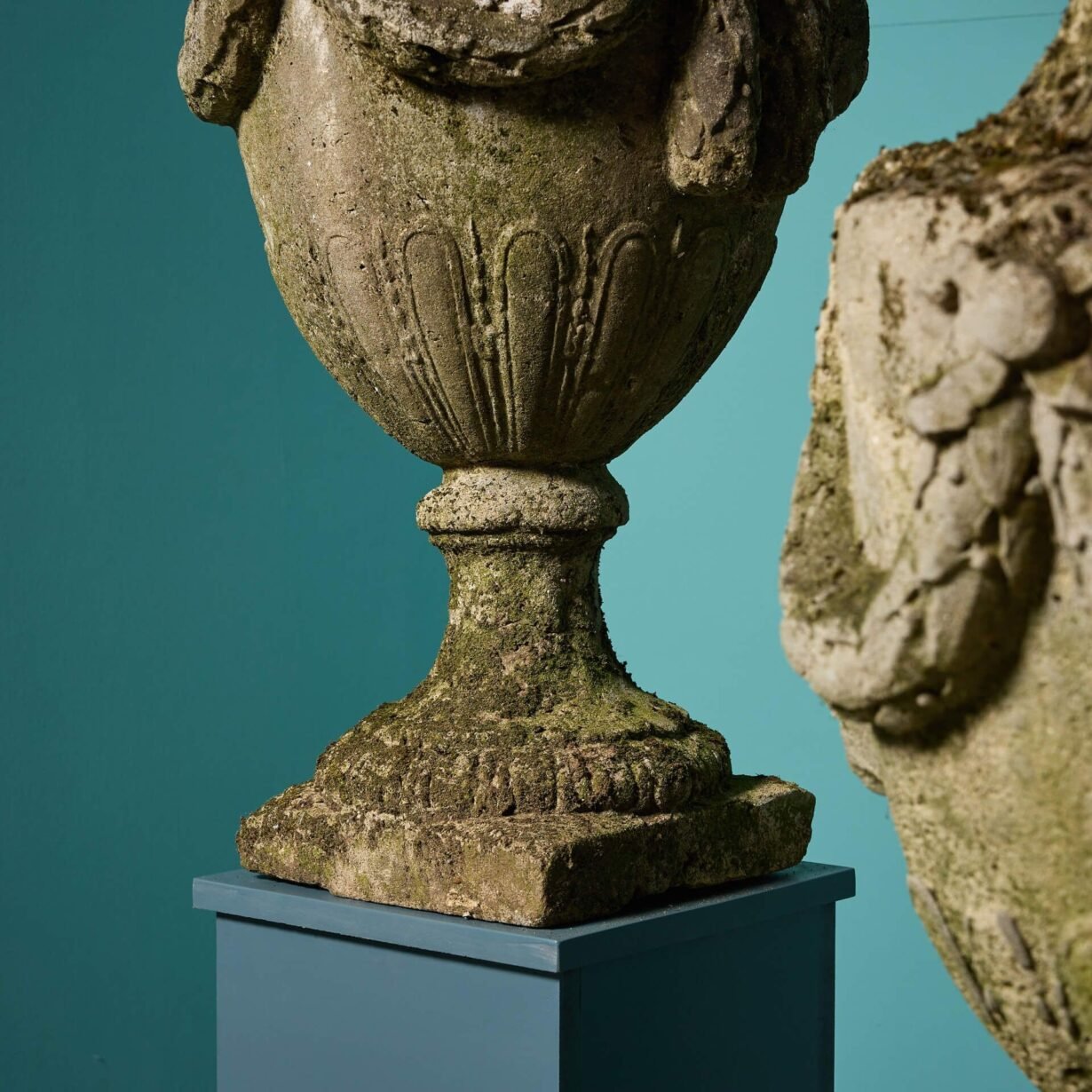 These urns have a desirable weathered look only achieved after exposure to the elements over many years. You can just imagine them adding charm to a handsome garden or courtyard of a period property.