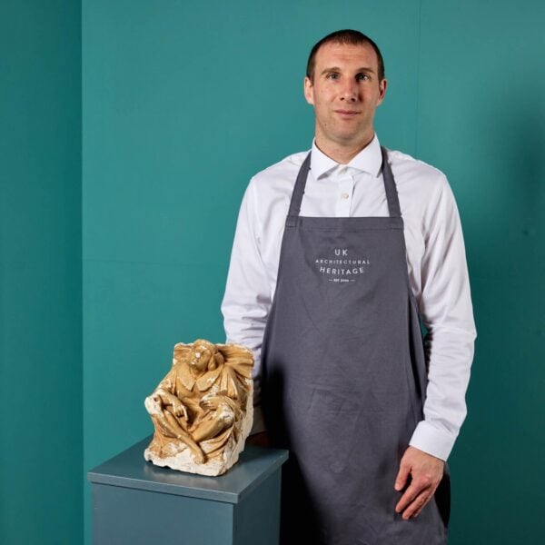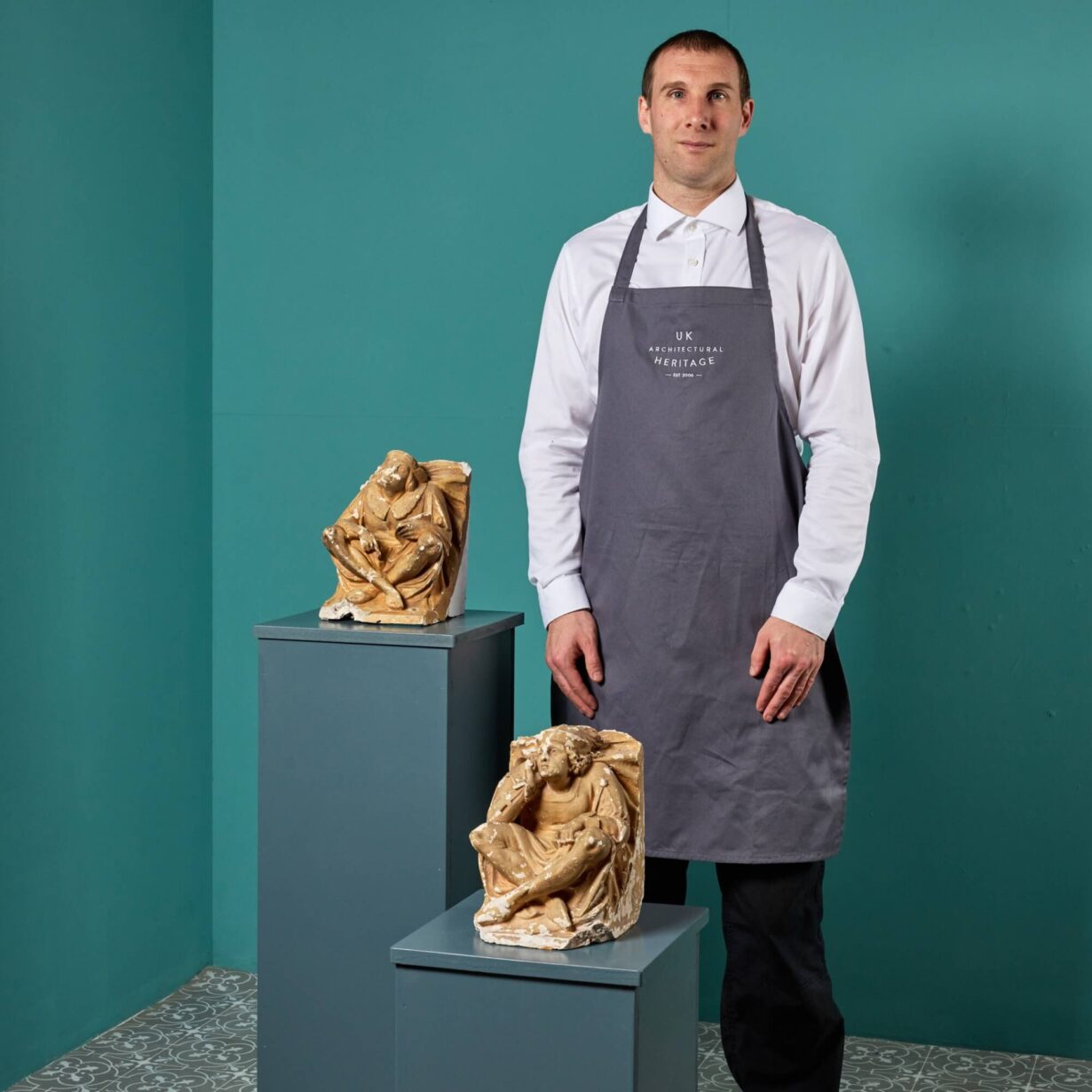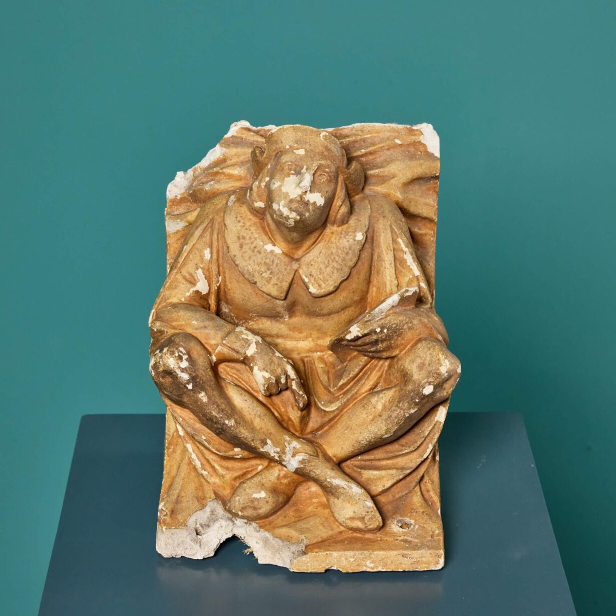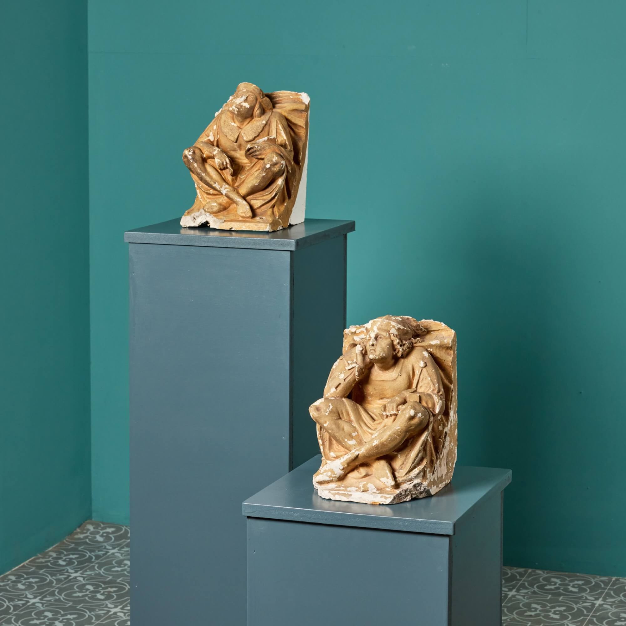back to topDating from the 1870s, these decorative antique corbel figures were once used to embellish a ceiling, perhaps of a prestigious Victorian banqueting hall. Due to their age, they are today more suited to interior decoration as objects of interest steeped in history for a display cabinet or live-in museum. Each has a distinctly mock medieval look, depicting a moulded figure sat cross-legged and wearing a Tudor style cap. One sits in a contemplating position, resting on their right arm and holding what appears to be a mallet in their left hand. The other wears a large, embellished collar and holds what looks like a paint palette or book in their left hand. There are various chips, losses and a distressed paint finish that tell the story of these charmingly decorative architectural antiques.