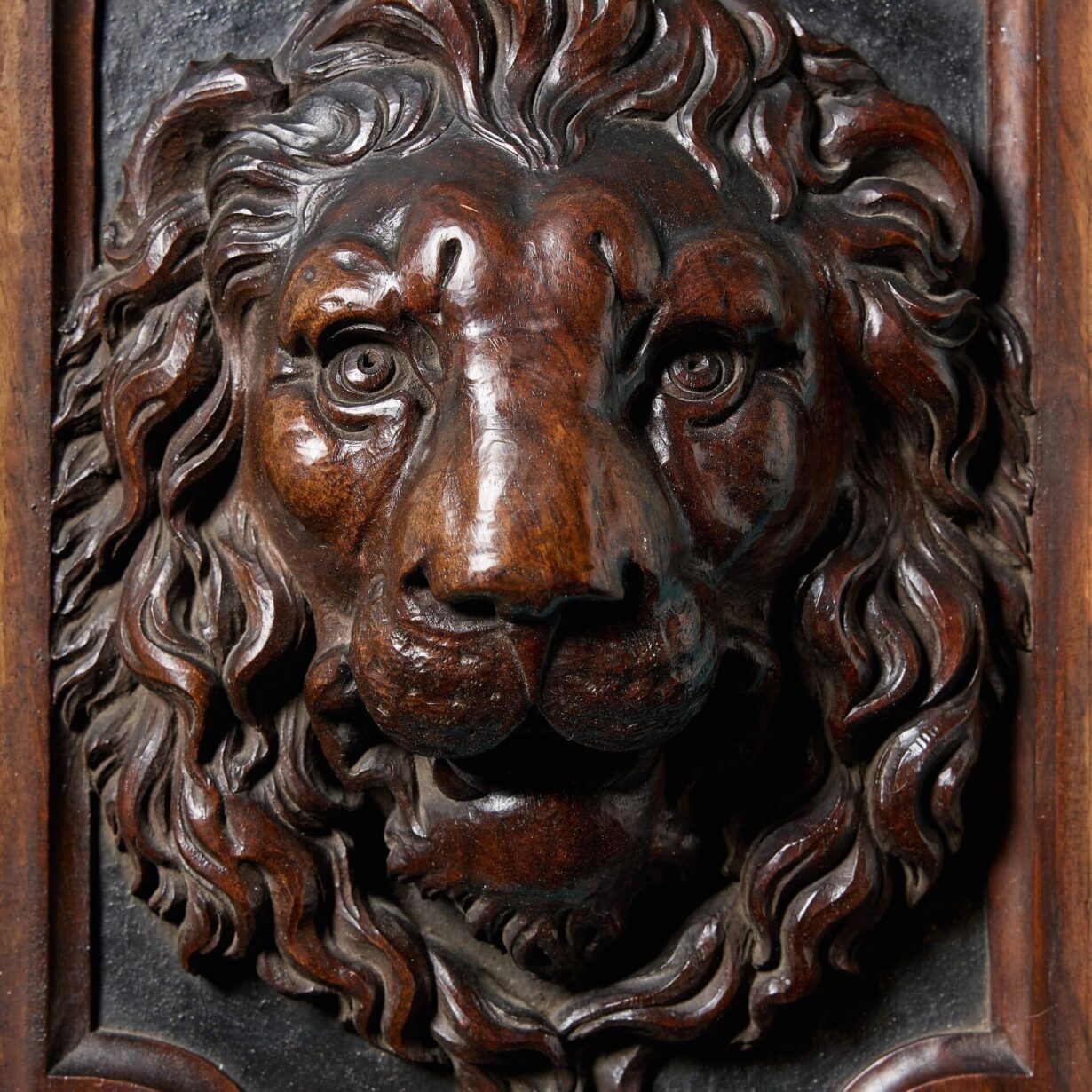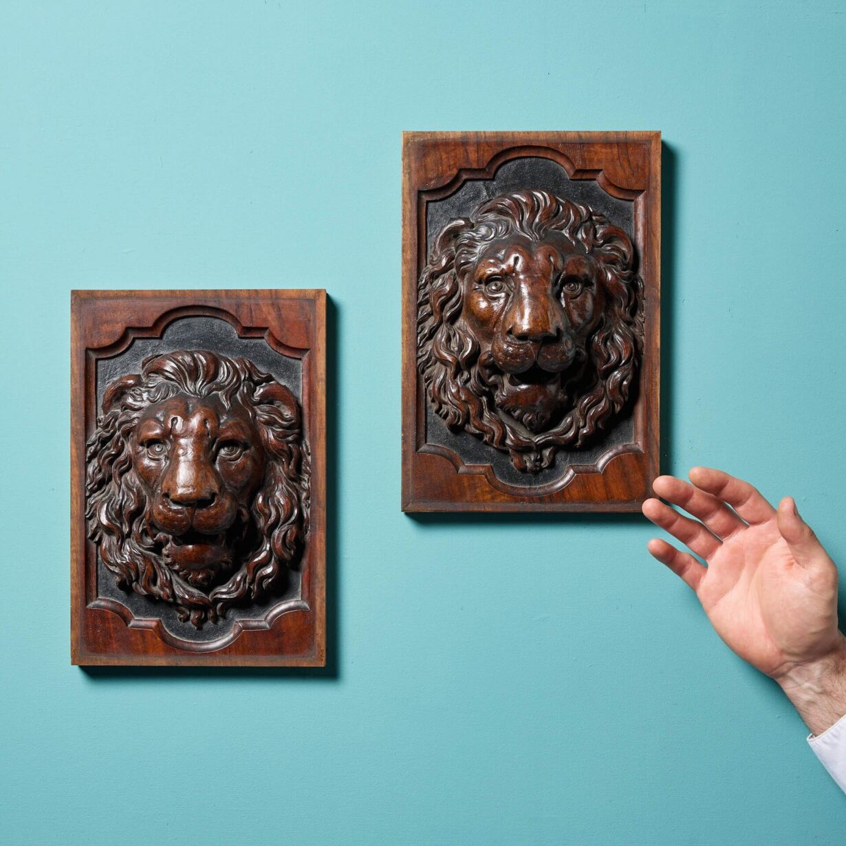 back to topA handsome and beautifully carved pair of matching English antique lion panels, circa 1870. Each walnut panel depicts the mask of a commanding lion, very deeply carved in relief with abundant, flowing manes and teeth bared. Place either side of a doorway to create a dramatic entrance or style together on an empty interior wall to add unique style to an interior.