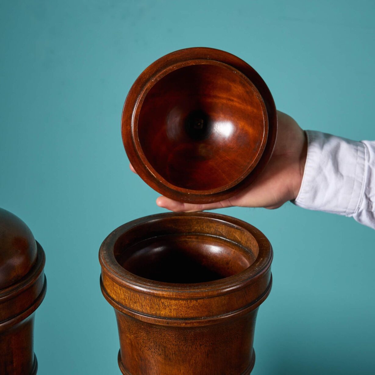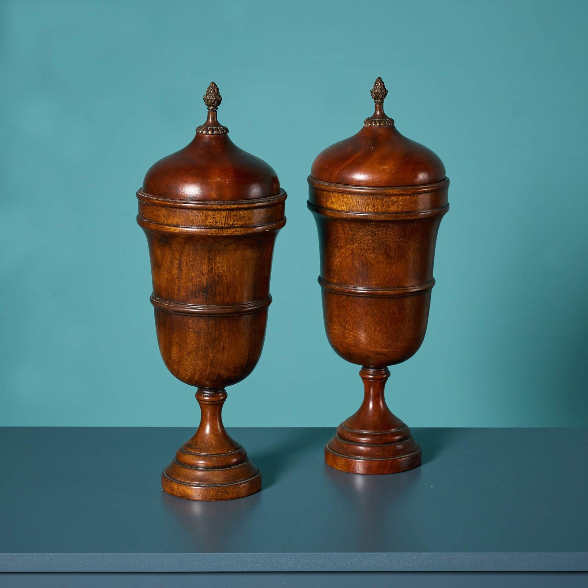 The wooden lidded finials on circular turned bases are complimented by acorn shaped tops.