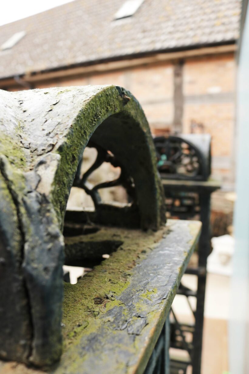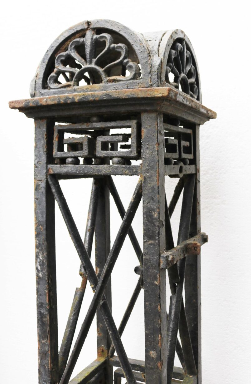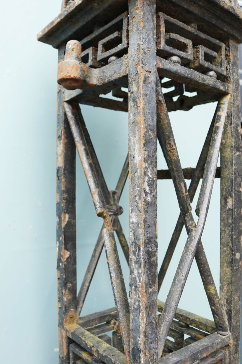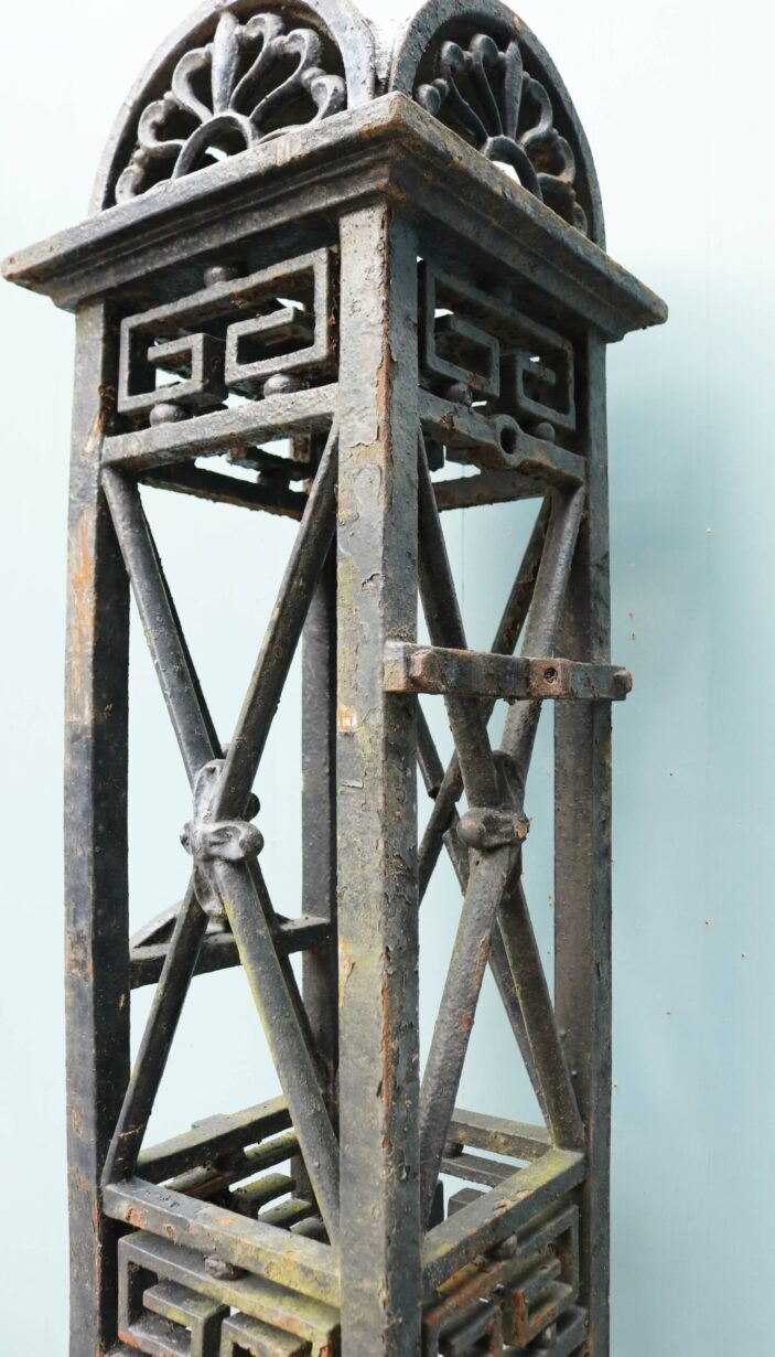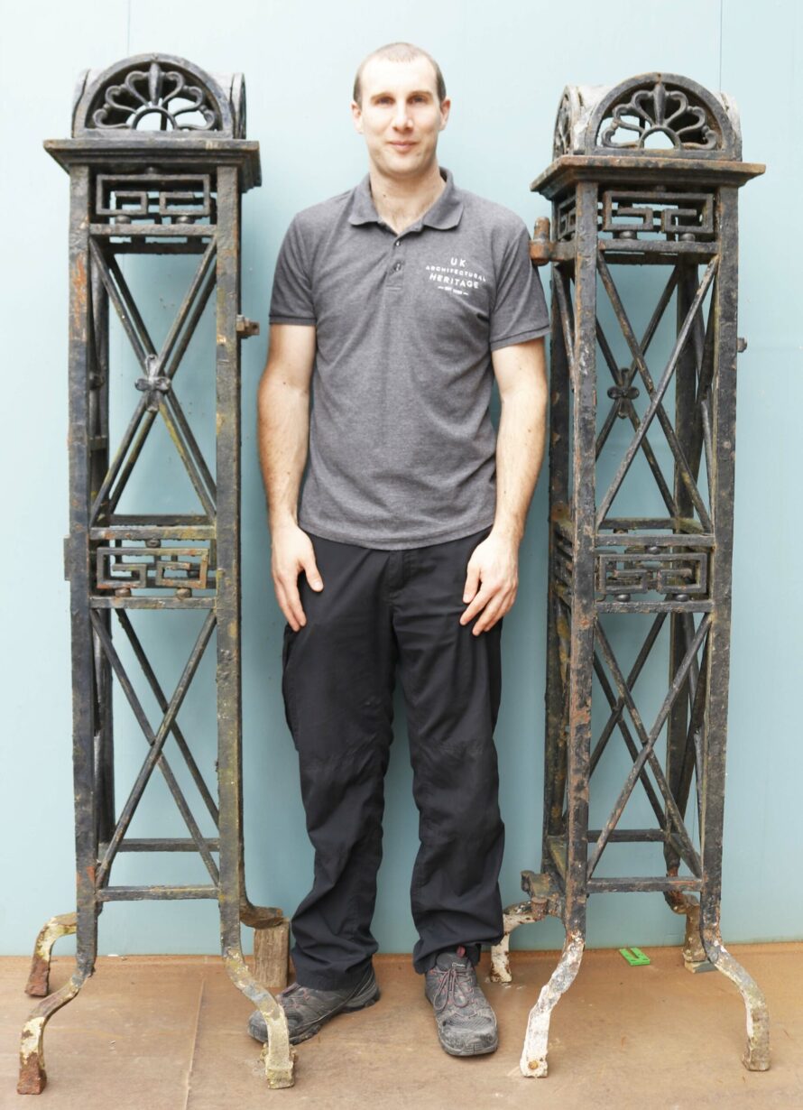 Good structural condition. There are some traces of old and worn flakey paint and minor surface rust. There are various small losses as pictured. One post has part of the foot missing. They will need to be set approximately 20cm deep into the ground. Both of the posts are missing a piece of decorative iron work at the top.