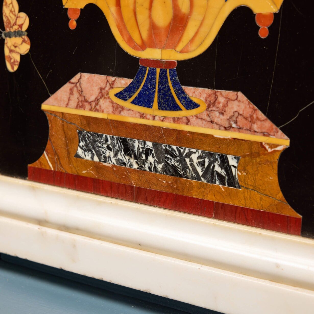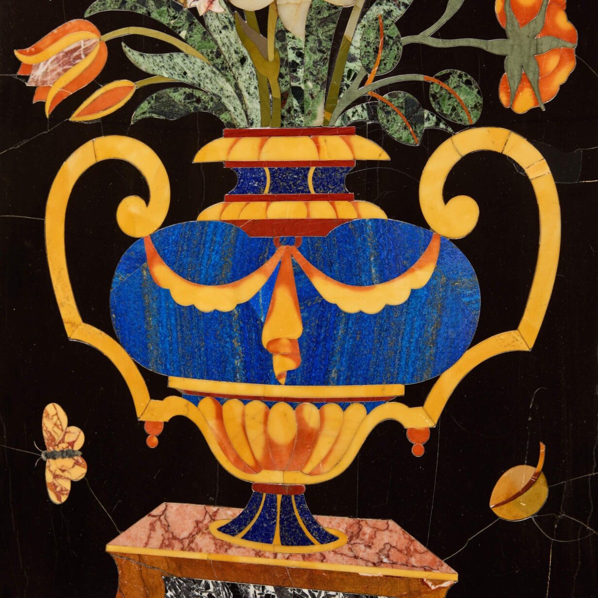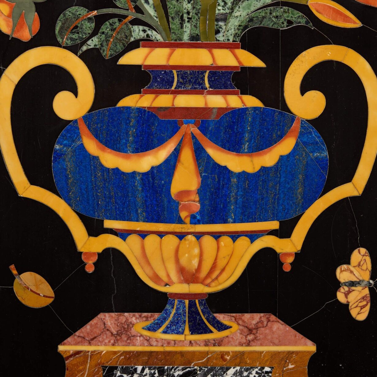 back to topAn outstanding pair of large 19th century antique pietra dura panels after the Italian Corbarelli workshops. Each highly decorative panel is exceptionally made, depicting twin handled floral filled vases formed using precise inlays of various marbles and semi-precious stones. These include lapis lazuli, agate, verde antico and Siena, specially chosen for their natural variations in colour and tone. A black background draws attention to the striking vibrancy of the stones with each framed in white marble.