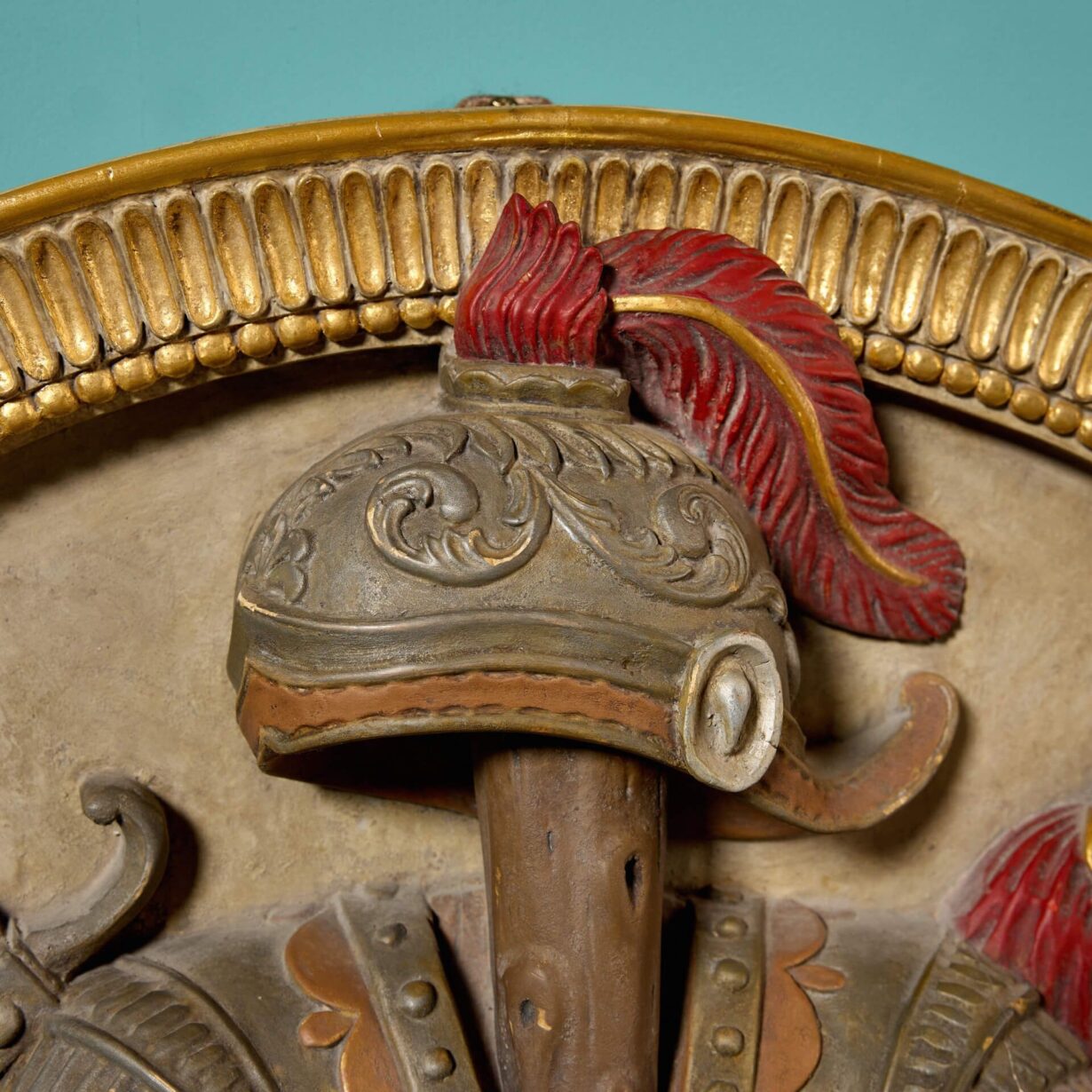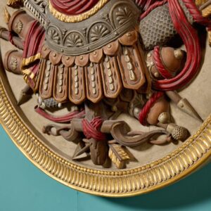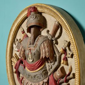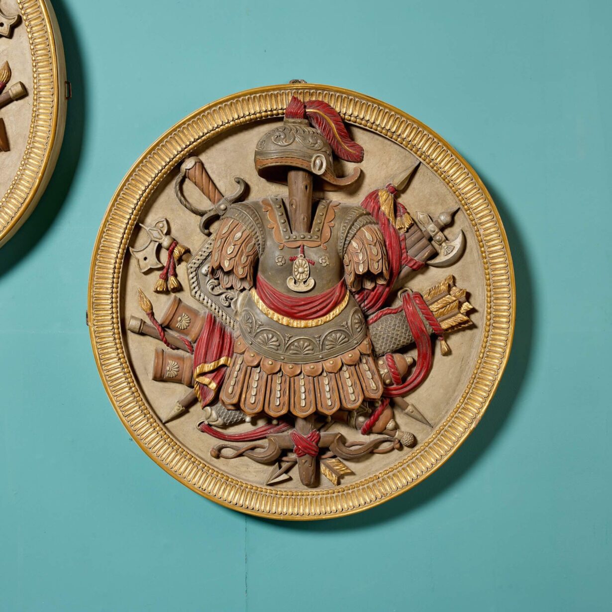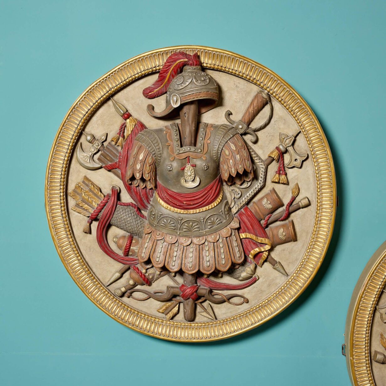 A handed pair, each roundel is superbly carved with depictions of Roman armour before weaponry including swords, axes, spears and a quiver of arrows. Enhanced with paint, the armour features traditional red tassels and ribbons, detailed with highlights of gilt, all framed by a reeded gilt cartouche for a final flourish of grandeur.
