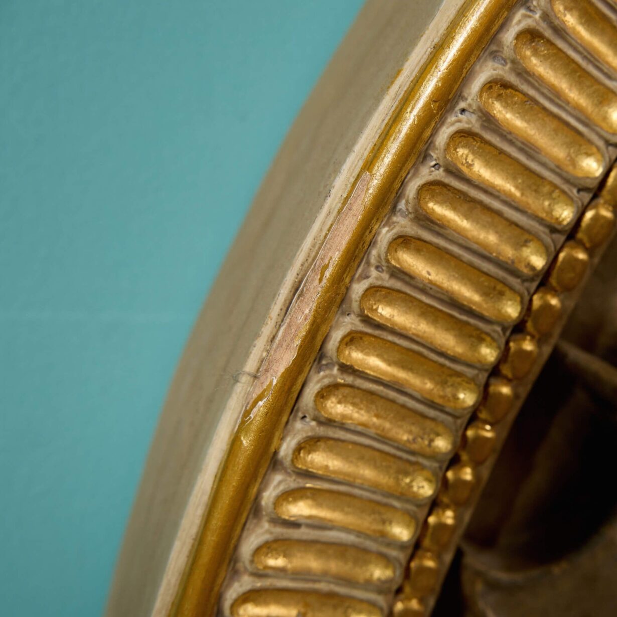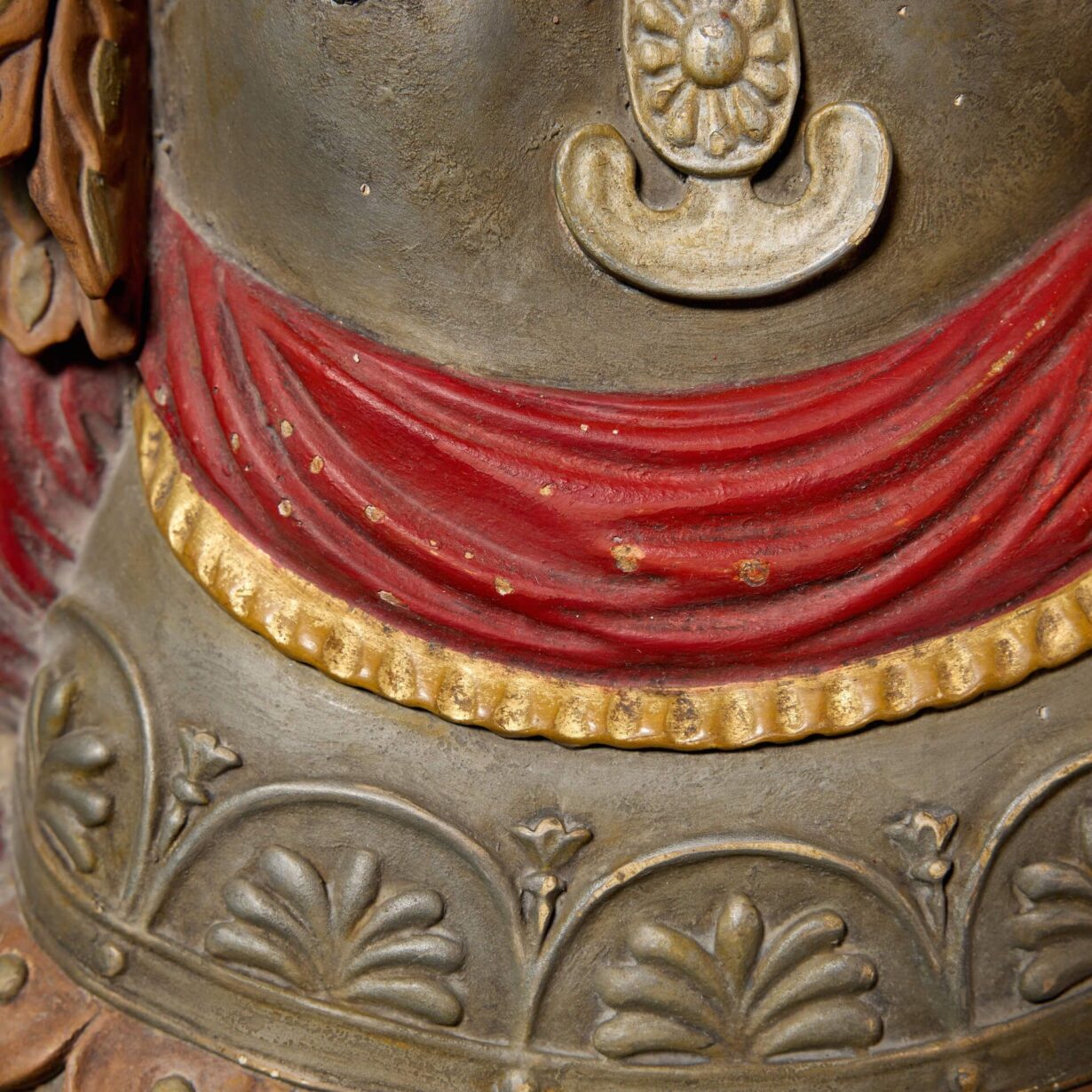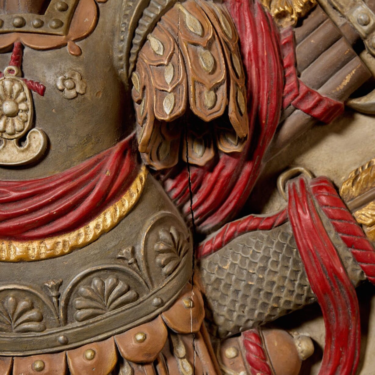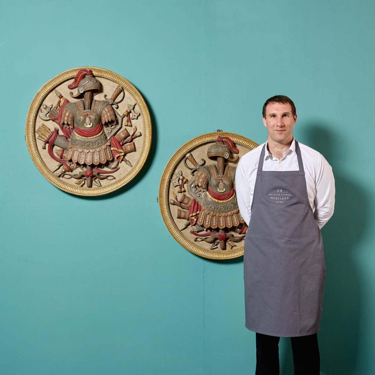 A handed pair, each roundel is superbly carved with depictions of Roman armour before weaponry including swords, axes, spears and a quiver of arrows. Enhanced with paint, the armour features traditional red tassels and ribbons, detailed with highlights of gilt, all framed by a reeded gilt cartouche for a final flourish of grandeur.
