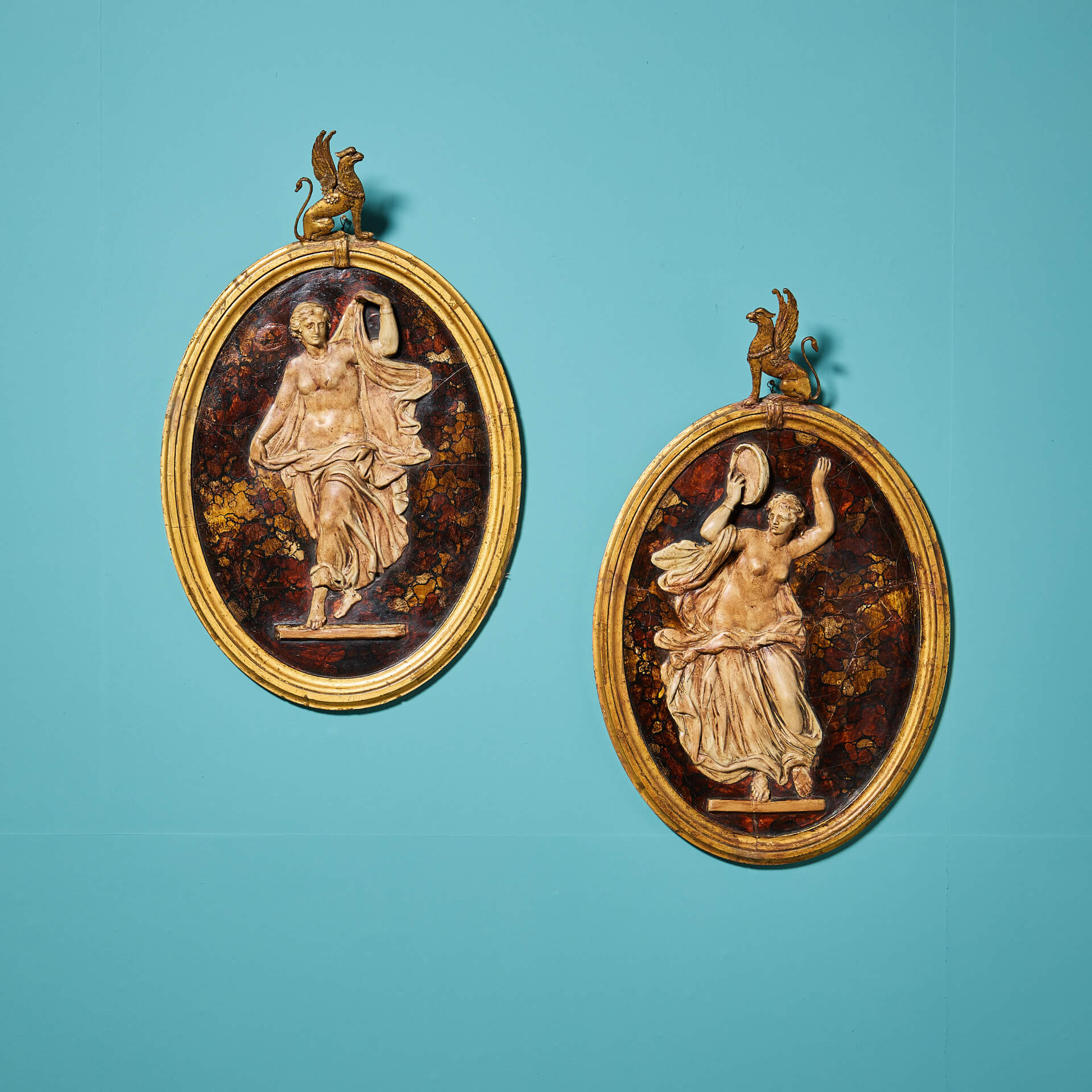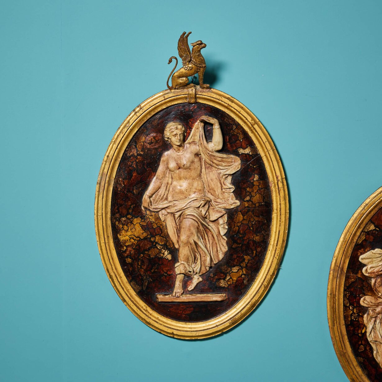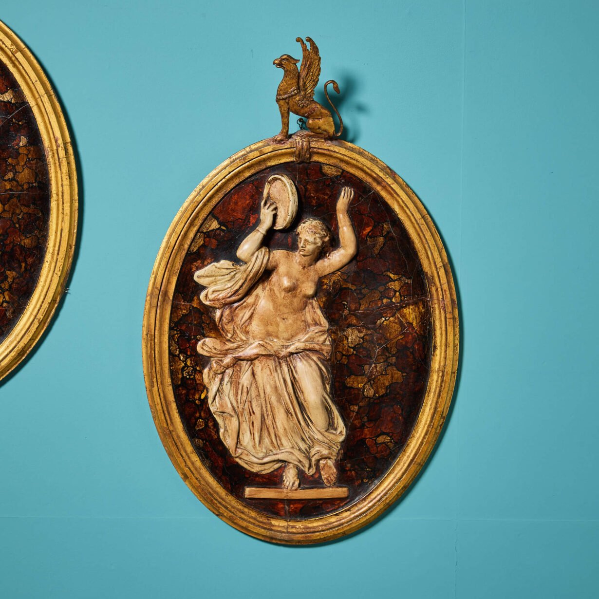 Highly decorative, these reclaimed plaster plaques each display a neoclassical figure – one holding swathes of drapery, the other with a tambourine raised above her head – before a simulated marble backdrop within a gilt frame with below a griffin.